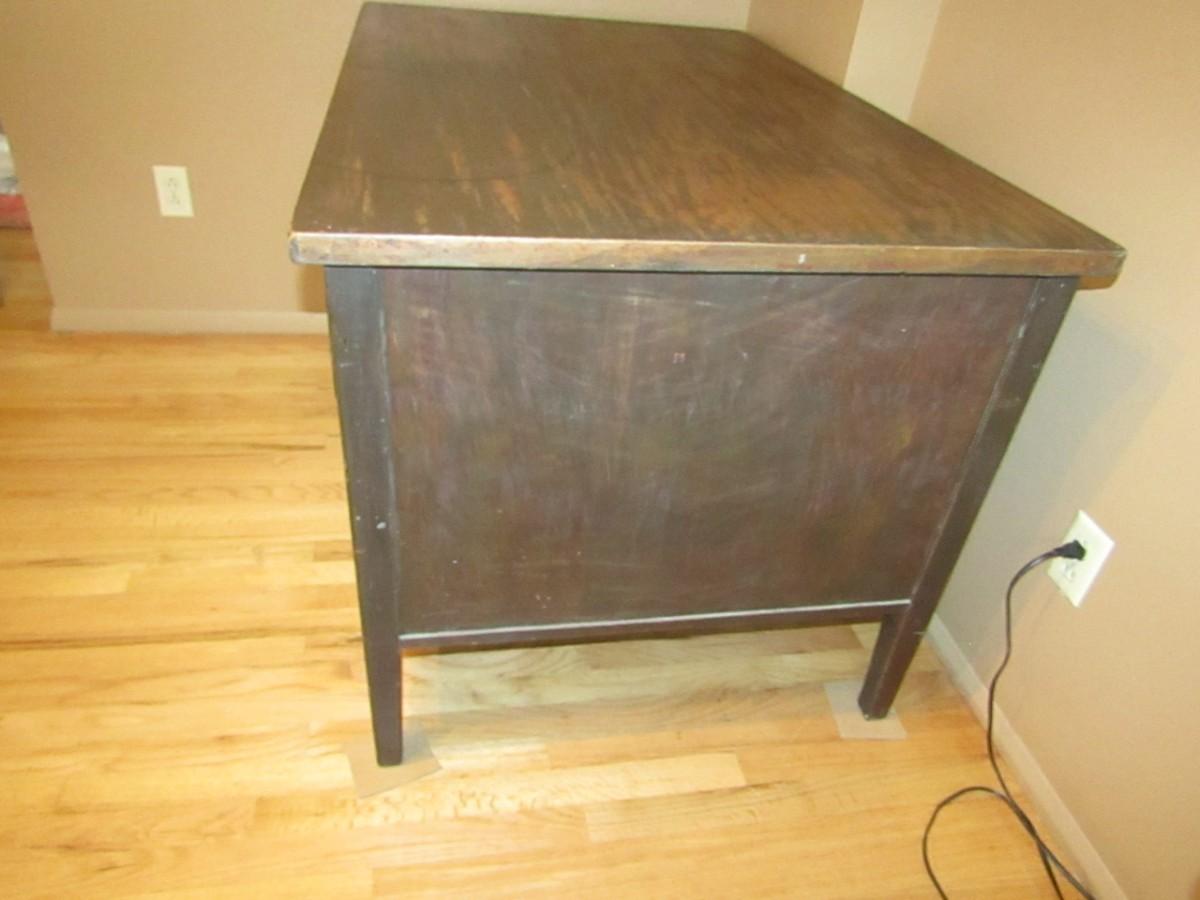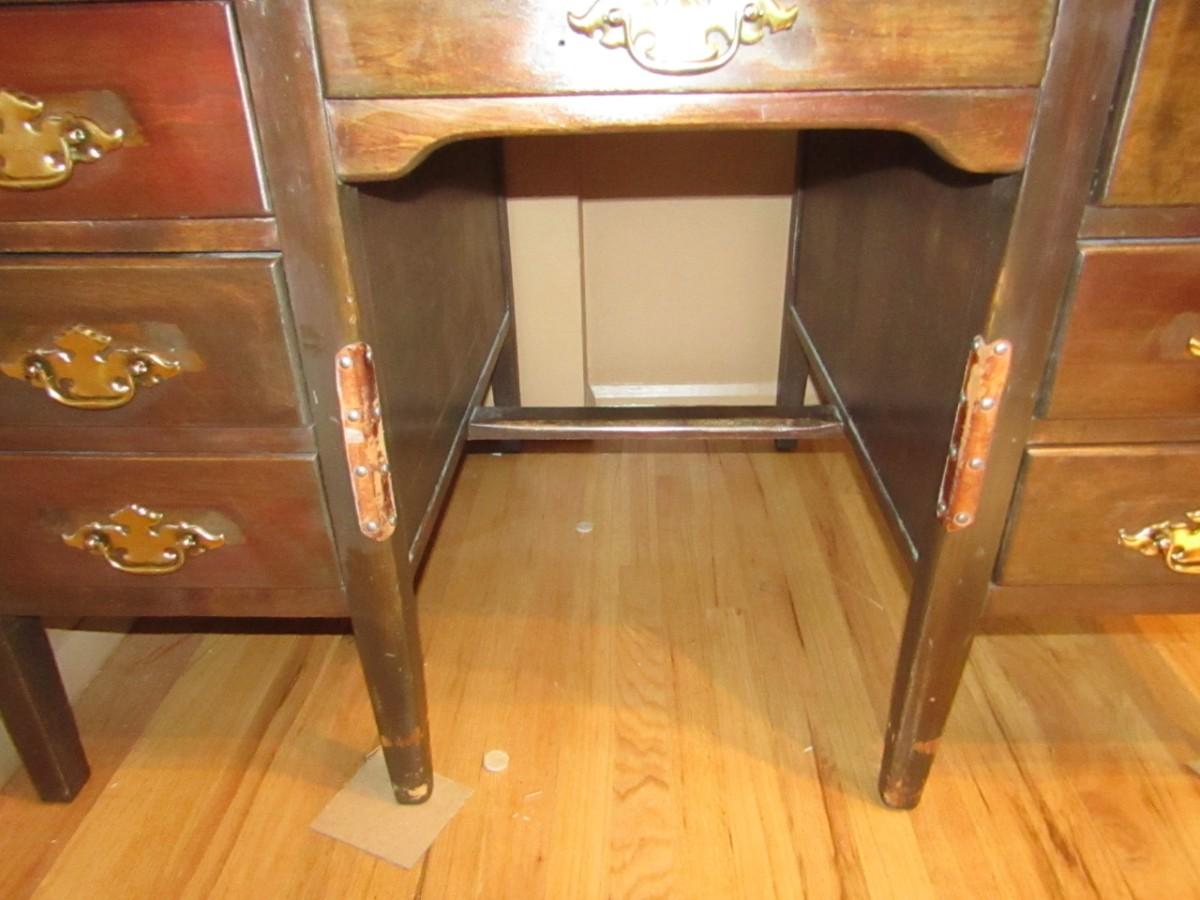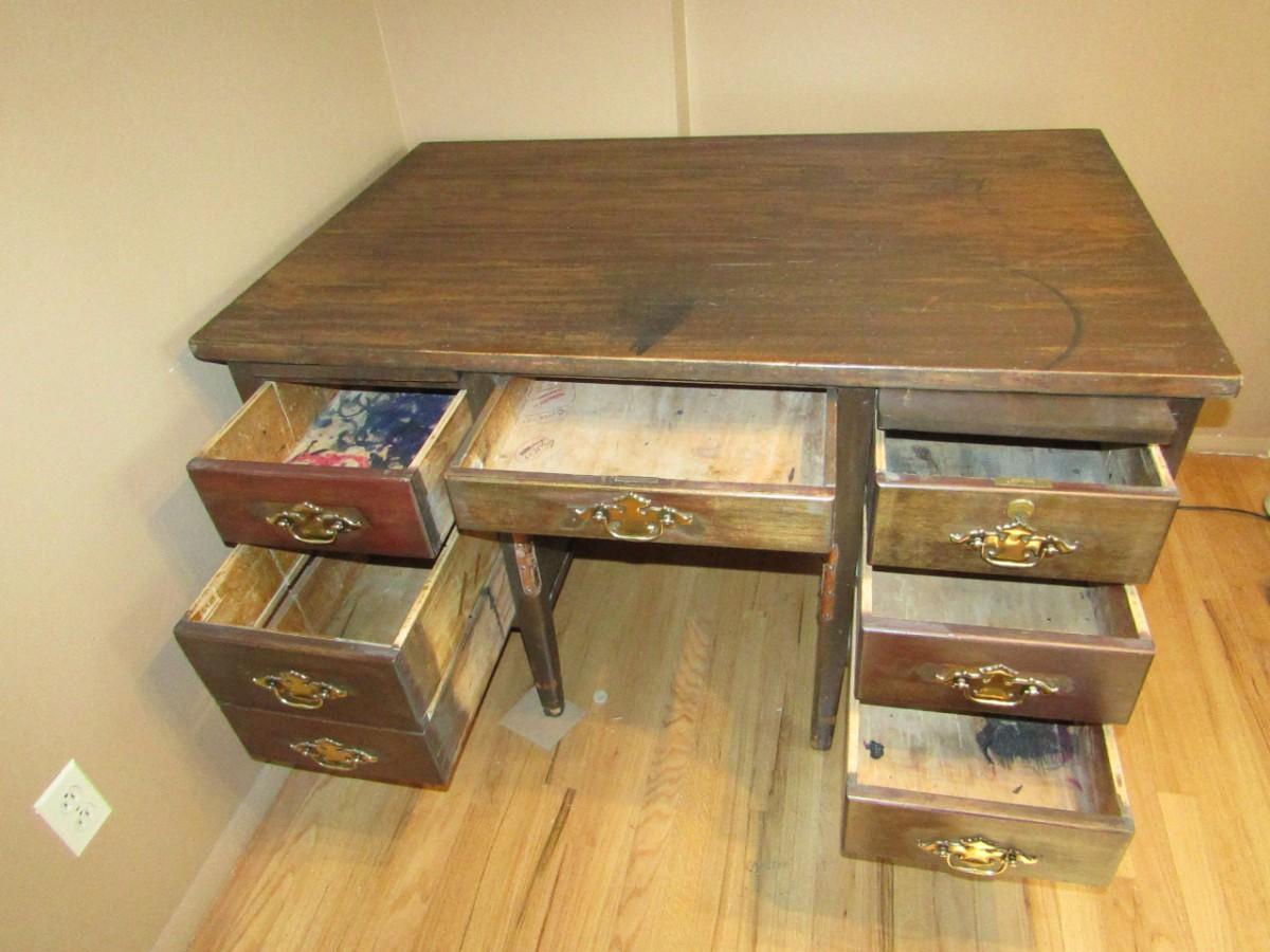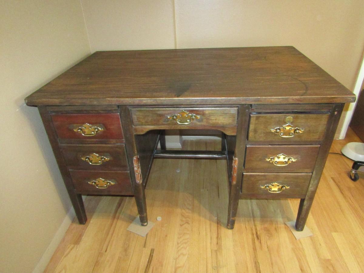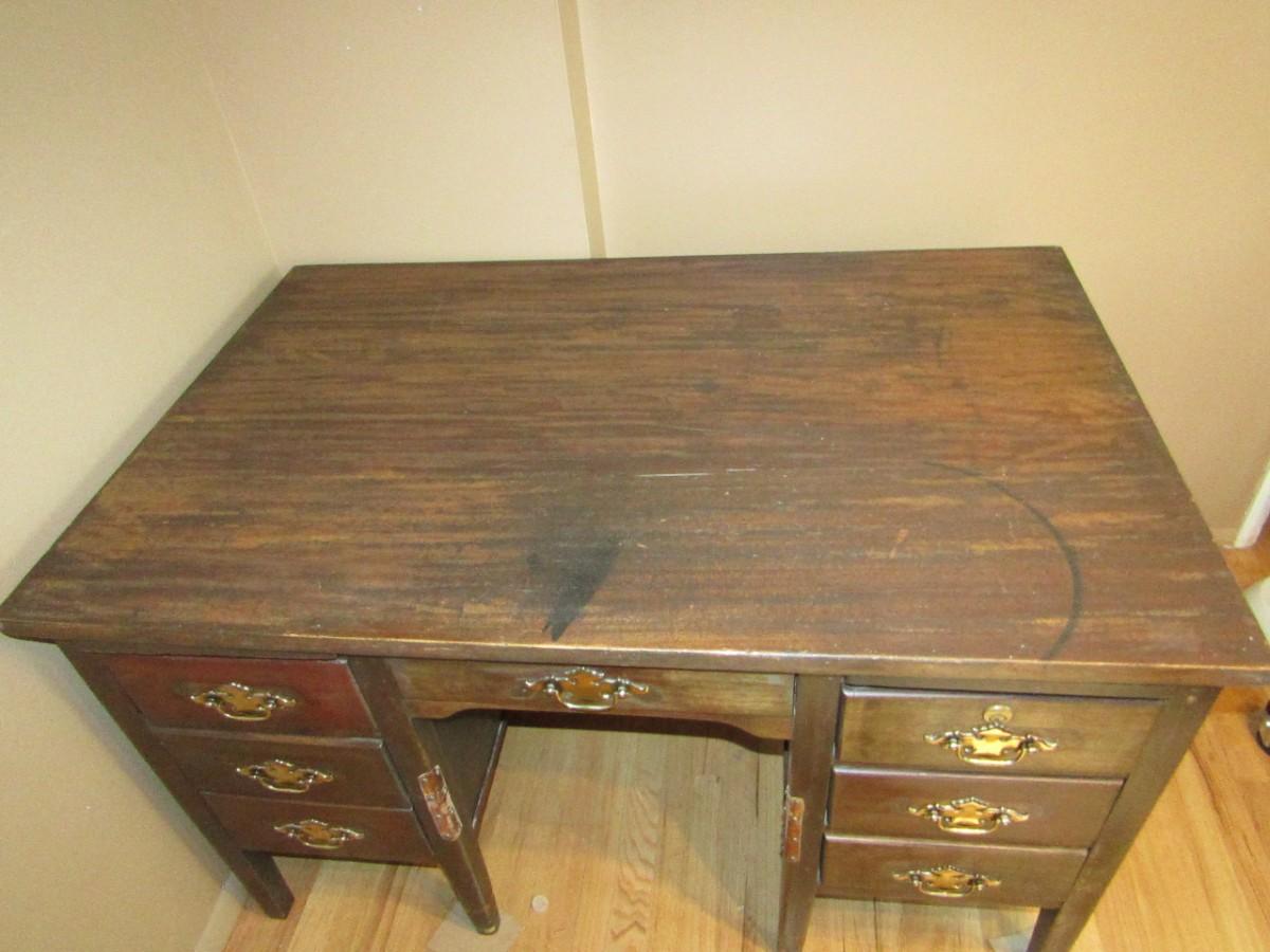 WOODEN DESK THAT MEASURES 50" X 32" X 31" IT HAS QUITE A BIT OF WEAR AND INK HAS SPILLED IN MOST OF THE DRAWERS BUT IT IS SOUND AND WOULD BE BEAUTIFUL IF REFINISHED OR NOT
