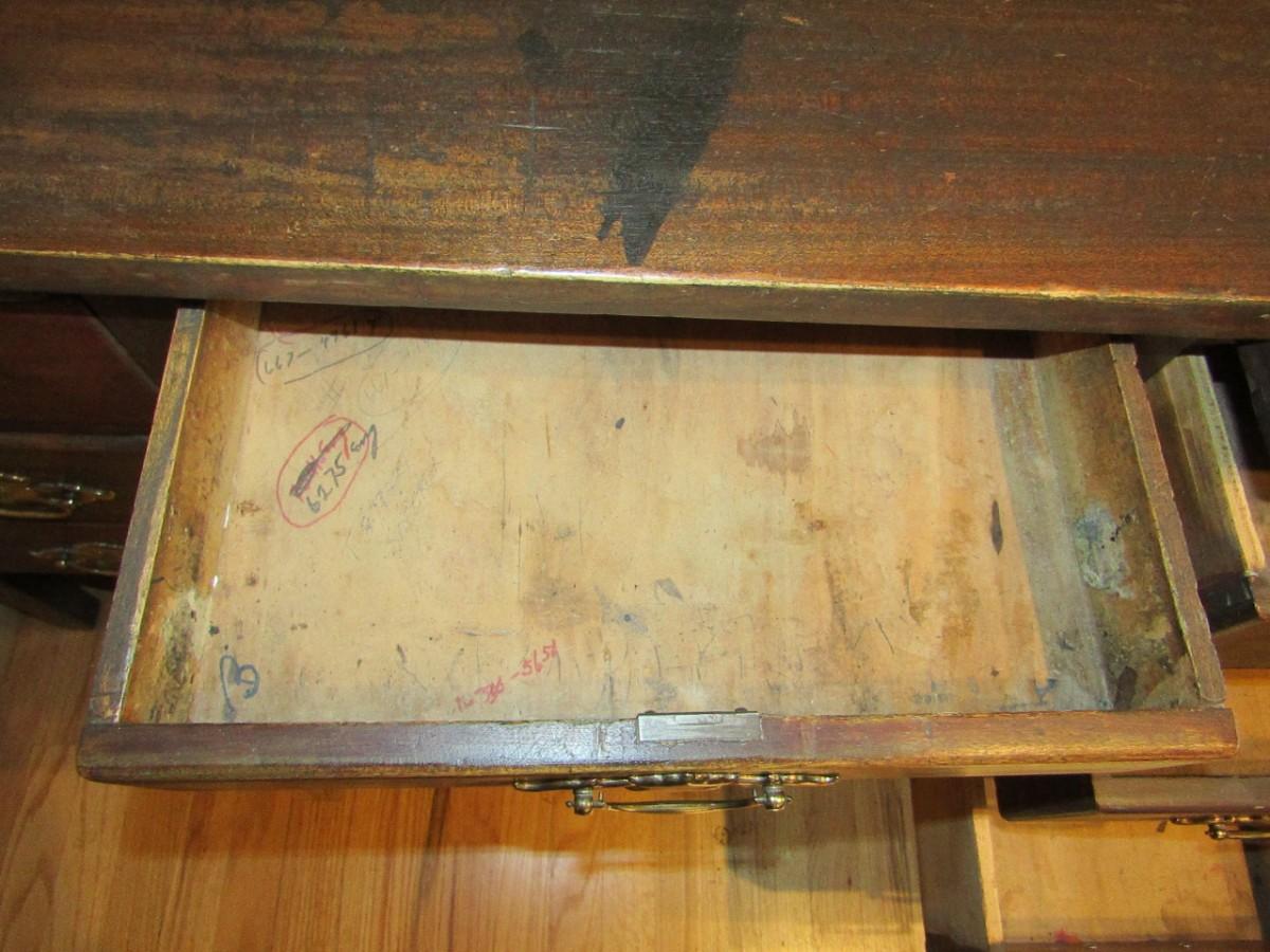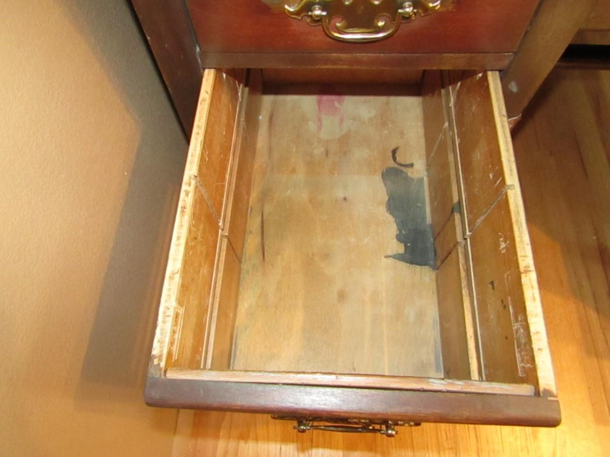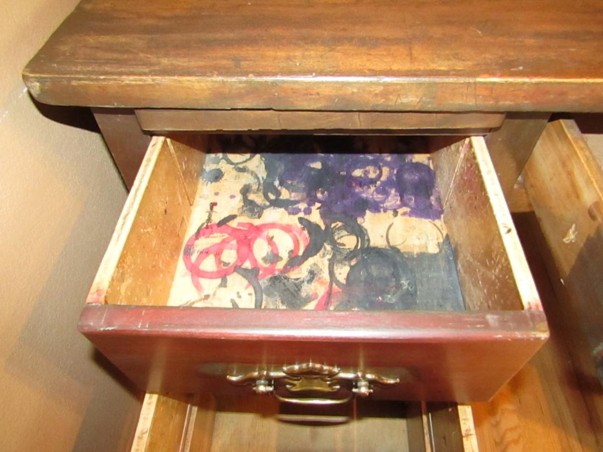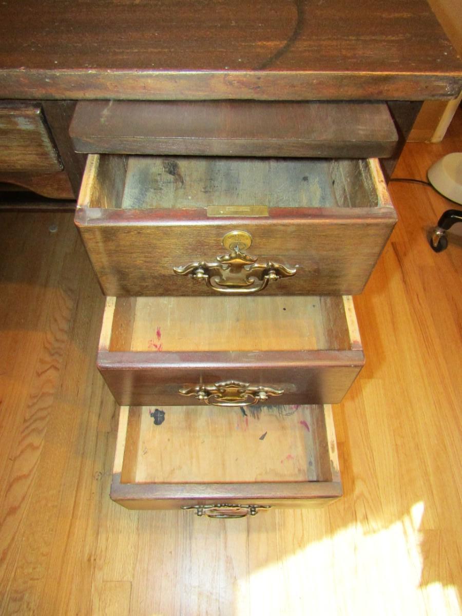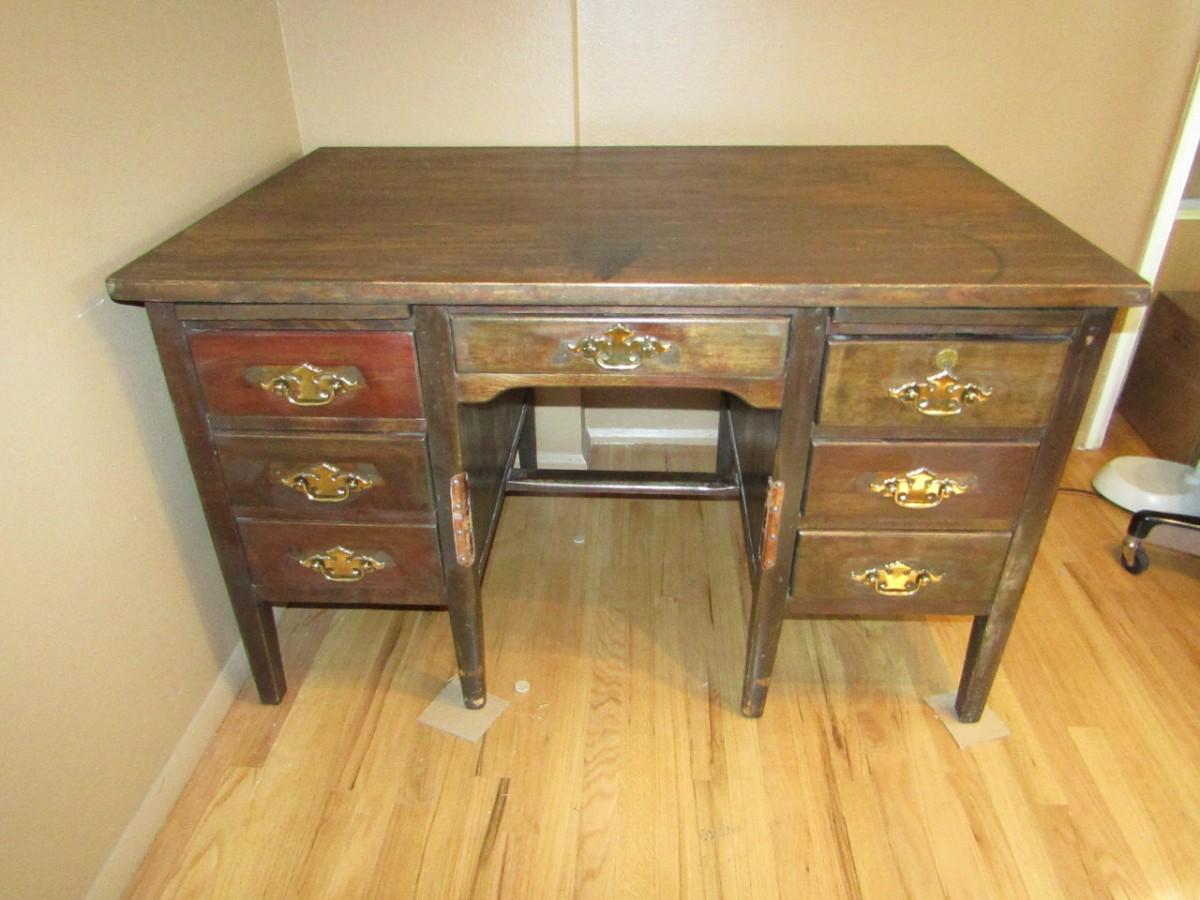WOODEN DESK THAT MEASURES 50" X 32" X 31" IT HAS QUITE A BIT OF WEAR AND INK HAS SPILLED IN MOST OF THE DRAWERS BUT IT IS SOUND AND WOULD BE BEAUTIFUL IF REFINISHED OR NOT