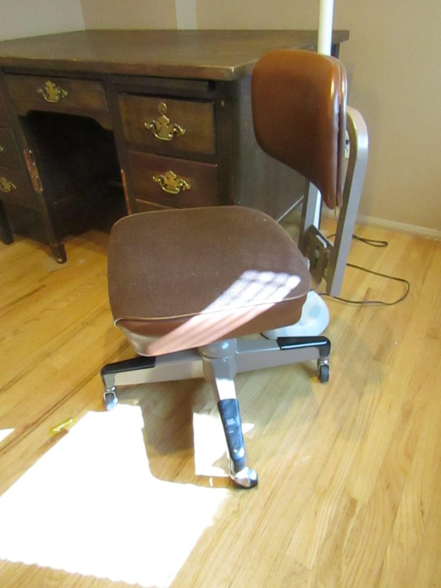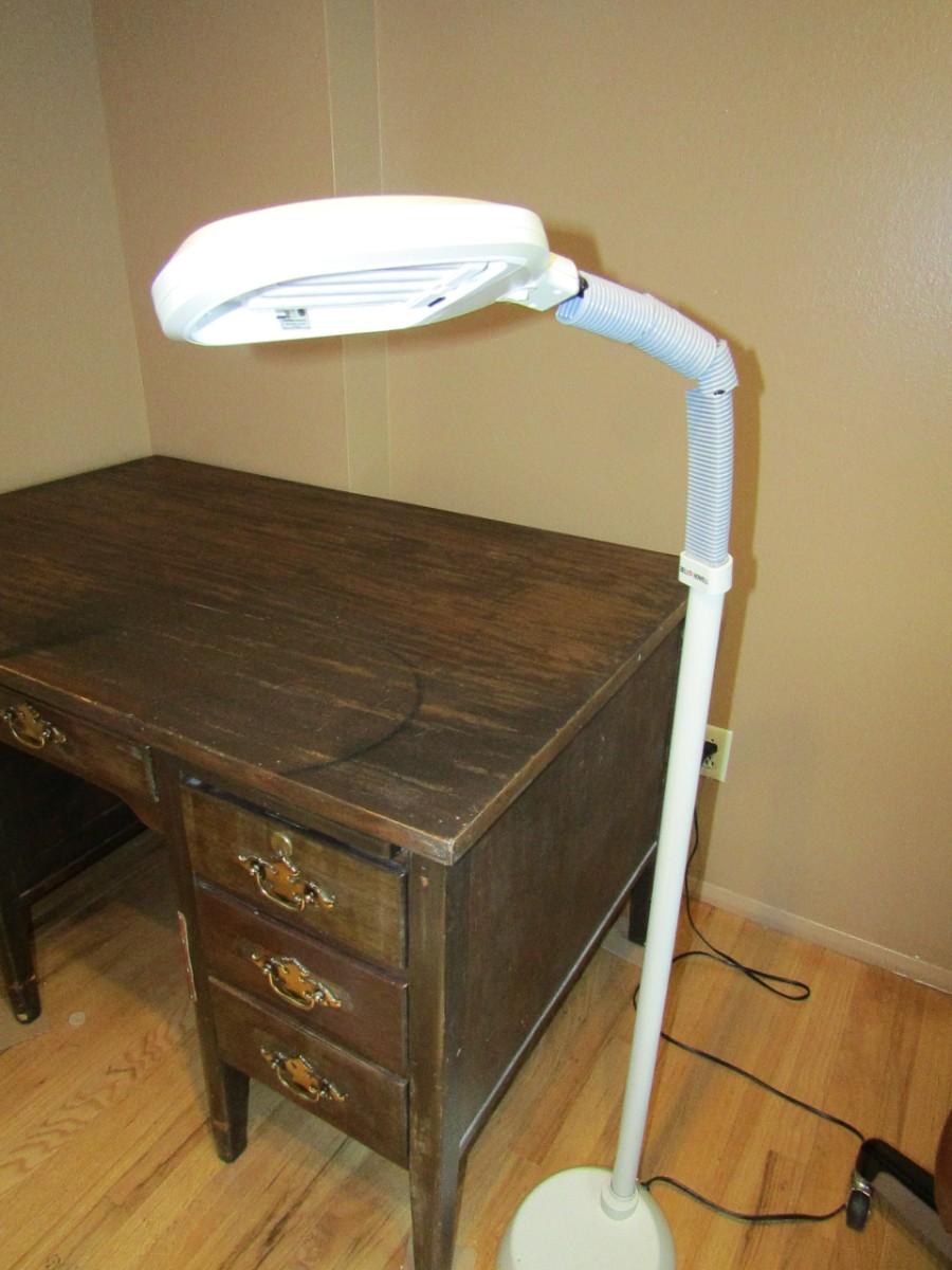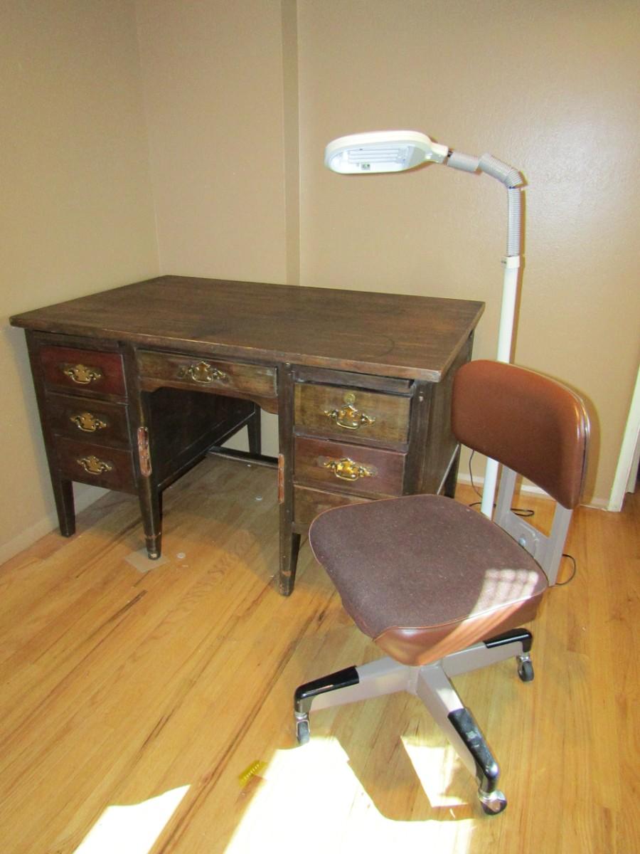 LOT 122 WOODEN DESK, VINTAGE CHAIR AND GOOSE NECK FLOOR LAMP