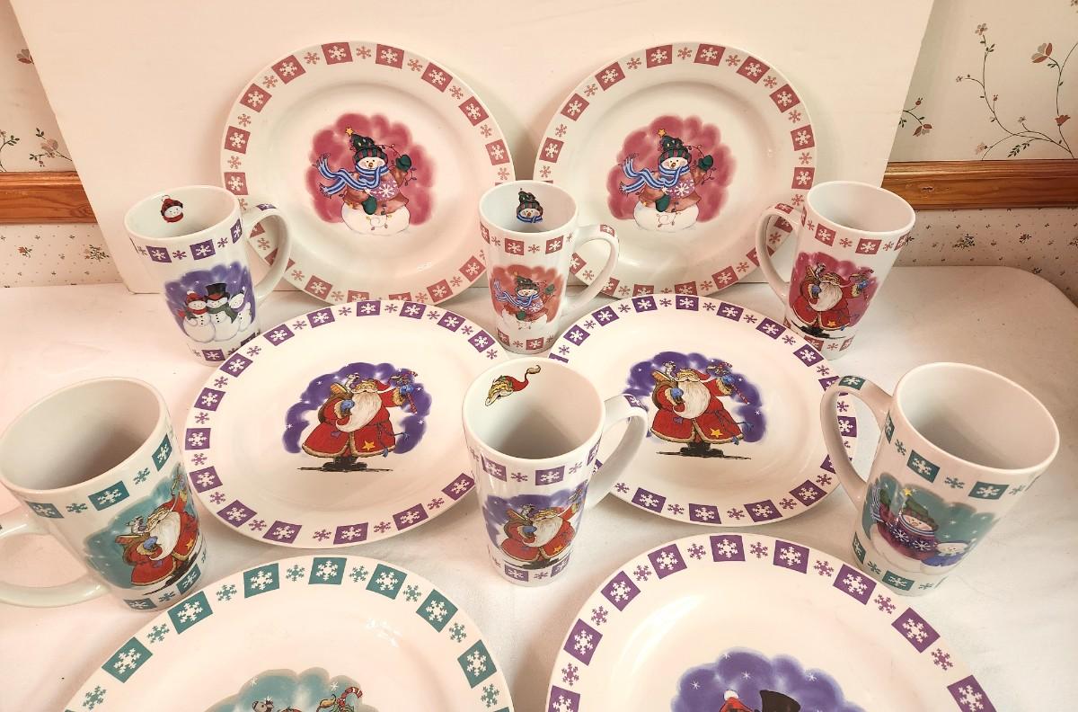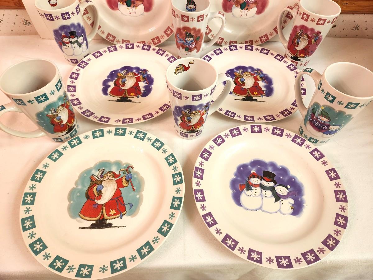 Cute set of colorful Christmas dinnerware - 6 large plates (10.25" across) and 6 matching mugs (6" tall). All in good condition.