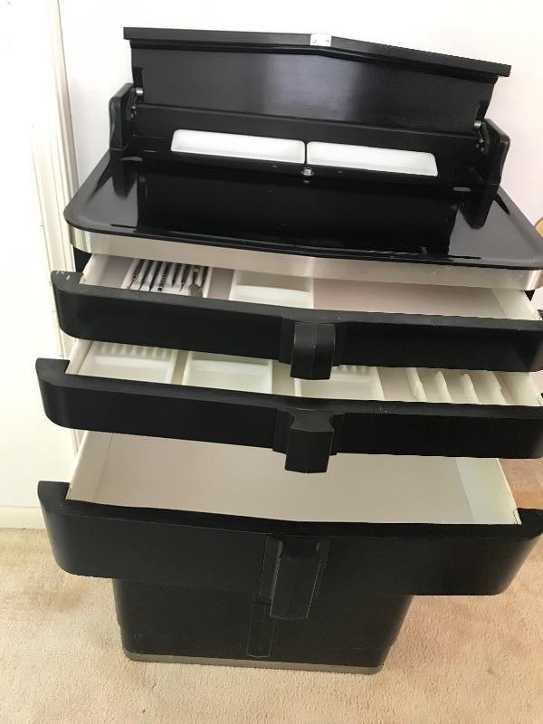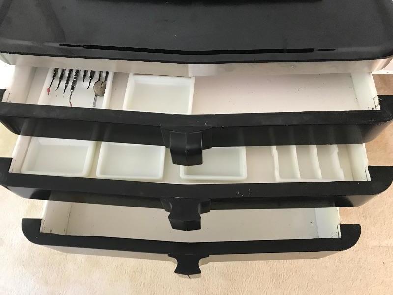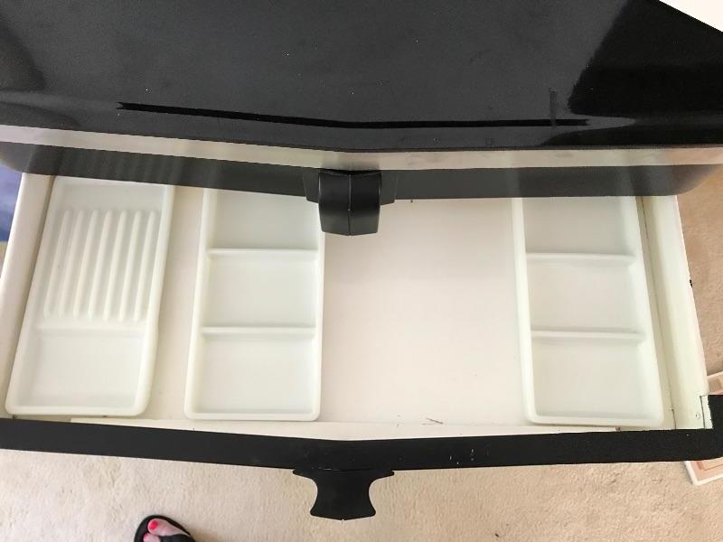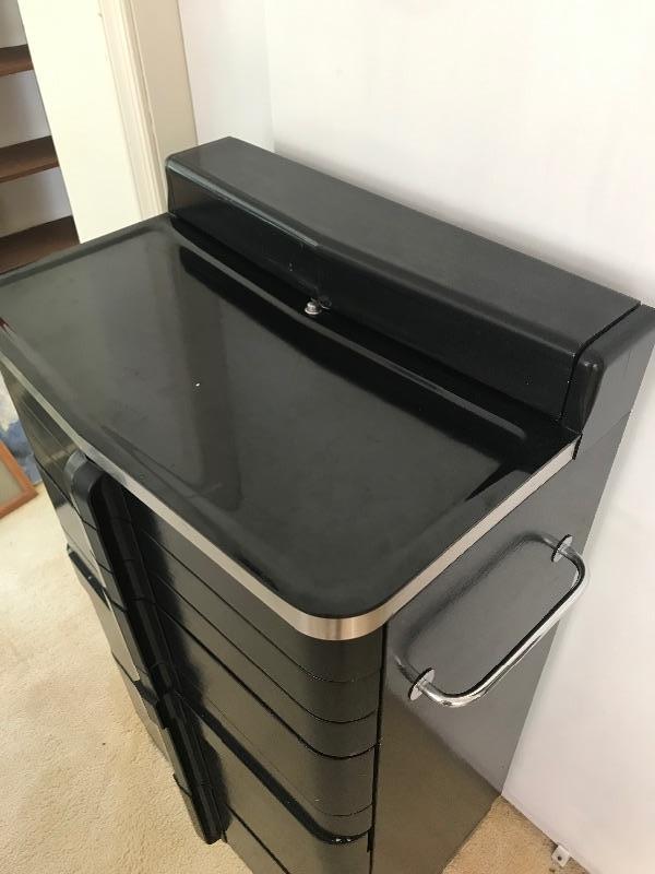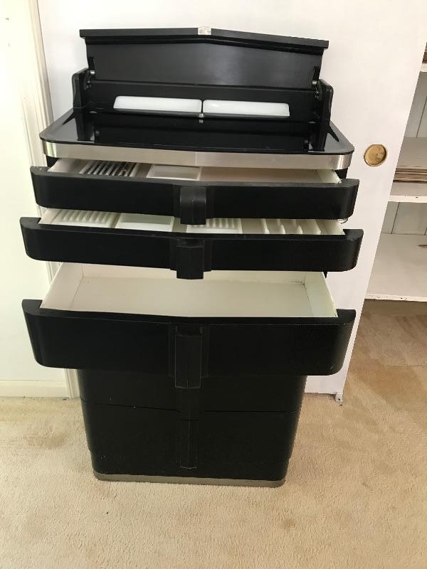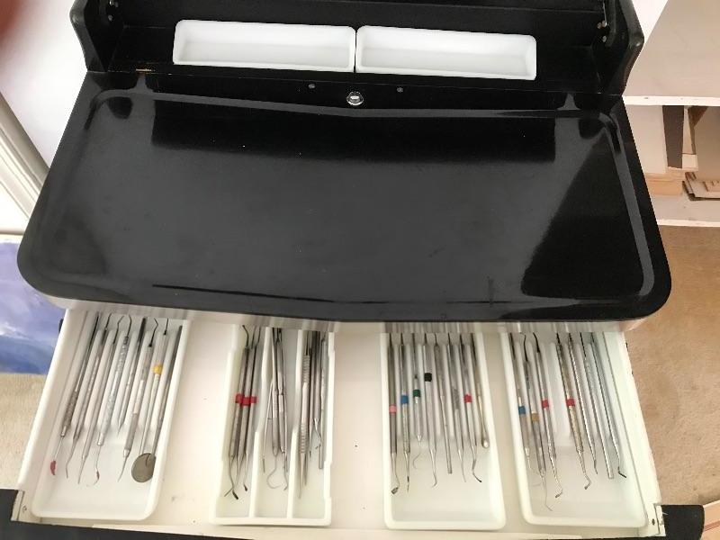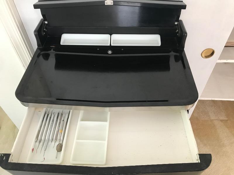 Bartaco American cabinet company dental cabinet including eight drawers plus an open top with 11 milk glass inserts and dental instruments this piece measures 23 1/2 inches wide by 17 inches deep counting the front handles and the drawers are 9 inches to 11 inches deep and the stand itself is 24 1/2 inches tall. it’s in excellent condition. The cabinet is on wheels and has handles on both sides