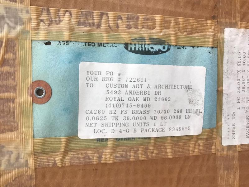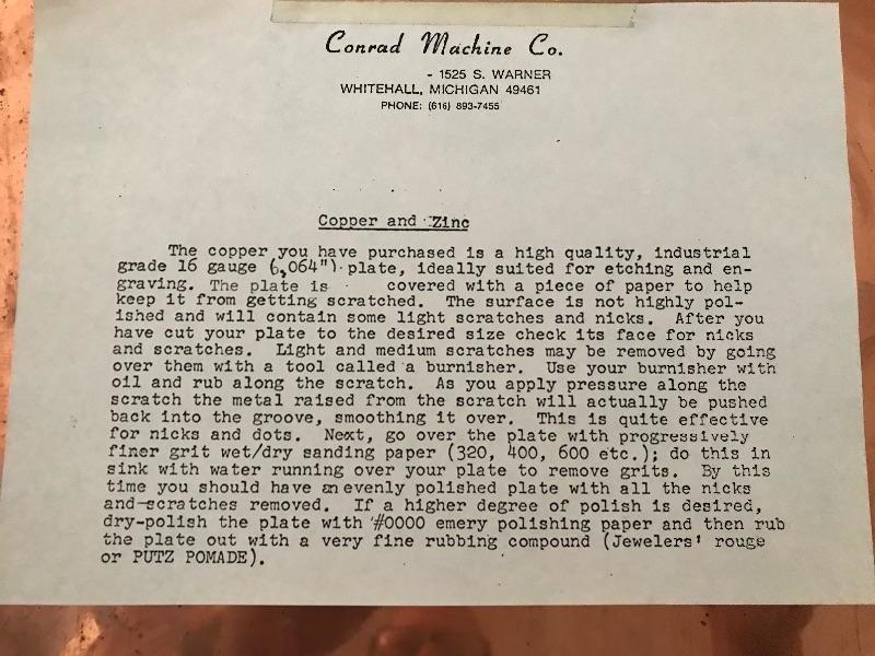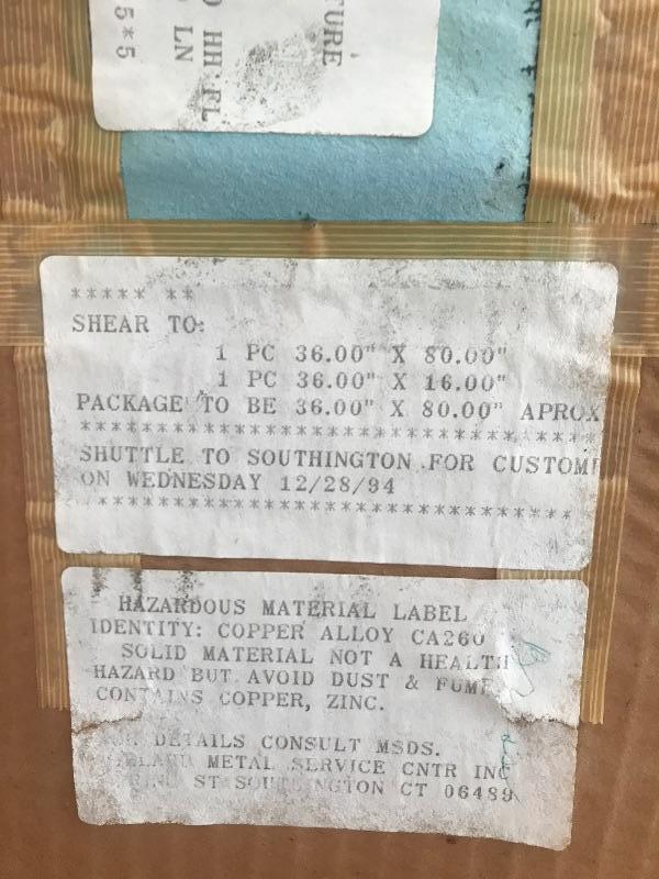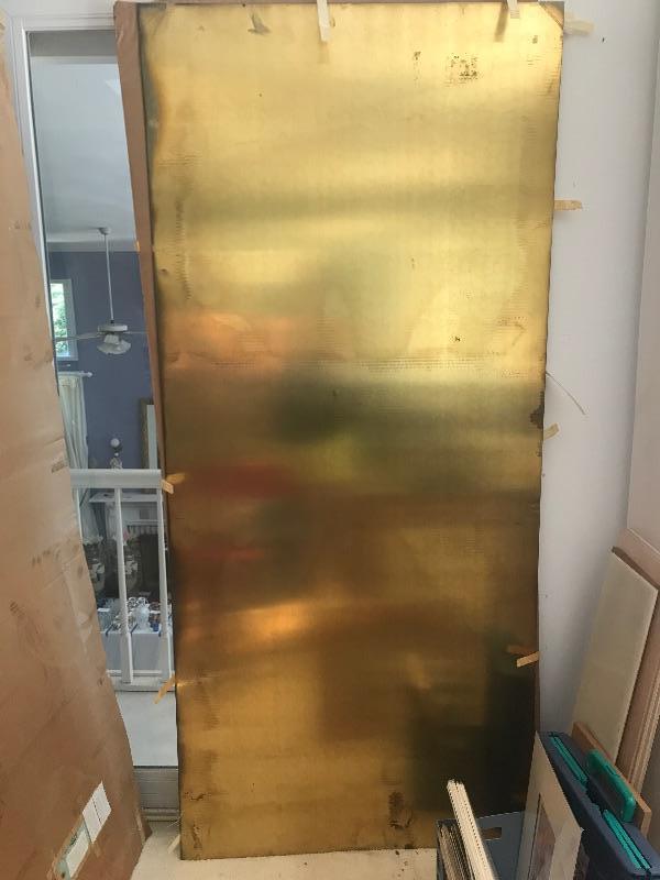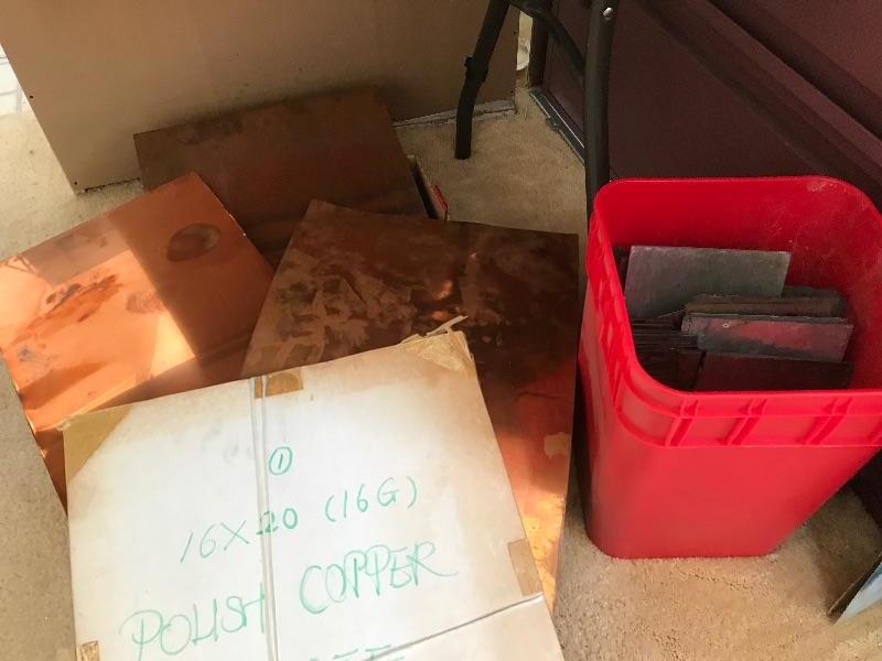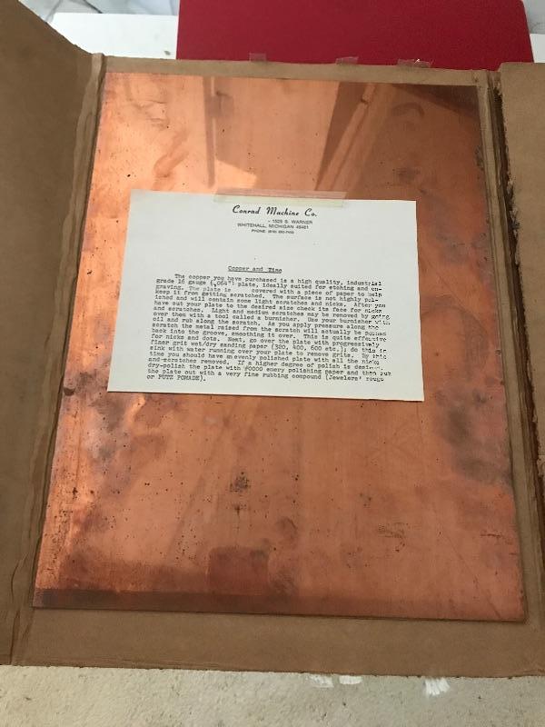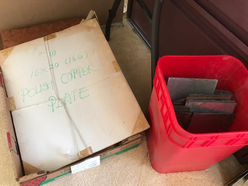 One 36“ x 80“ sheet of brass used for etching and engraving press, one 16“ x 20“ polished copper one 12“ x 24“ copper one 14“ x 24“ copper one 14 1/4“ x 24“ copper other various pieces of metal & slate