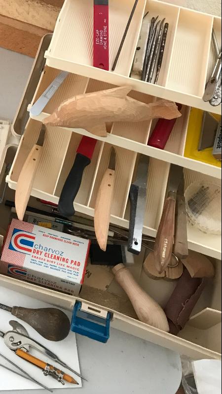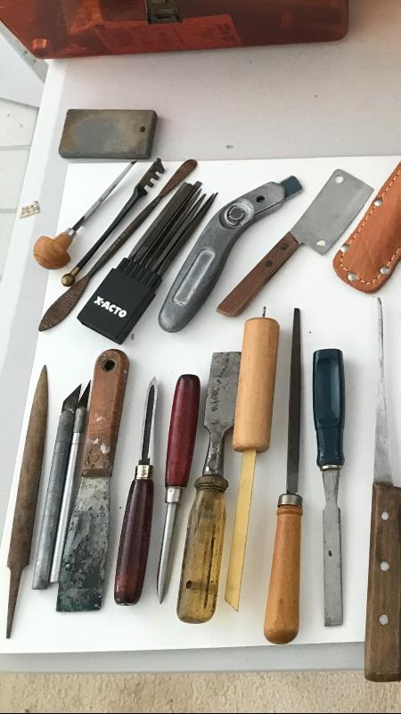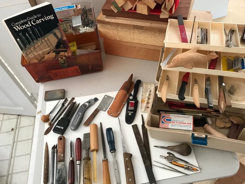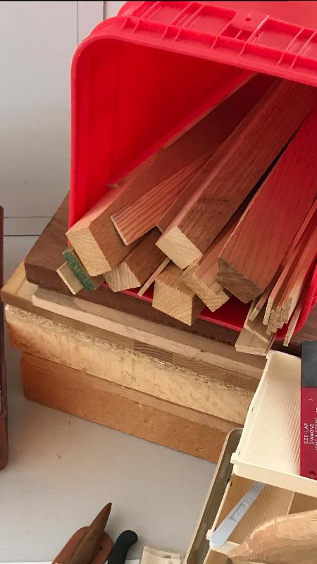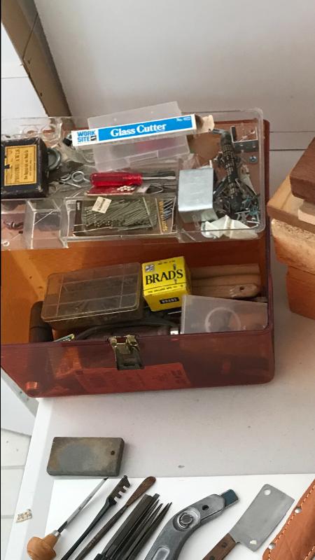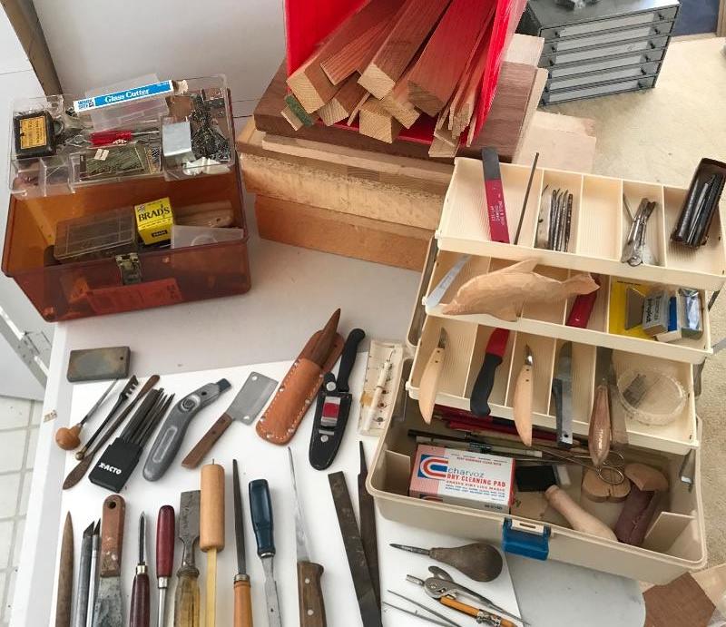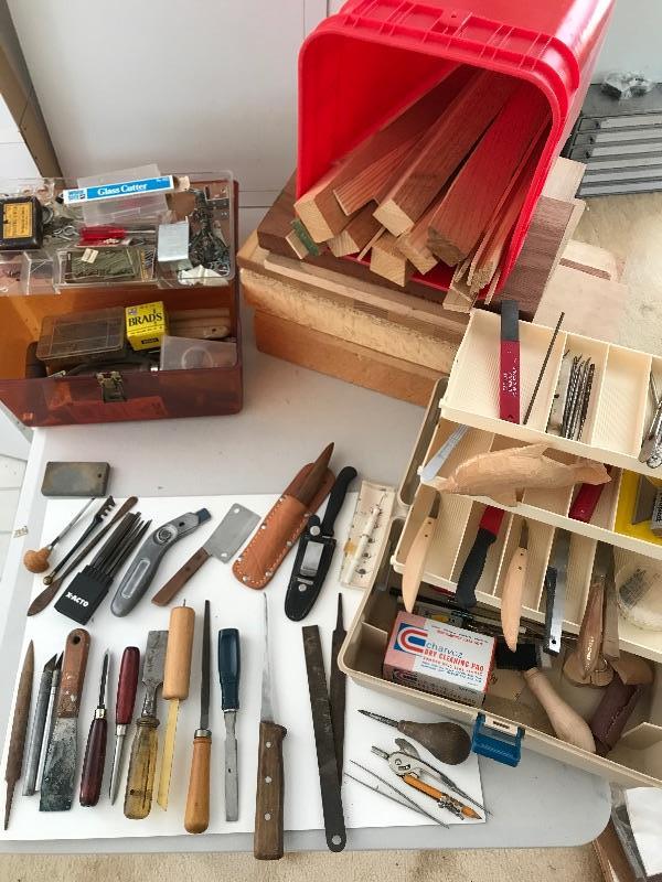 Different sizes, shapes & types of wood. MANY different tools used to work with wood, 2 glass cutters, 2 tackle box carrying cases