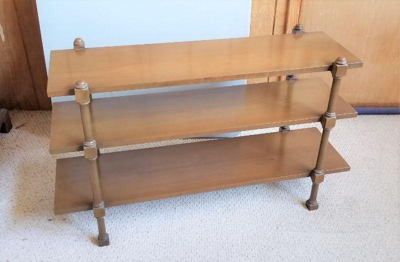 1970's Mid Century Display rack with three shelves - can stand alone or on top of another piece of furniture. Solid wood. Measures 40" x 12", 24" tall.