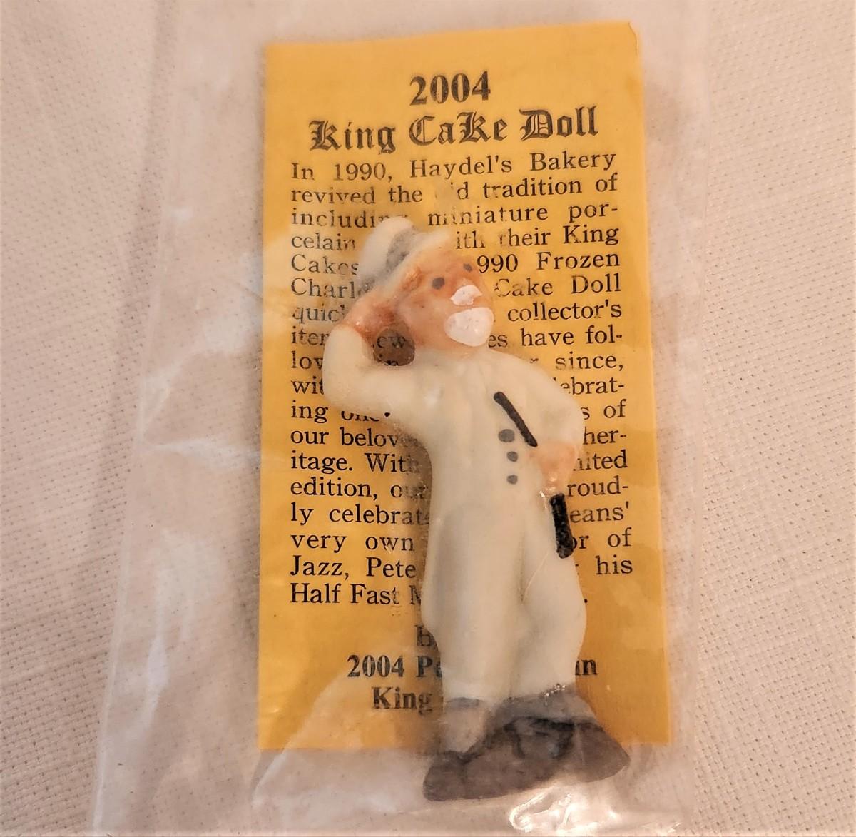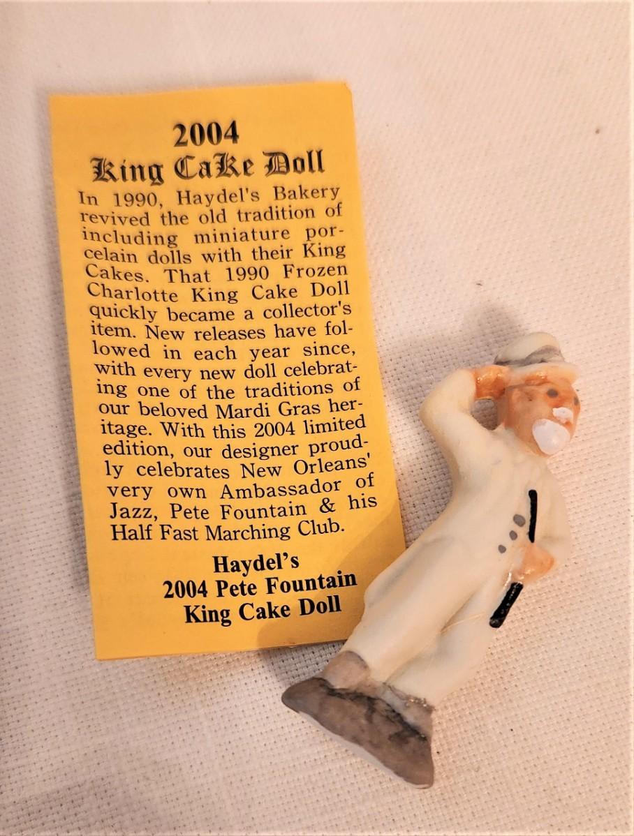 Highly collectible - 2004 Haydel's Bakery King Cake baby, Pete Fountain - original packaging with insert. Good condition. Figure is 2" tall, made of bisque china.