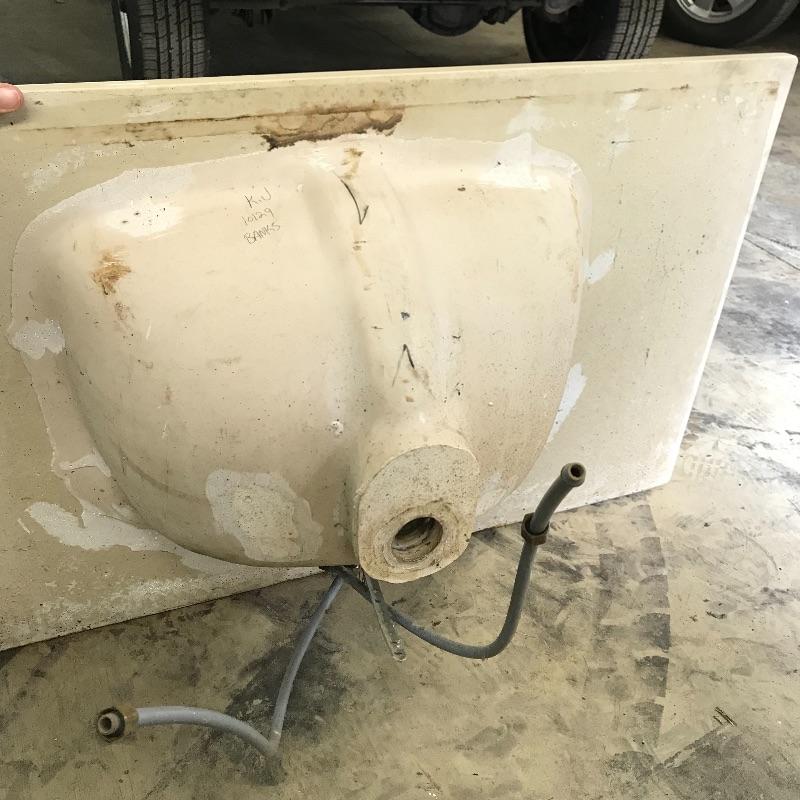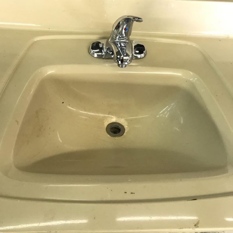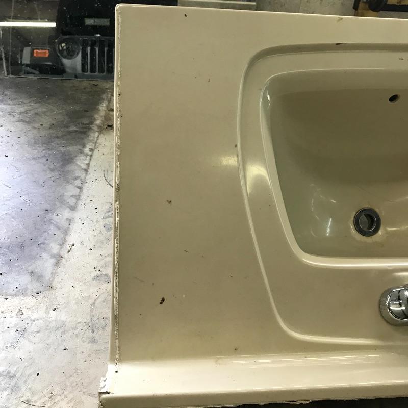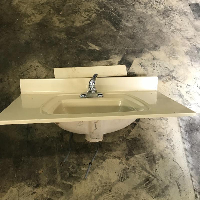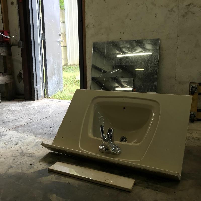 Bathroom essentials! This sink appears to be porcelain, measuring 37” x 22” and has a faucet by Faucet Solutions. The sink appears to be 9” deep, but if you are worried about tight measurements, please make an appointment for the preview. Need a mirror above your new sink? You’re in luck! Large and small mirrors accompany the sink for your vanity needs. The large Gardner USA mirror measures 36”sq. It has blemishes shown on the bottom side in the photos, but they are small enough to be easily covered by a frame that would overlap the mirror border by .75”. The small mirror, 24” x 18” also has a small crack in the lower corner. See photos. Local pick up only.
