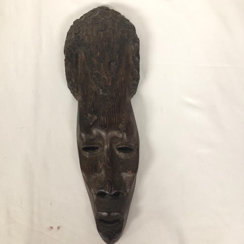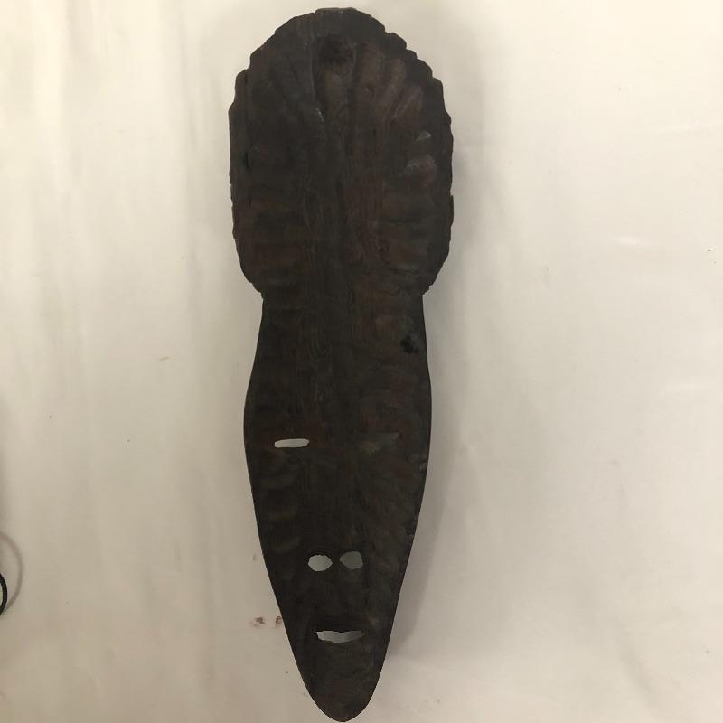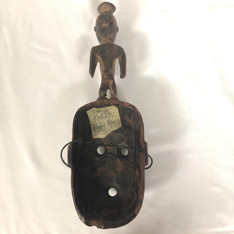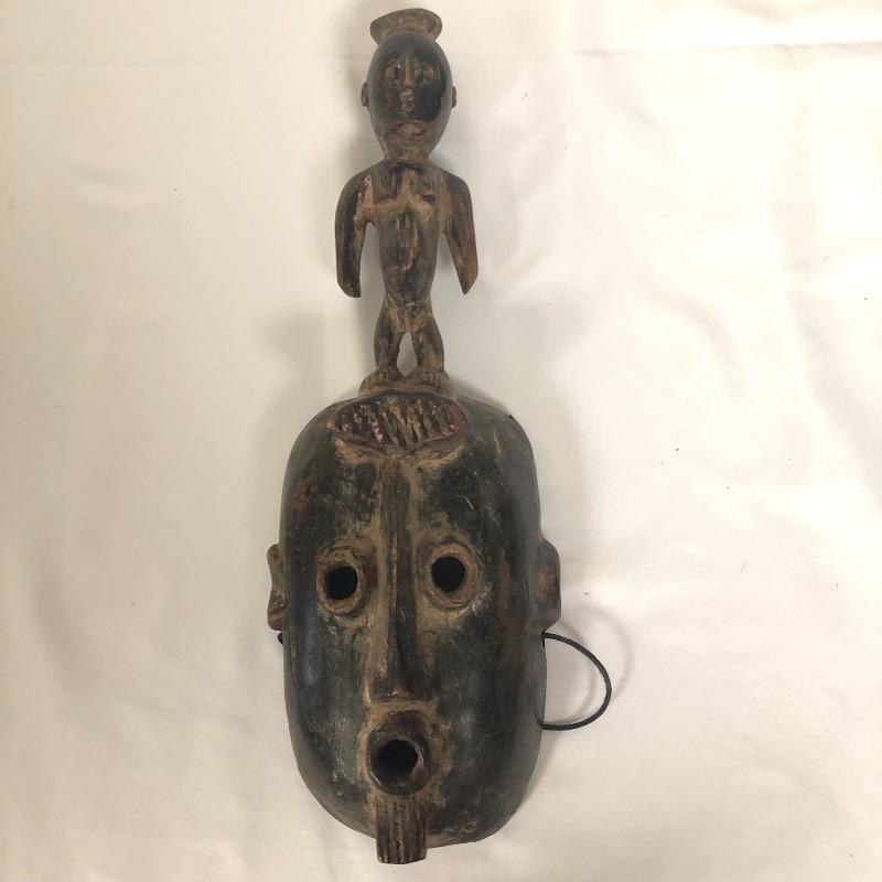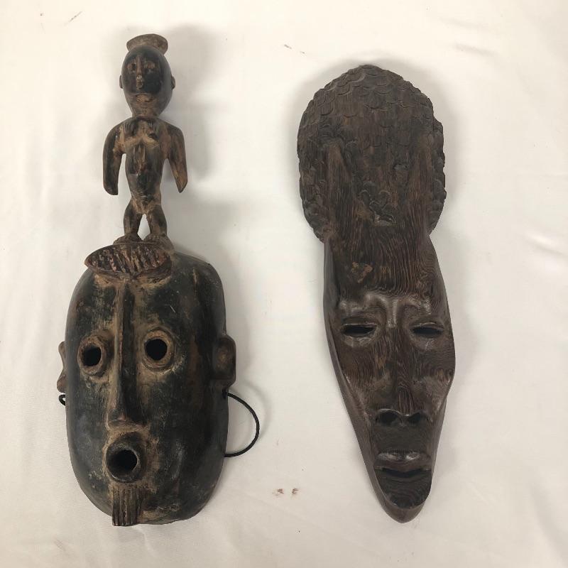 These two masks are made out of wood and are smaller than other masks in this auction. The mask with a small figure on top measures 13” x 5,” and the other mask measures 12.5” x 4.” There is a sticker on the inside of one of the masks that could be removed.