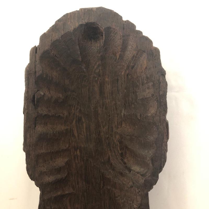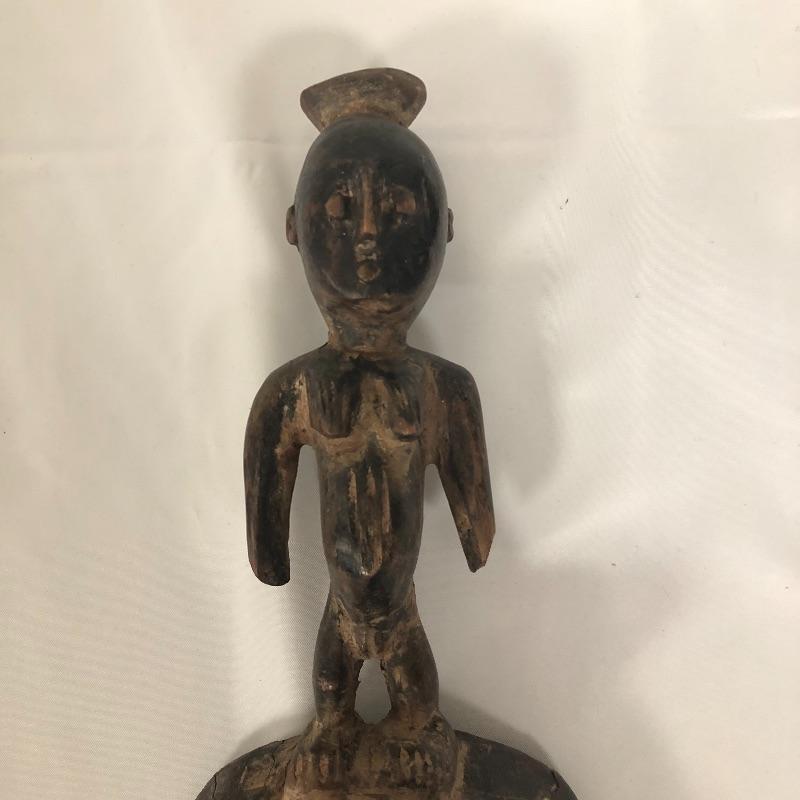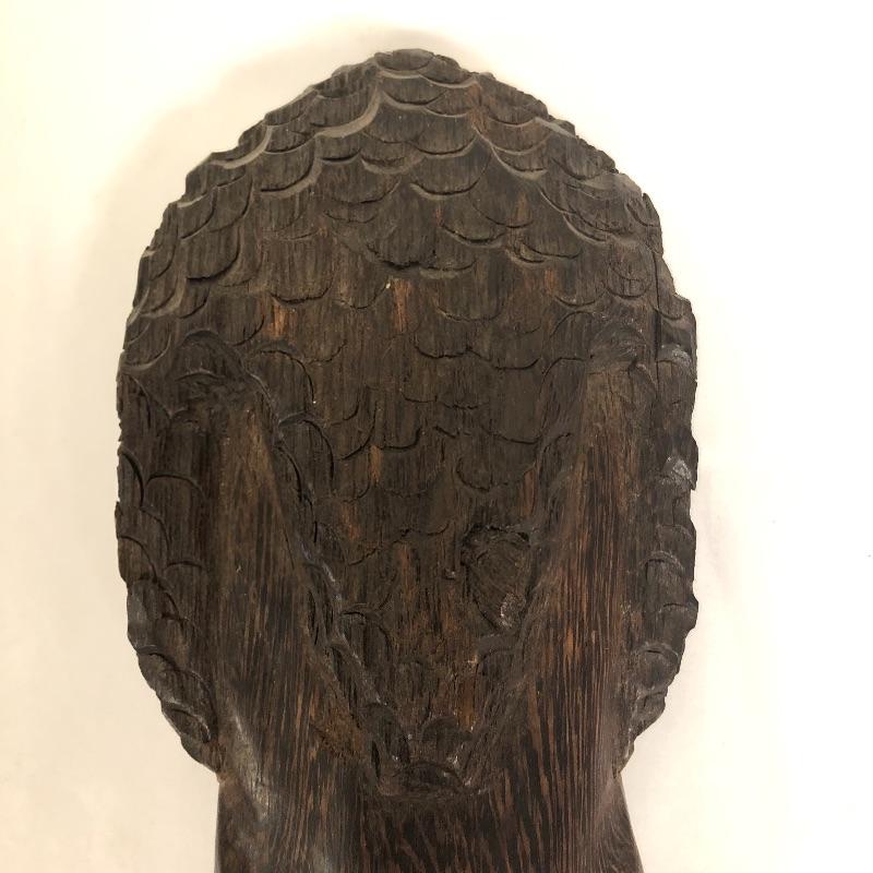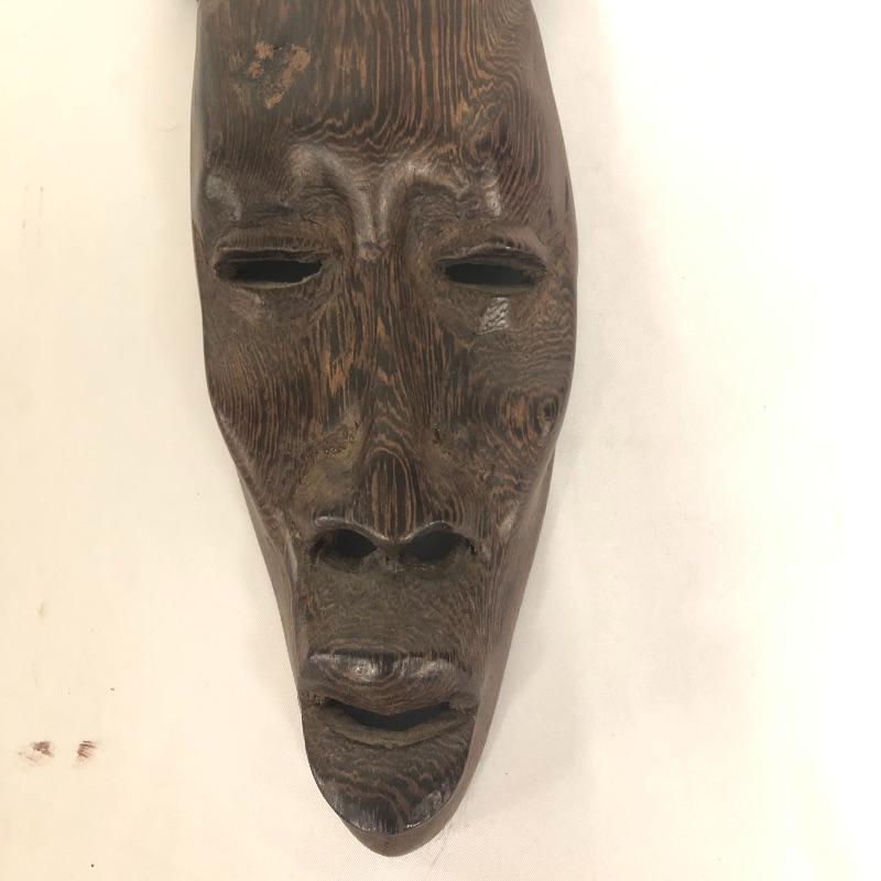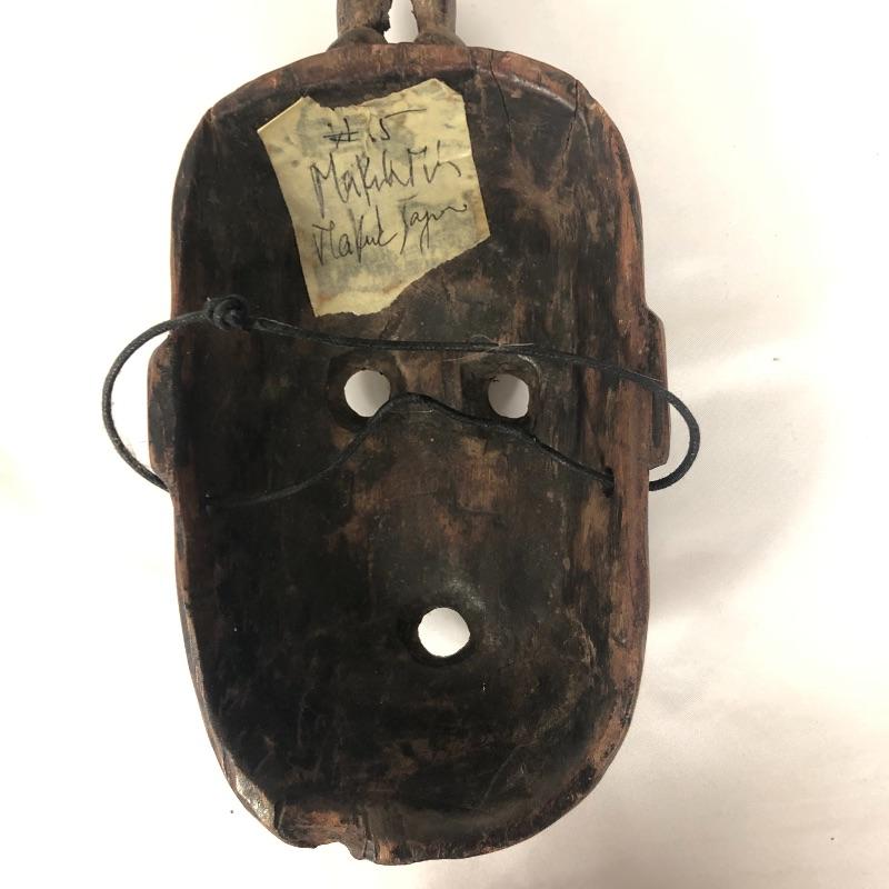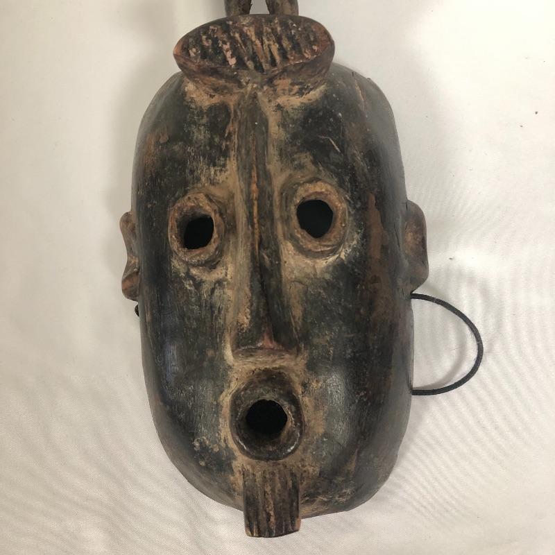 These two masks are made out of wood and are smaller than other masks in this auction. The mask with a small figure on top measures 13” x 5,” and the other mask measures 12.5” x 4.” There is a sticker on the inside of one of the masks that could be removed.