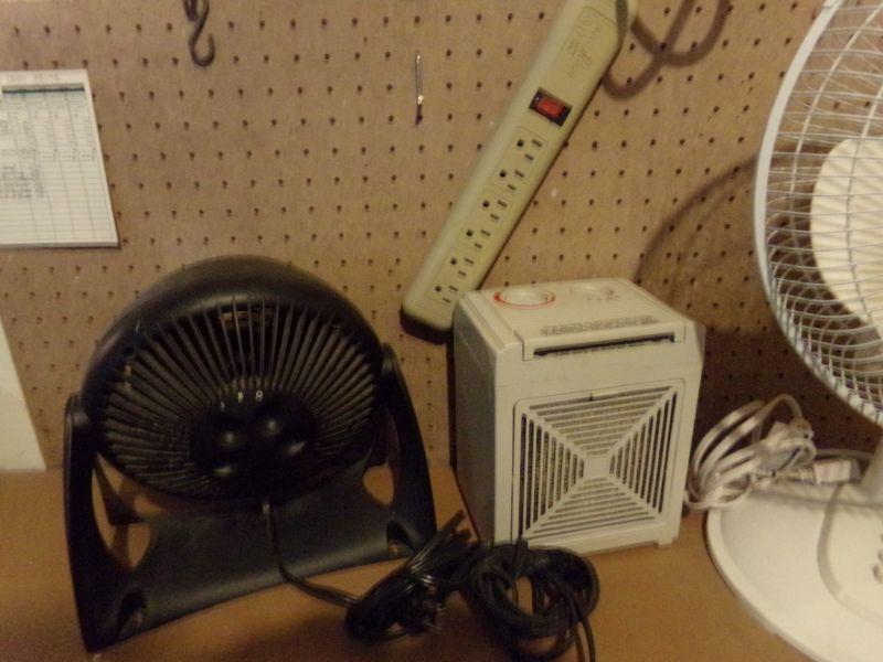 2 FANS BY HOLMES AND LIVING ACCENTS, AND A MAXI HEAT HEATER. ALSO A MULTI OUTLET EXTENSION CORD. THEY ARE IN GOOD CONDITION.