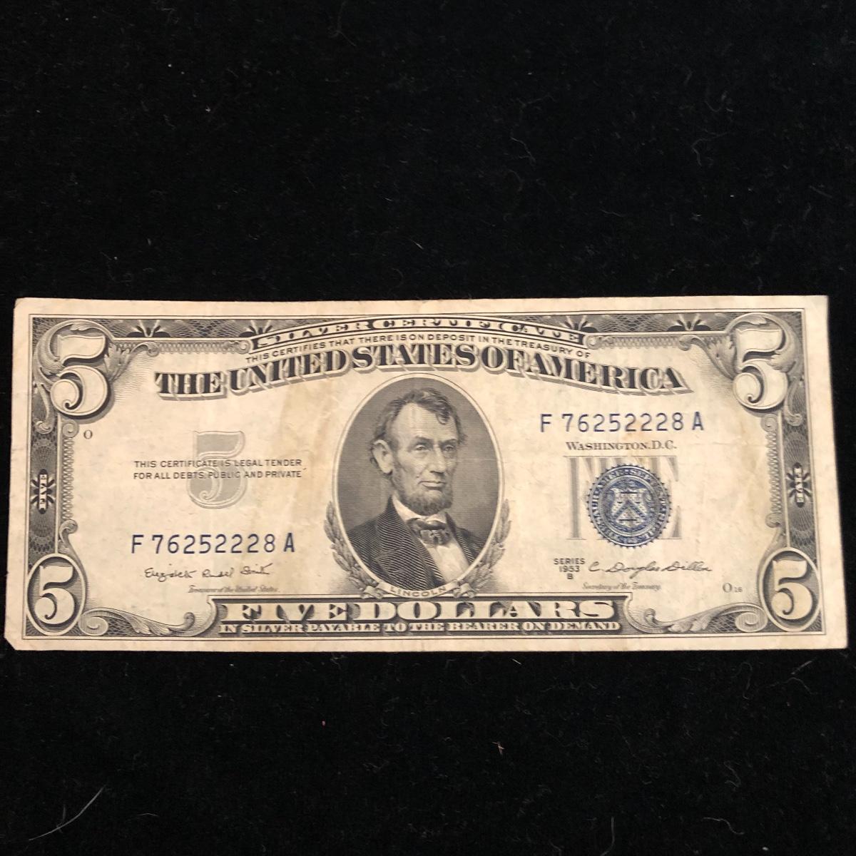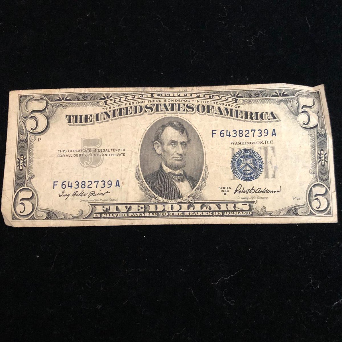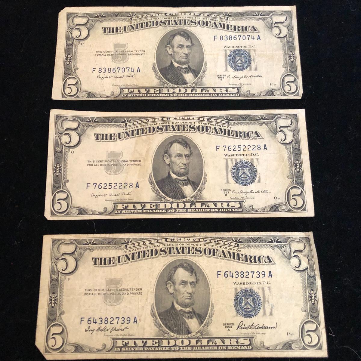 This lot includes three blue seal five dollar bills. Shipping Available.