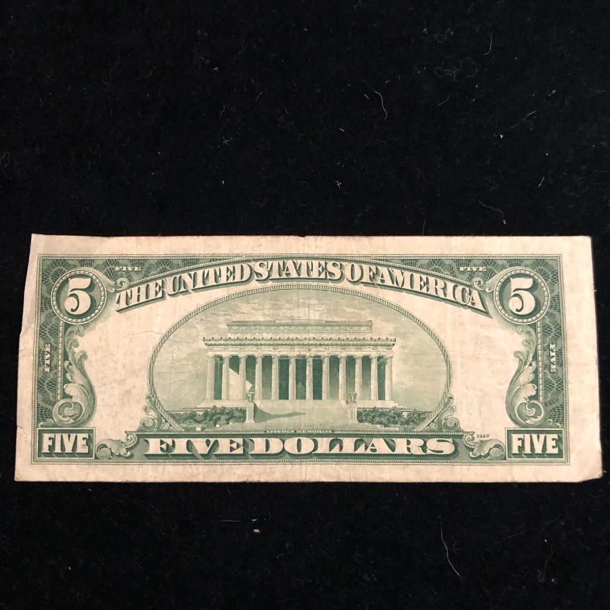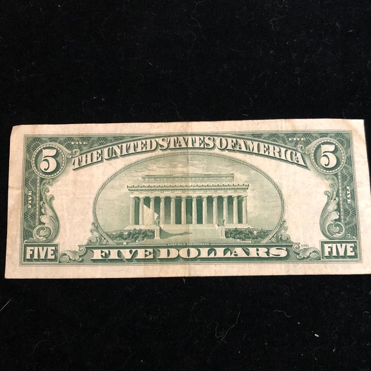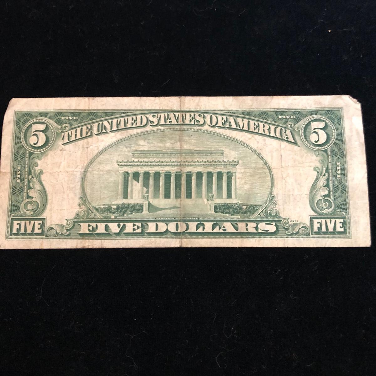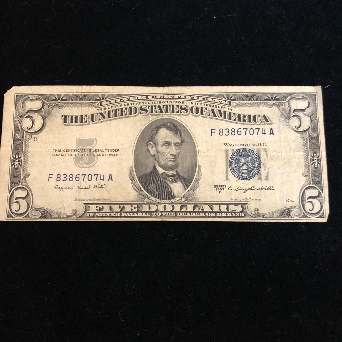 This lot includes three blue seal five dollar bills. Shipping Available.