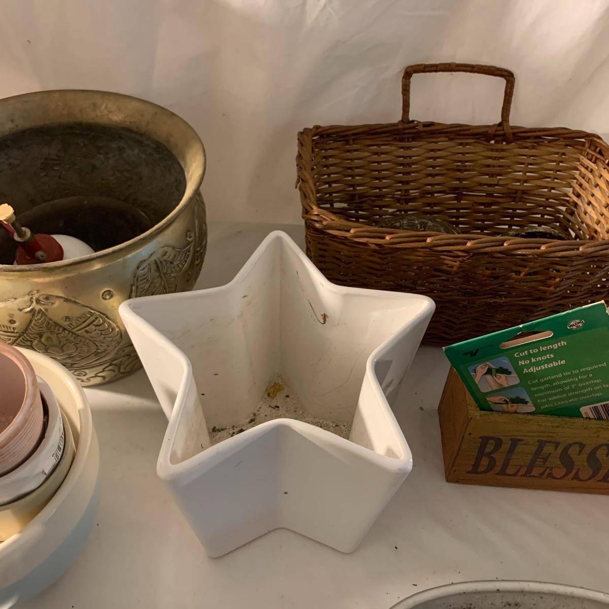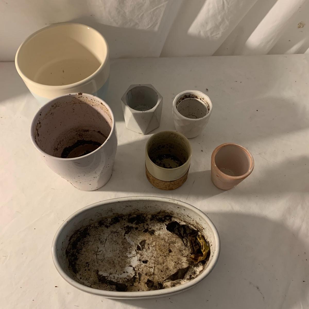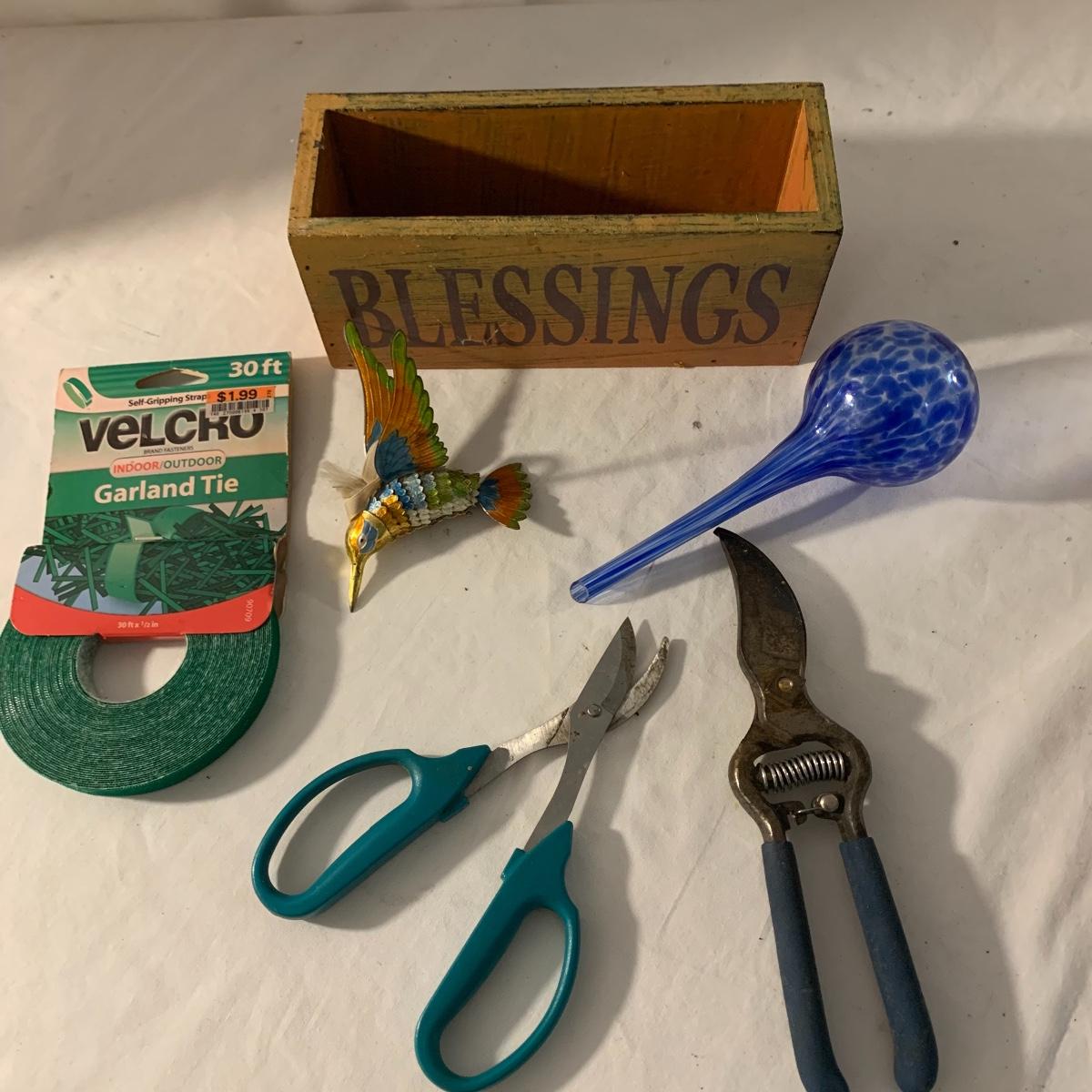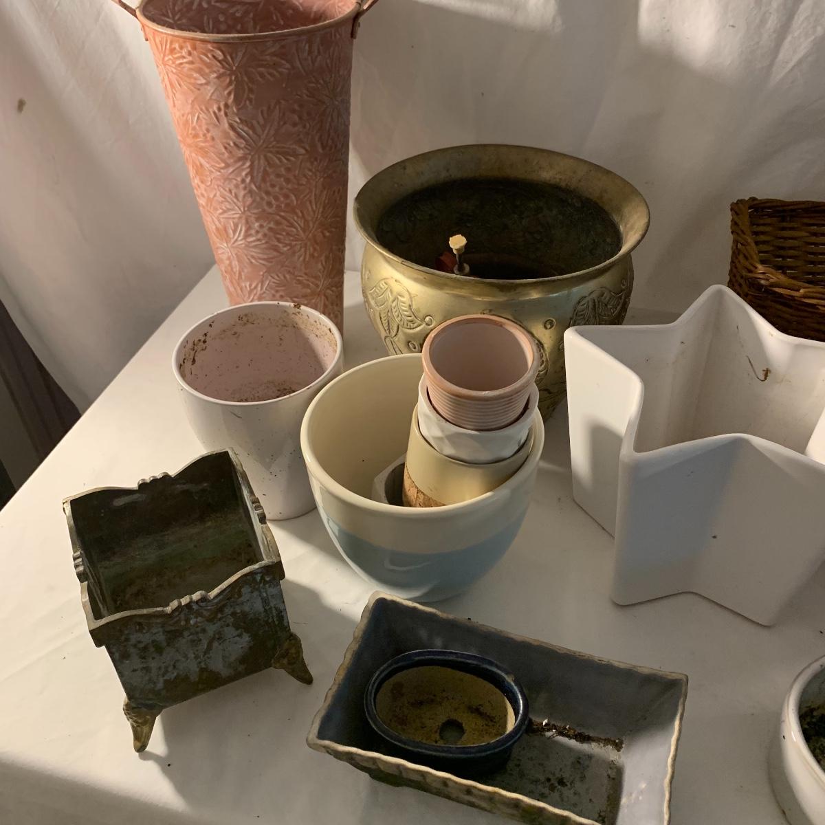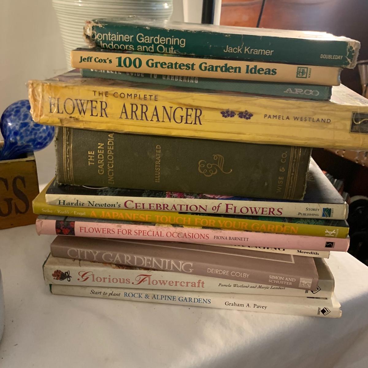 Calling all garden lovers! Gather around! Lot 123 includes numerous pots, two vases (the larger is 14” tall), a star shaped pot, tools, accessories, gardening books, and two plant shelves. The small table is 20” tall, and the shelf measures 10” deep X 16” wide X 36” tall. There’s a little of everything here. See pics for content, condition, and detail. Local pickup only.