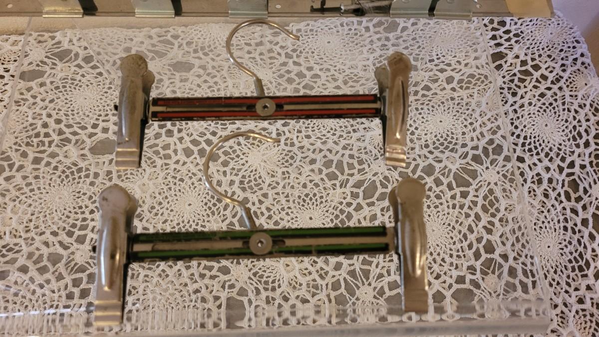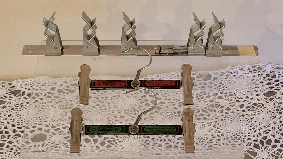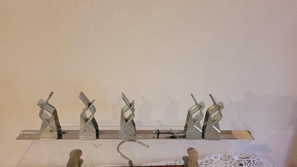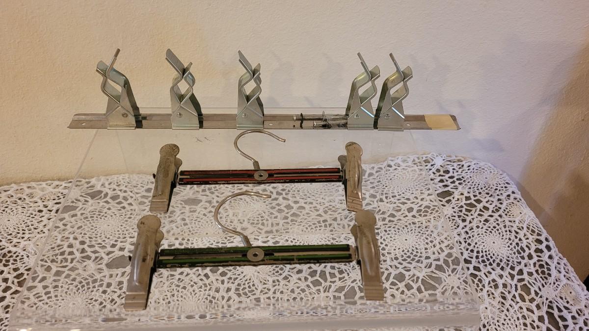 Lot 123: Vintage Broom/Mop Clip Rack & (2) Grims Pres-Gard Hangers