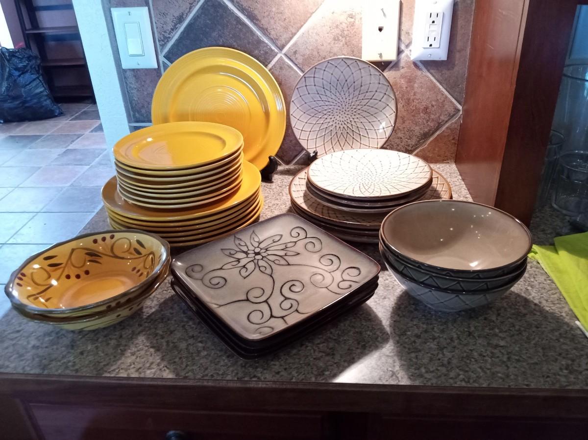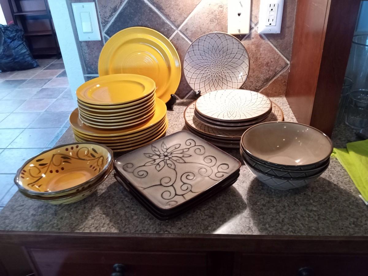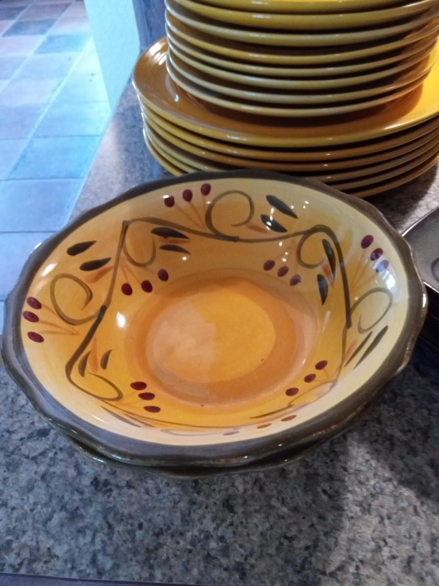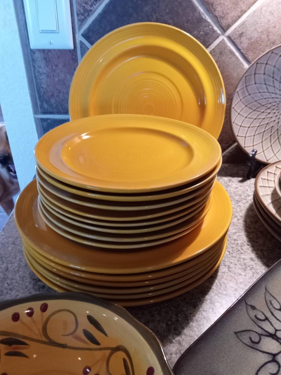 THE MUSTARD YELLOW DINNERWARE HAS 7 DINNER PLATES, 8 SALAD PLATES AND 2 BOWLS