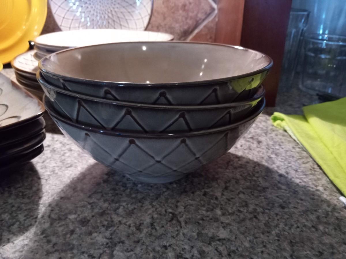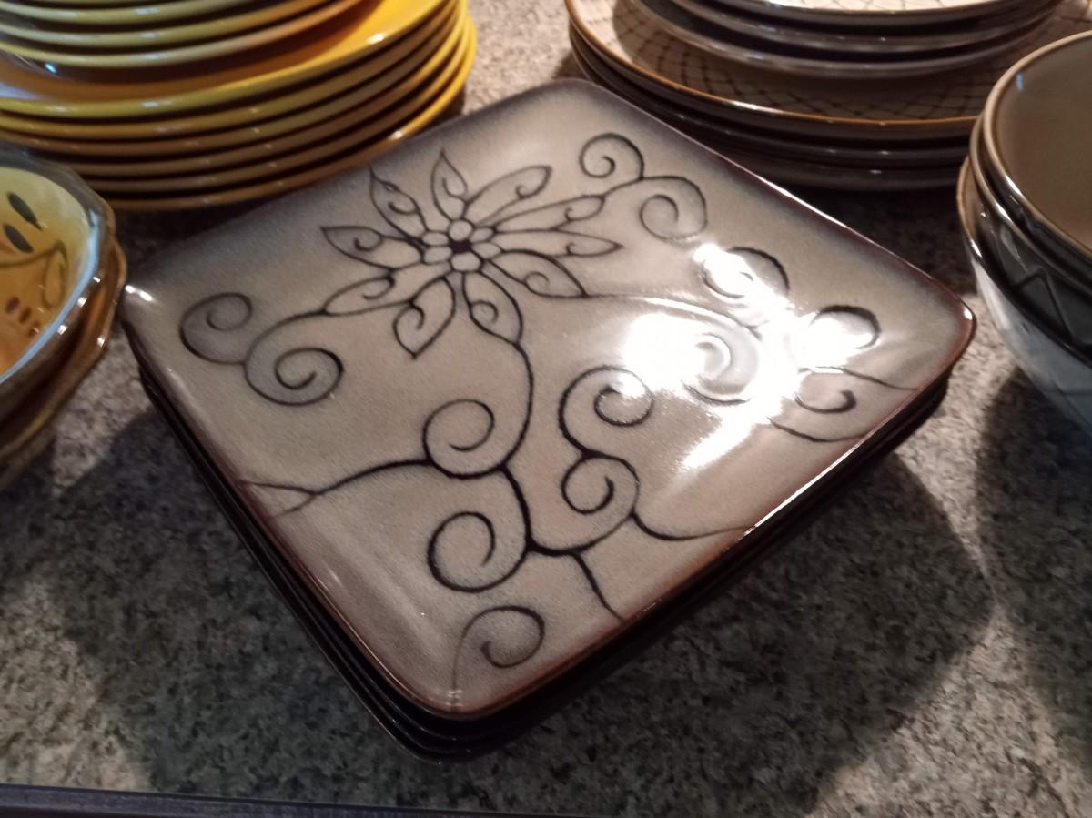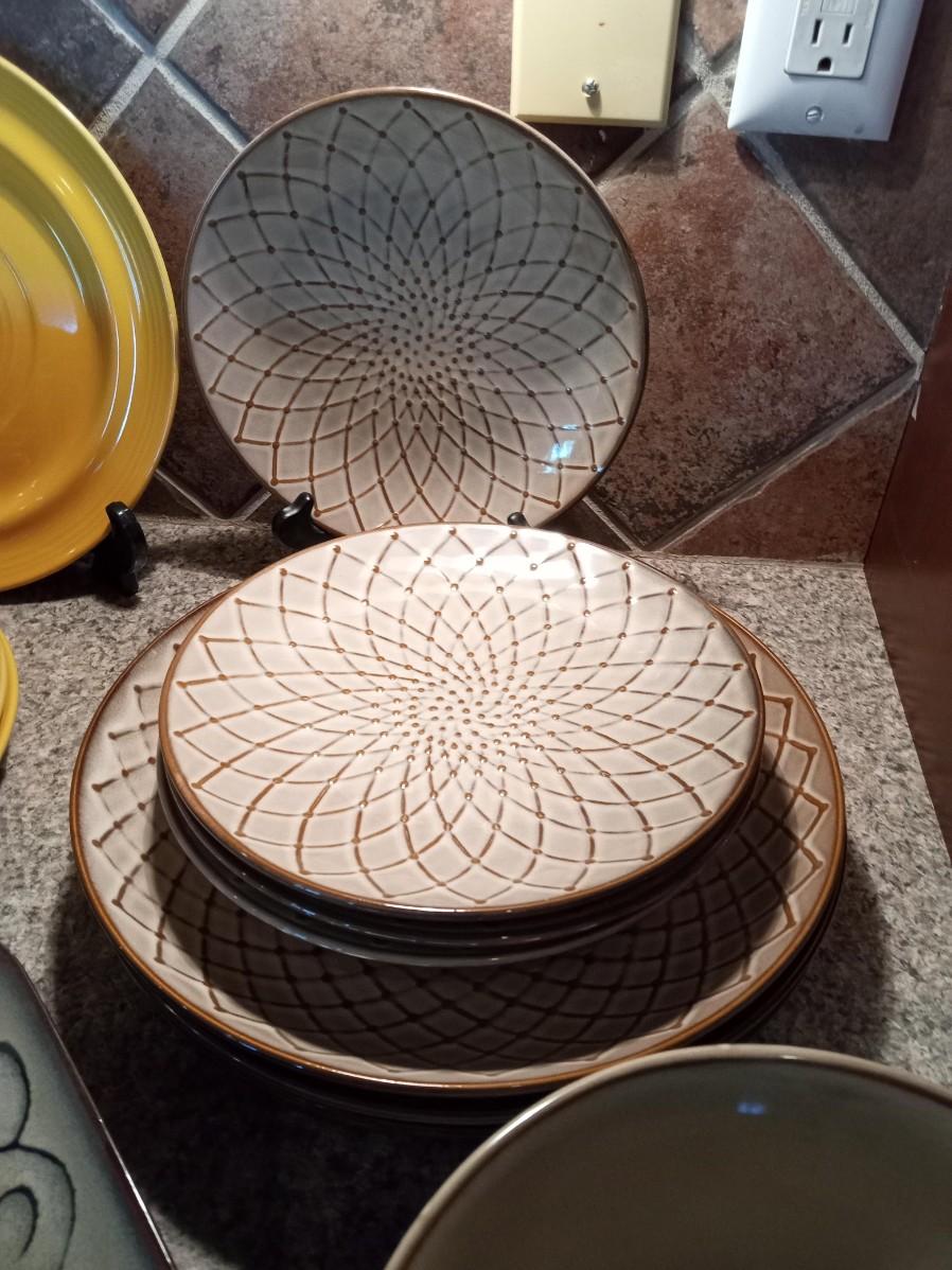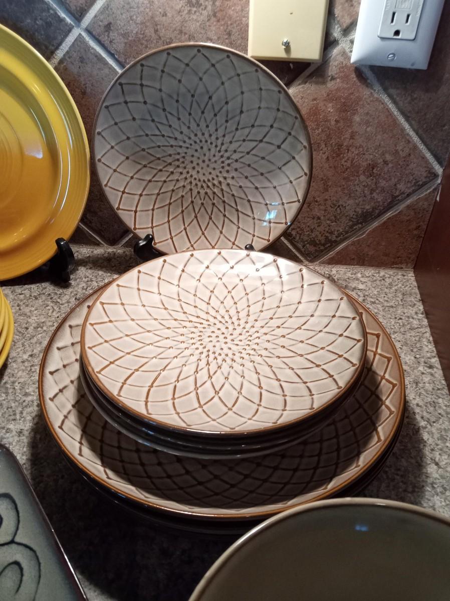 THE TAN DINNERWARE HAS 3 DINNER PLATES, 4 SALAD PLATES, 3 BOWLS