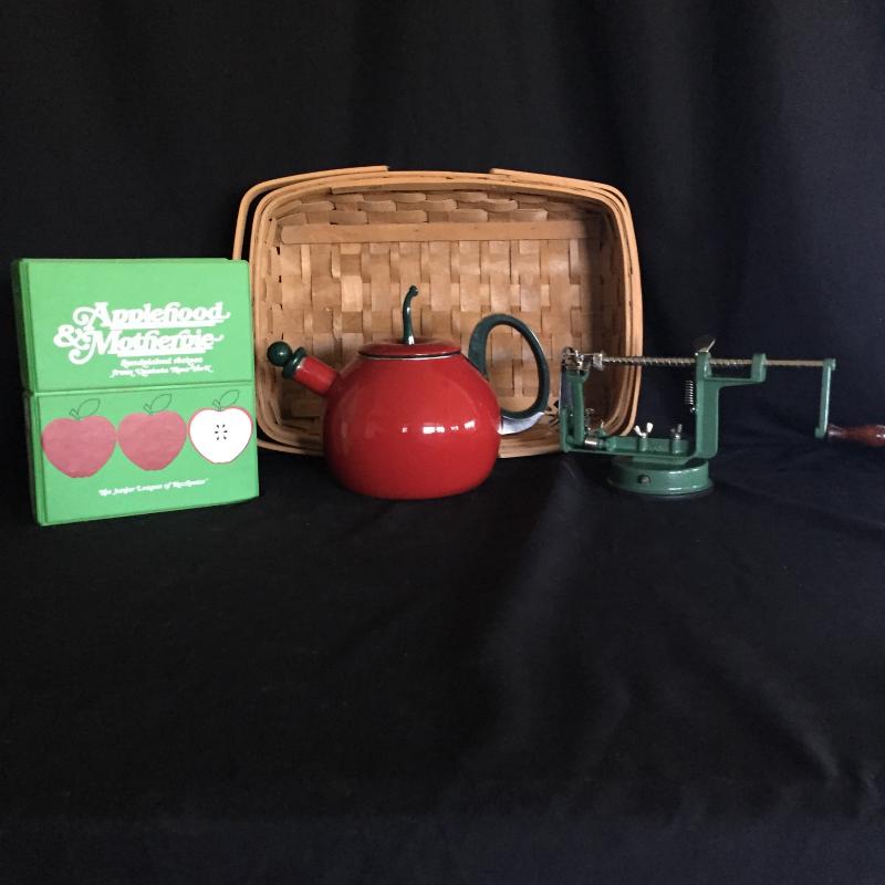 Apple Peeler,Apple Shaped Teapot ,Apple Inspired Cookbook and Basket.Just in time for Apple season. Basket Measures 12” x 16.5” x 4”.