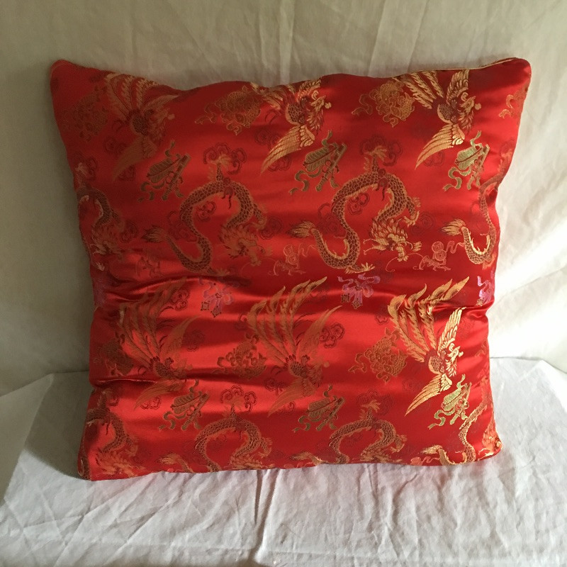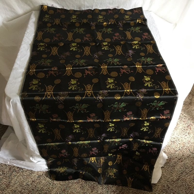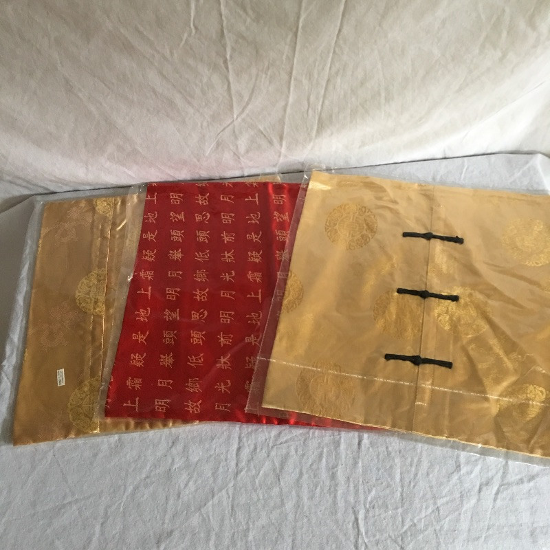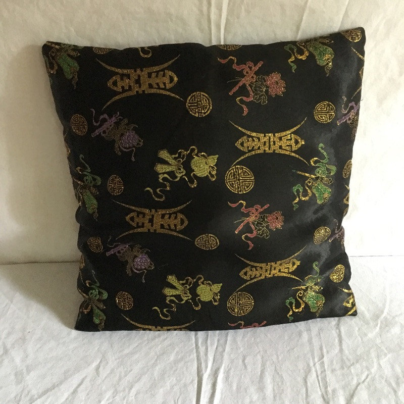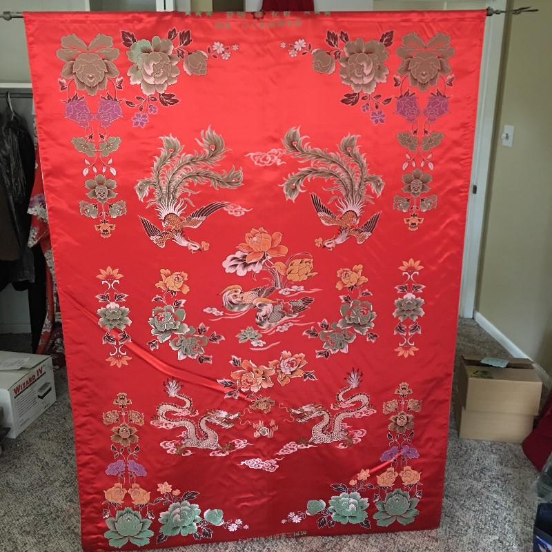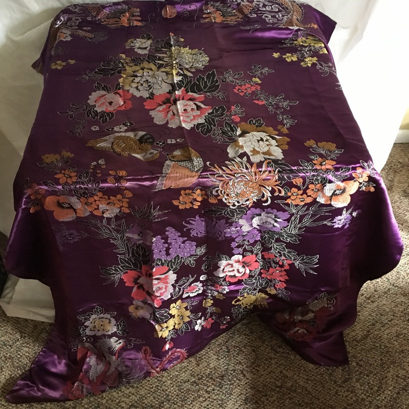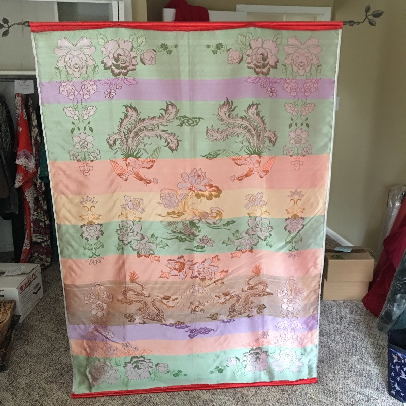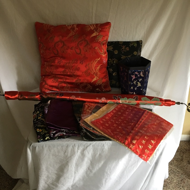 Selection of Asian silks includes wall hanging, five 16” x 16” pillow covers, three pieces of fabric, three pillows and a basket. Wall hanging measures 50” x 70”.