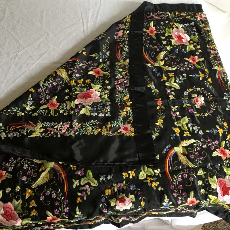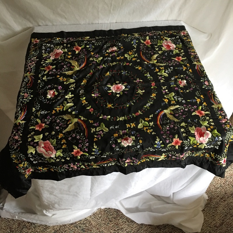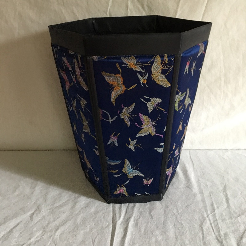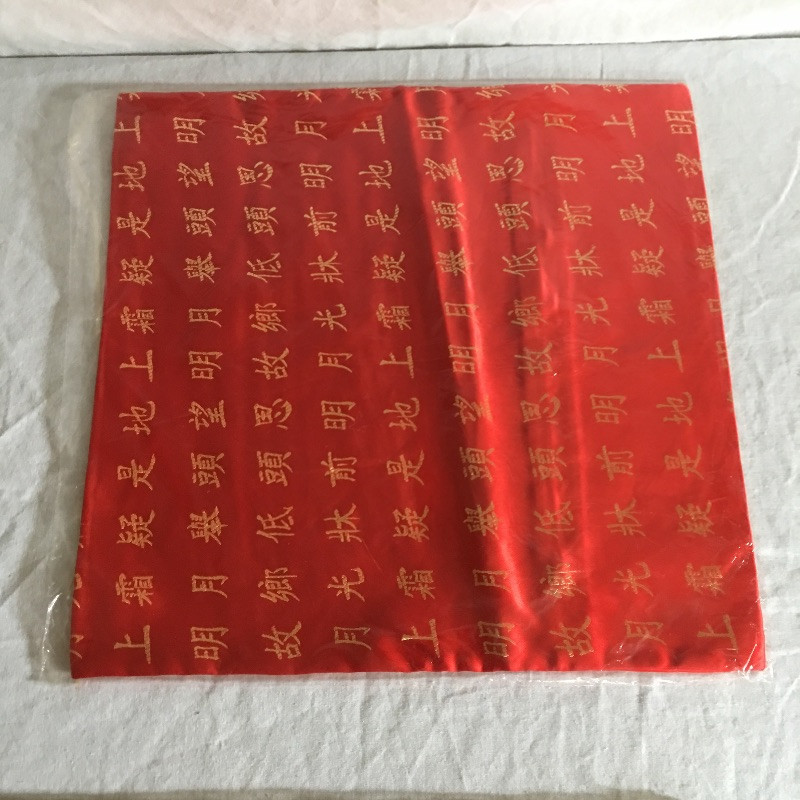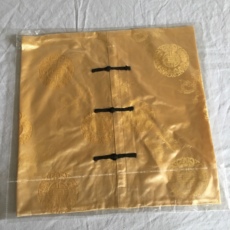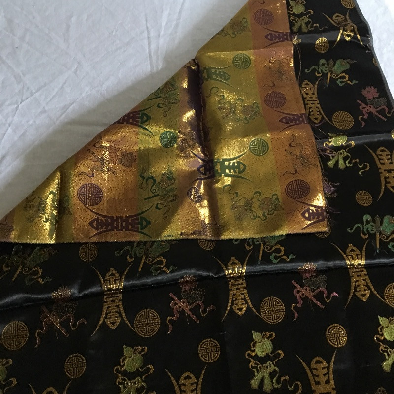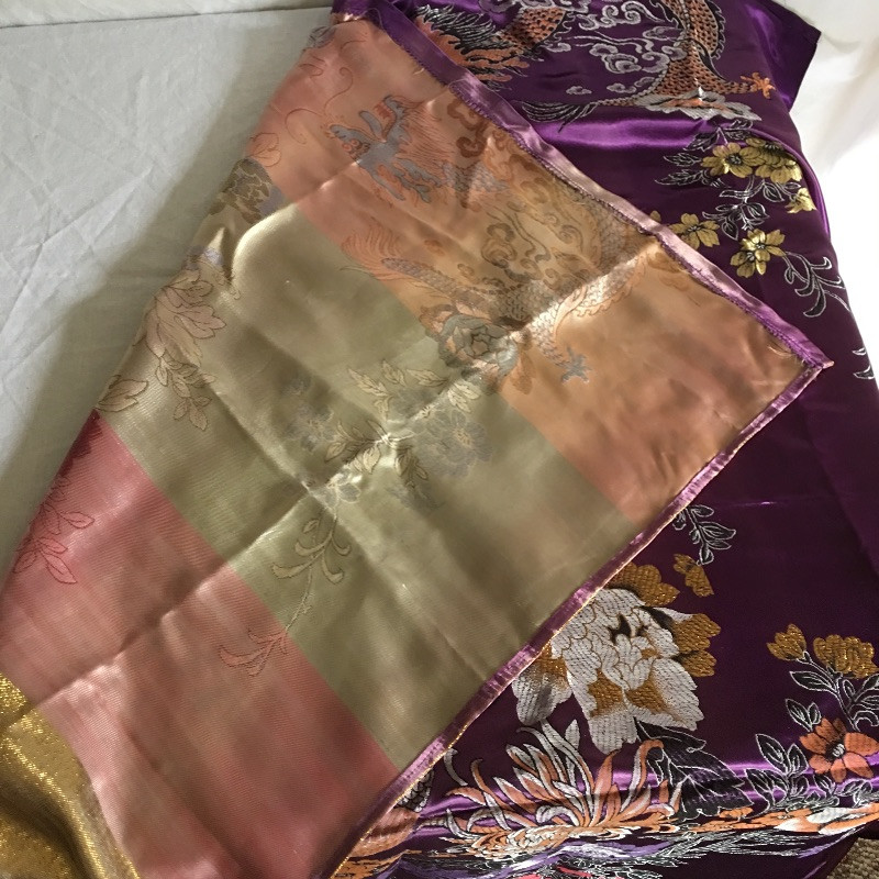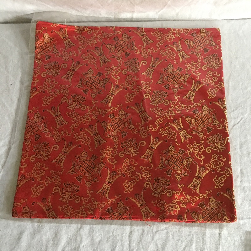 Selection of Asian silks includes wall hanging, five 16” x 16” pillow covers, three pieces of fabric, three pillows and a basket. Wall hanging measures 50” x 70”.