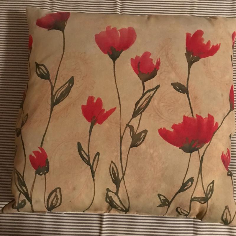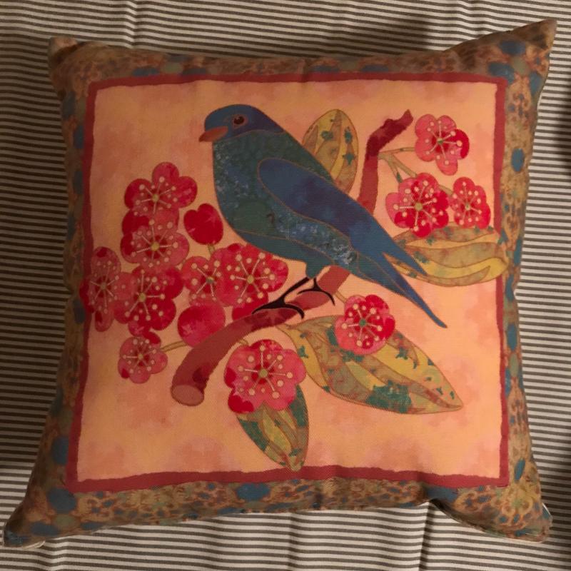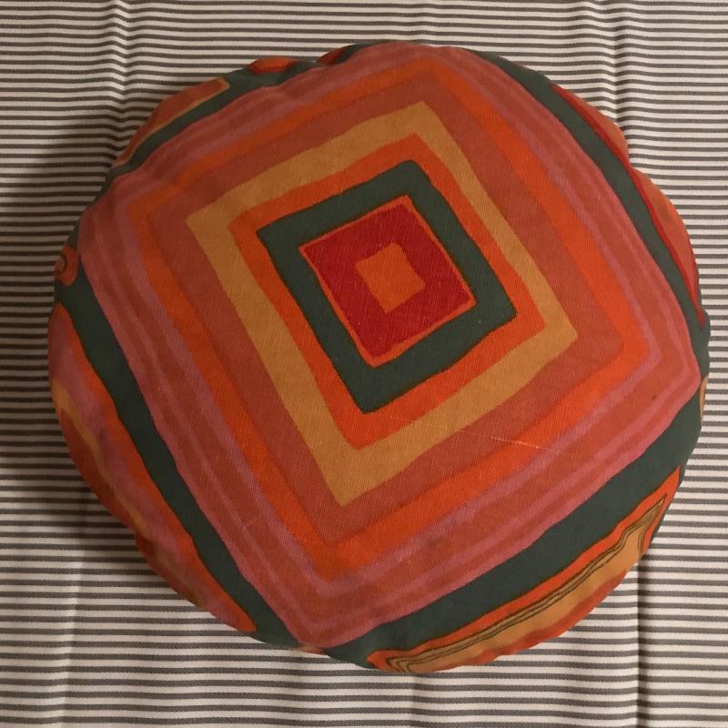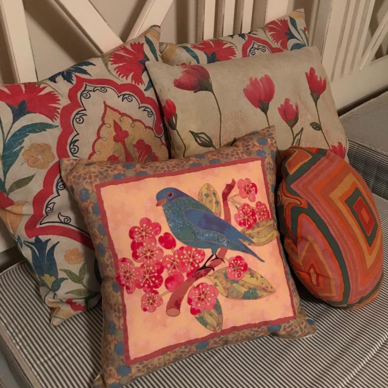 These five throw pillows have a similar color palette and would look great together on a bed or couch. Possibly ok for porch or deck furniture as well. Largest Pillow is 20” square and small round one is 14” in diameter.