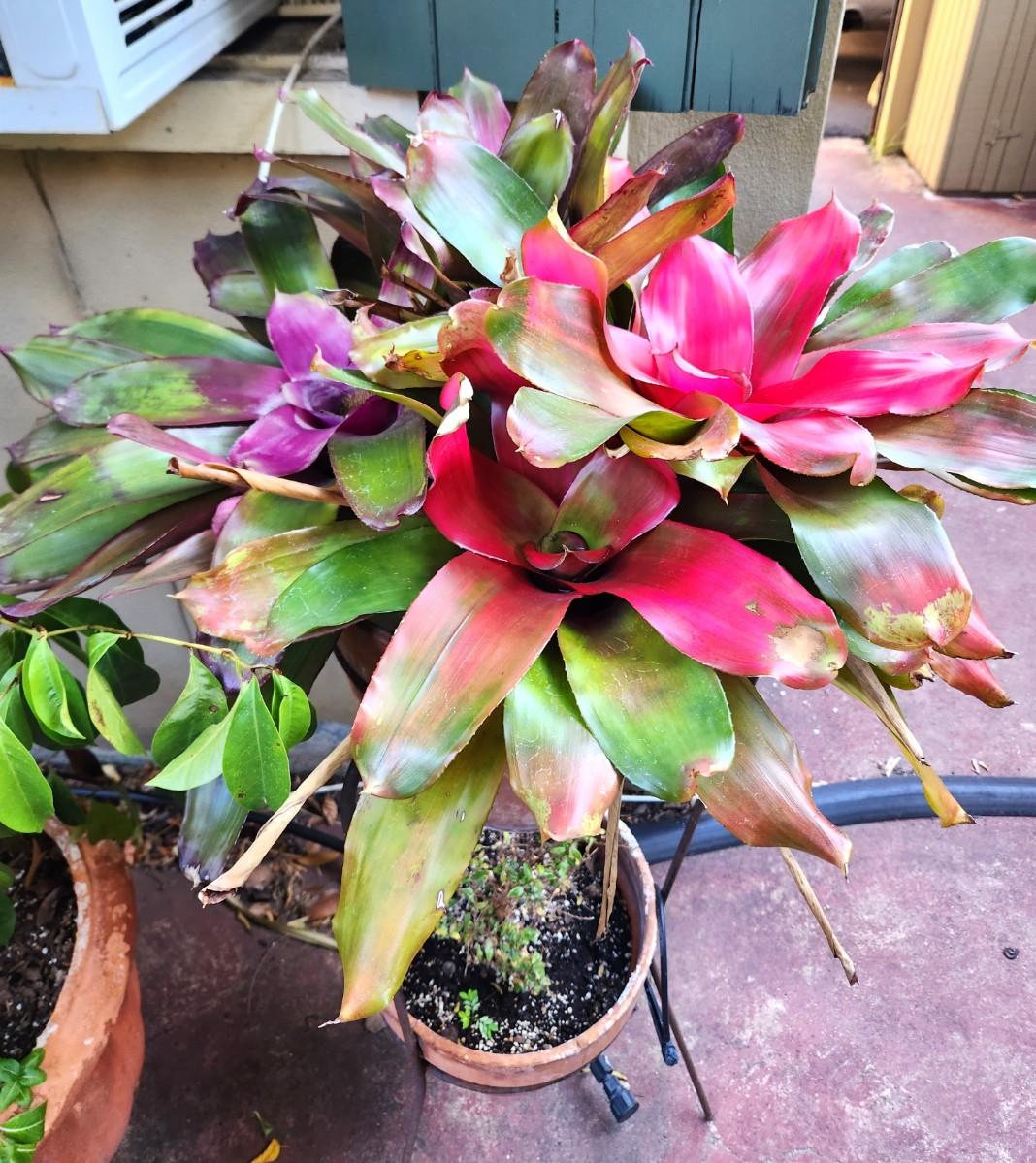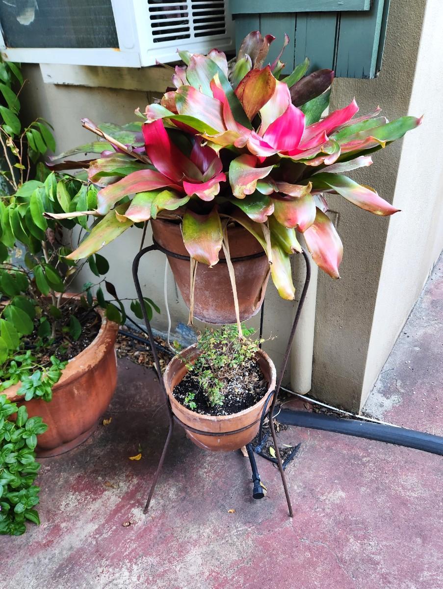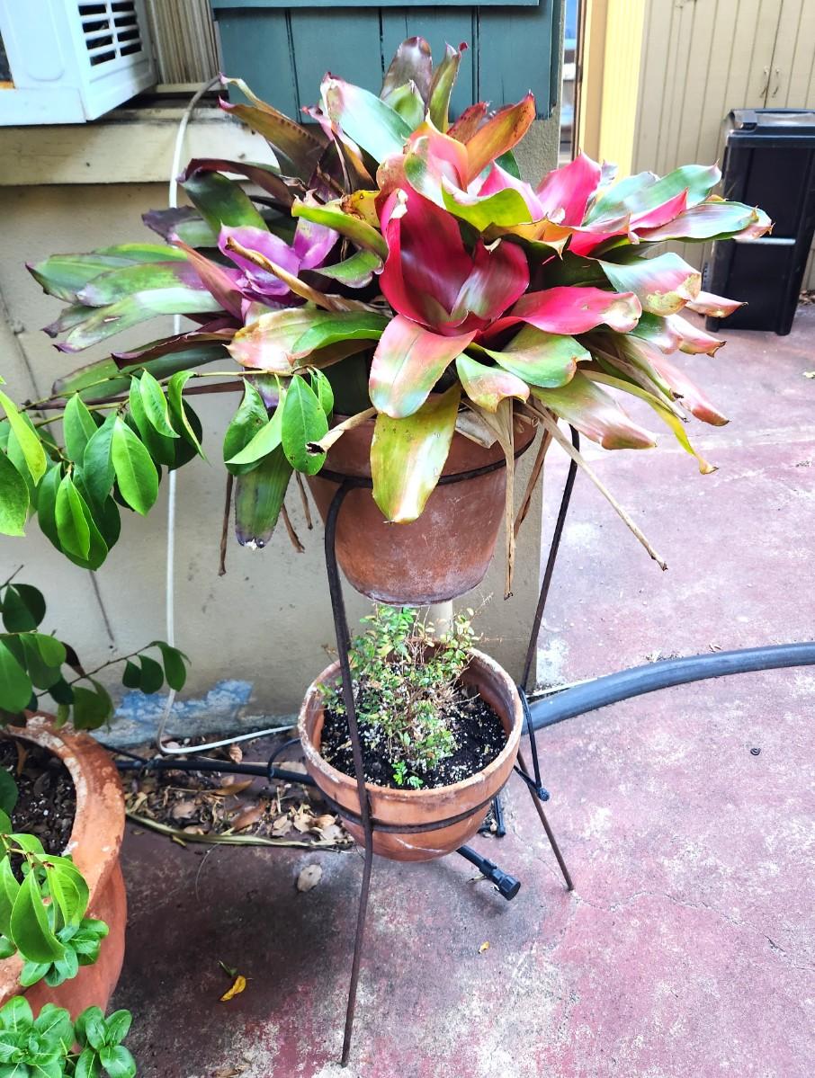 Lot #123 Dual Pot Stand - large Bromeliad on top