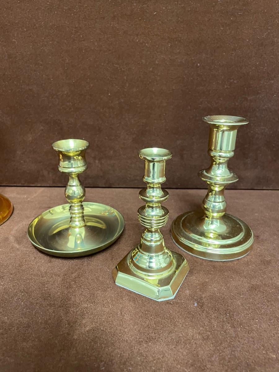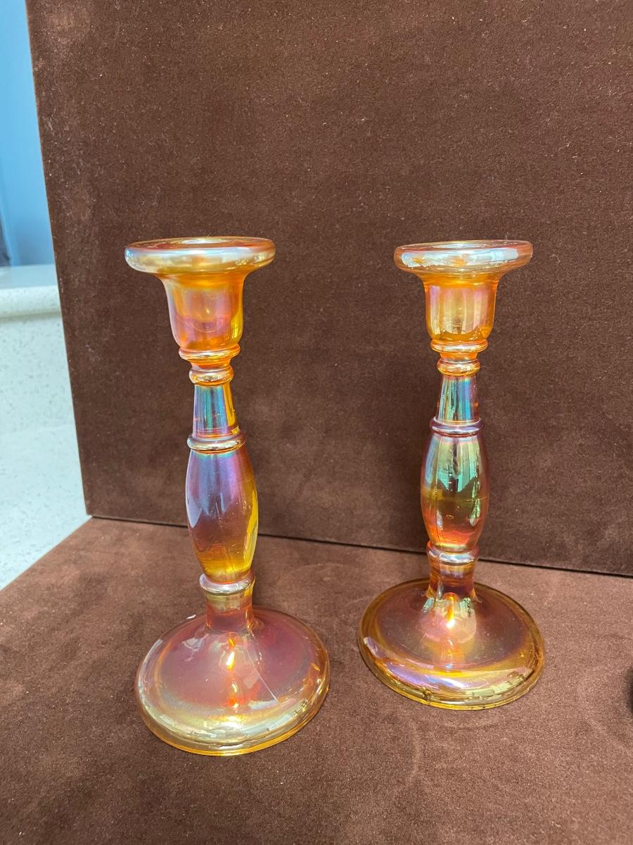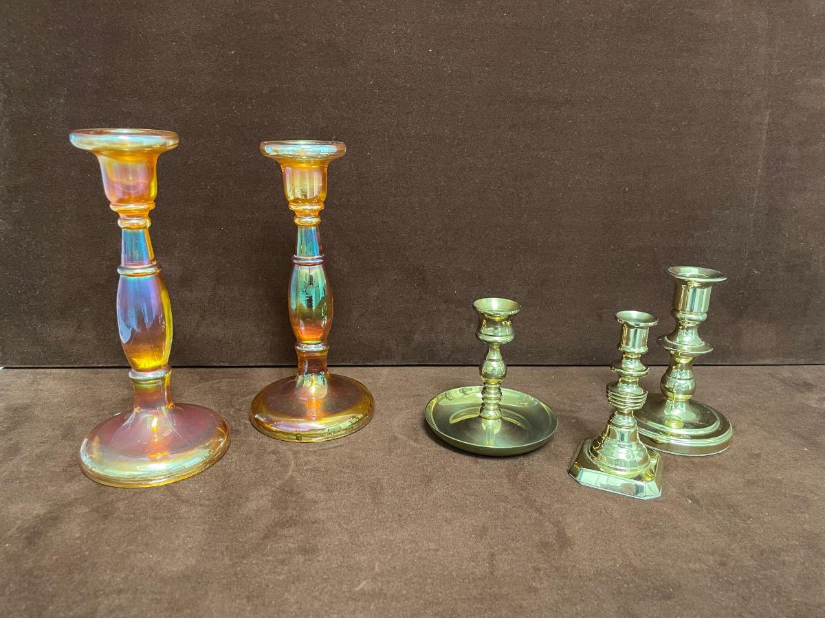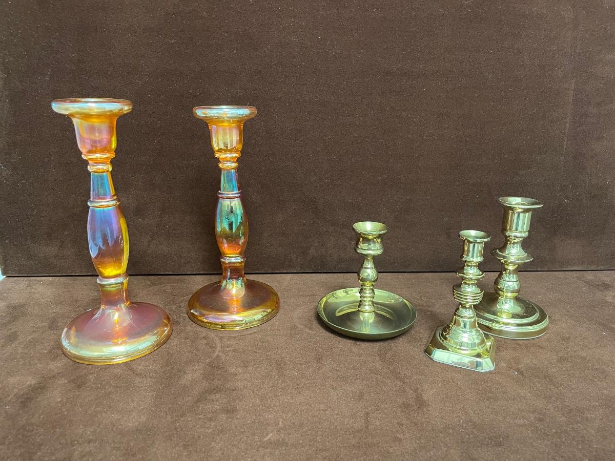 8" tall. Iridescent (Marigold, I think) carnival glass candlesticks are in perfect condition. Also included 3 brass candle holders
