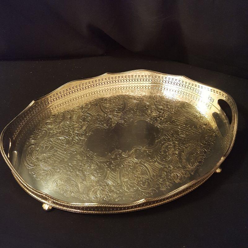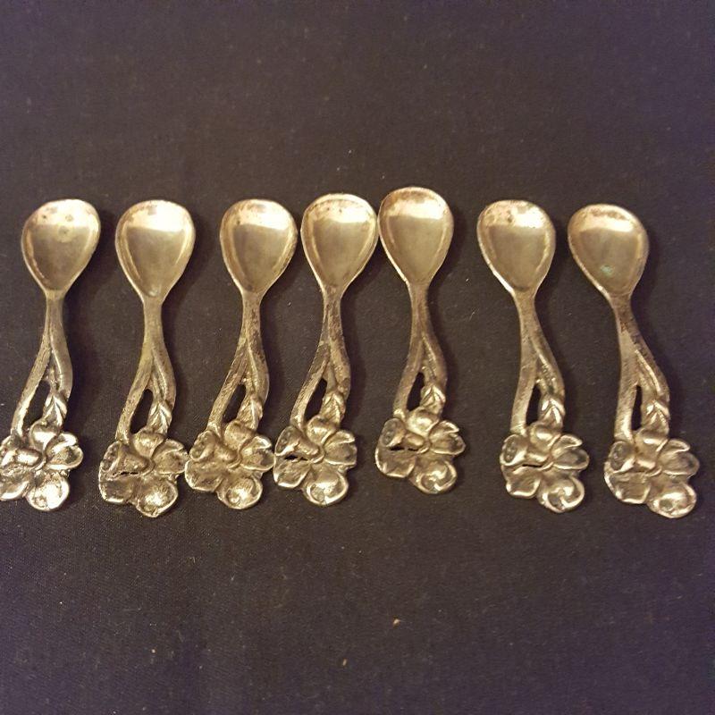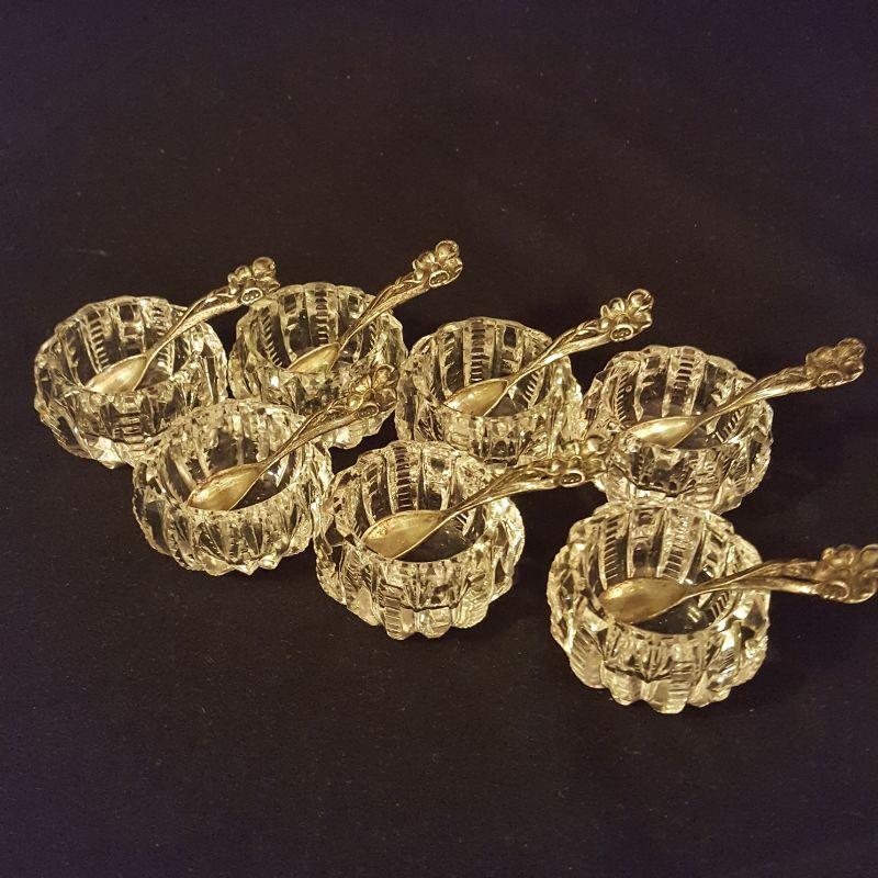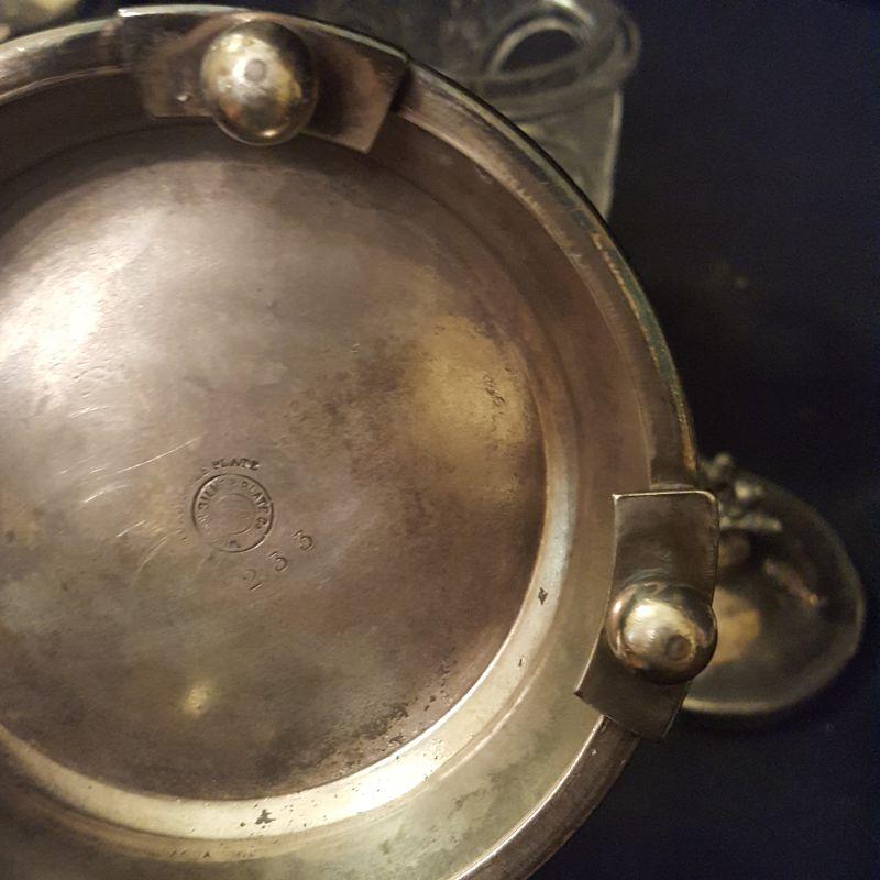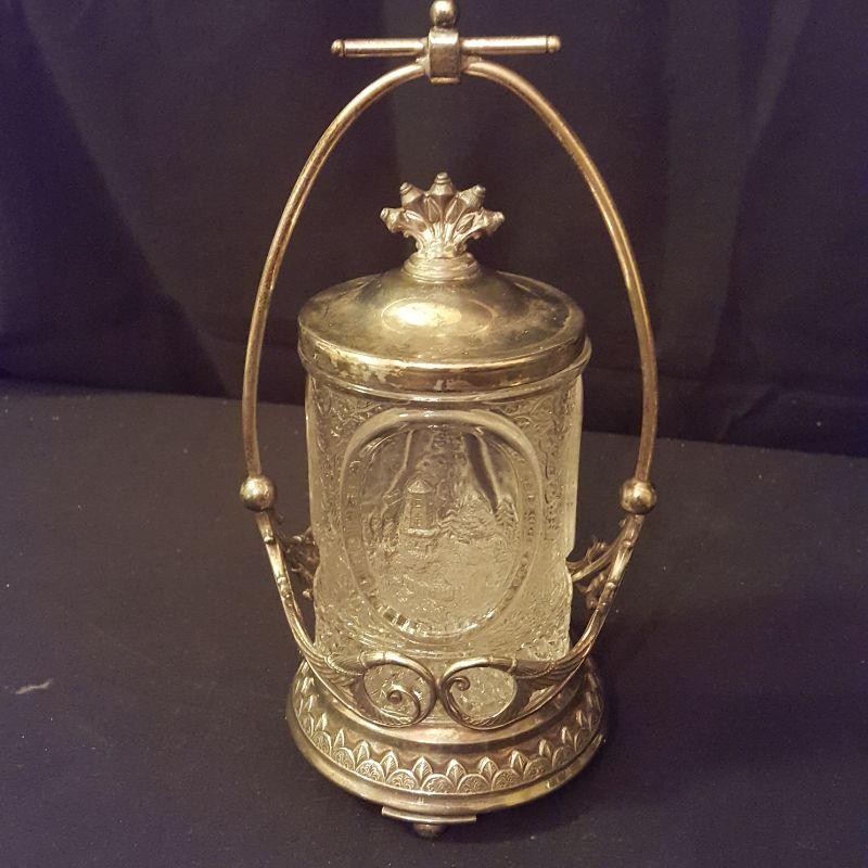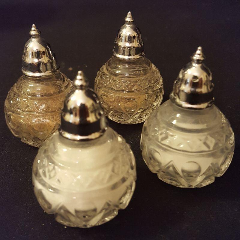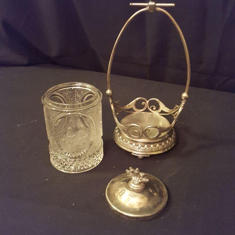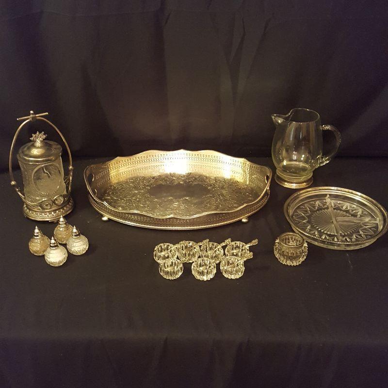 It's a party! This lot has a footed tray (16x11 in) that can carry all these beautiful items. An ornate pickle jar with beautiful details to start your party off right. This piece stands 9.5 inches tall and appears to be in good condition. Next is a glass pitcher with a silver rim that stands 6.5 inches tall, also in good condition. A glass relish dish with three sections that will add style to this party. A votive candle to set the mood, 7 salt bowls with 7 flowered spoons marked sterling and two sets of glass salt and pepper shakers to finish this lot off right! All items appear to be in good condition.