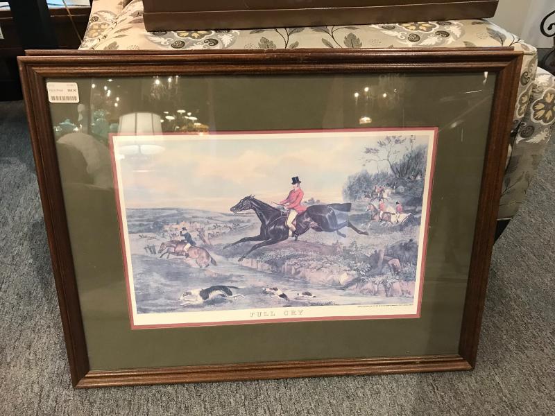 Nice set of four English hunt scene prints. Orignially published in 1883 by G. P. McQueen. Includes "The Meet", "Full Cry", "The Death", and "Returning From the Hunt". Each framed in dark wood and matted in olive green and deep red. 25 1/2" x 19 1/2" each