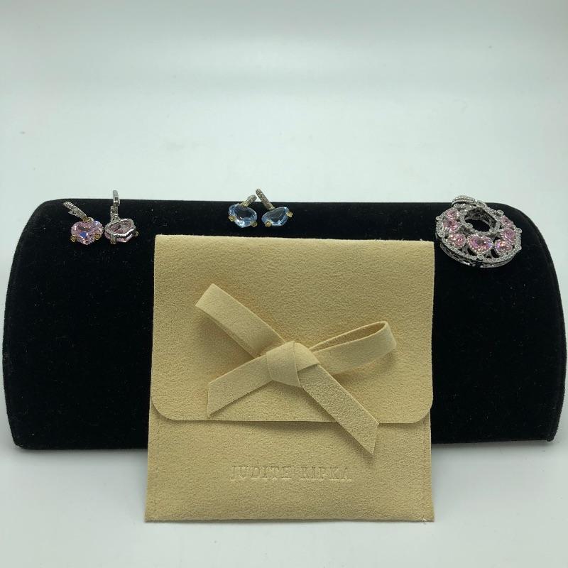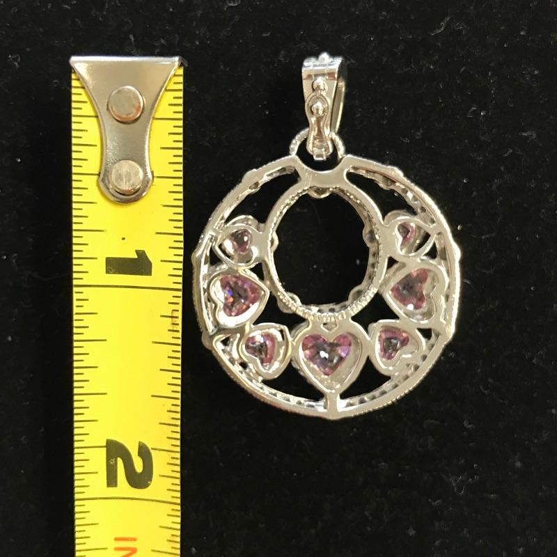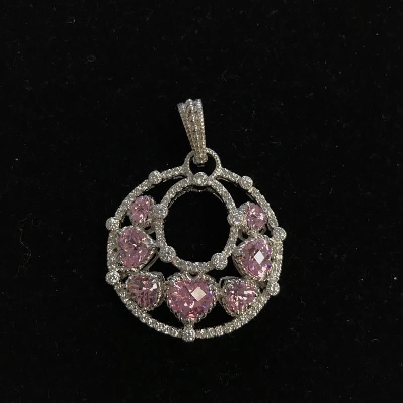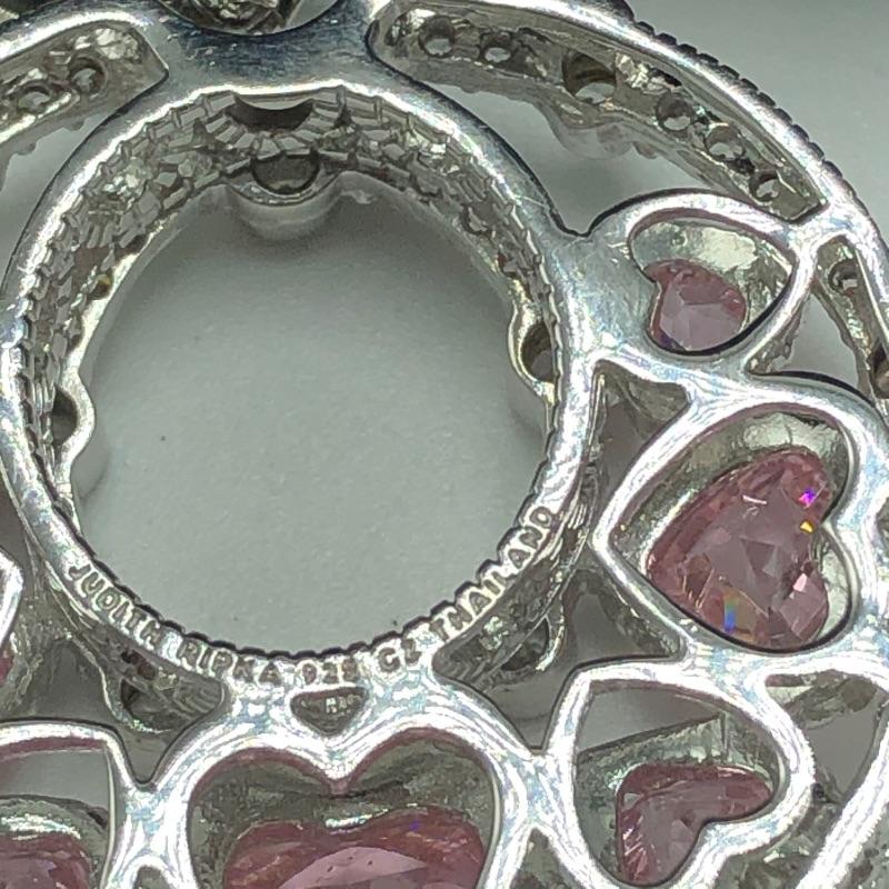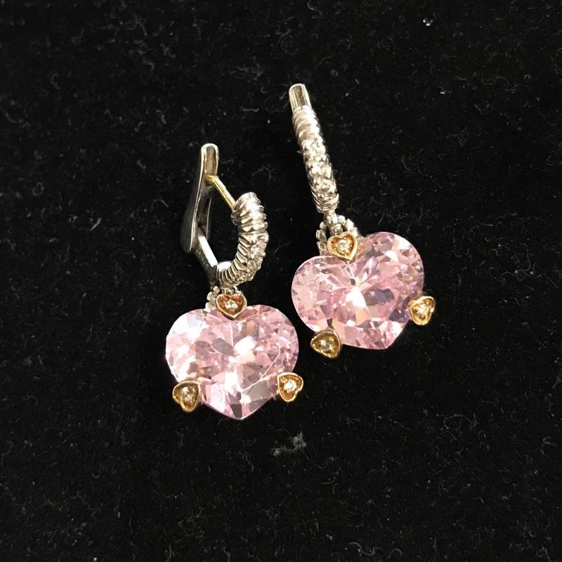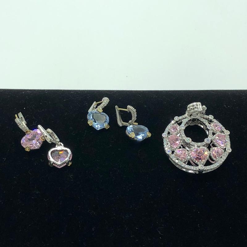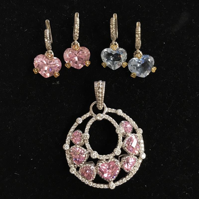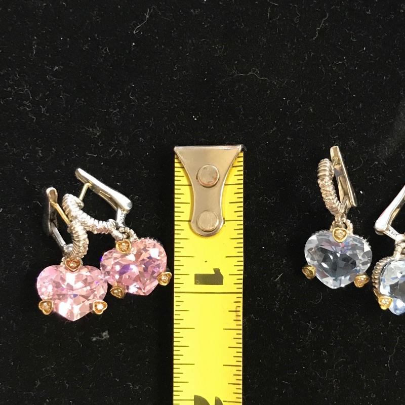 2 pair of lovely 18K 925 pierced earrings in blue and pink heart stones. Also a pink heart covered pendant by Judith Ripka marked 925 CZ (Cubic Zirconia).