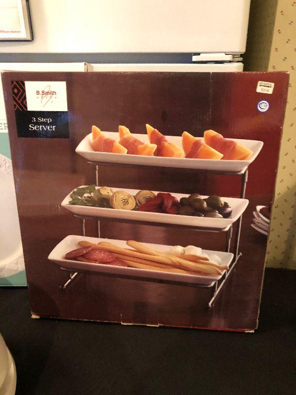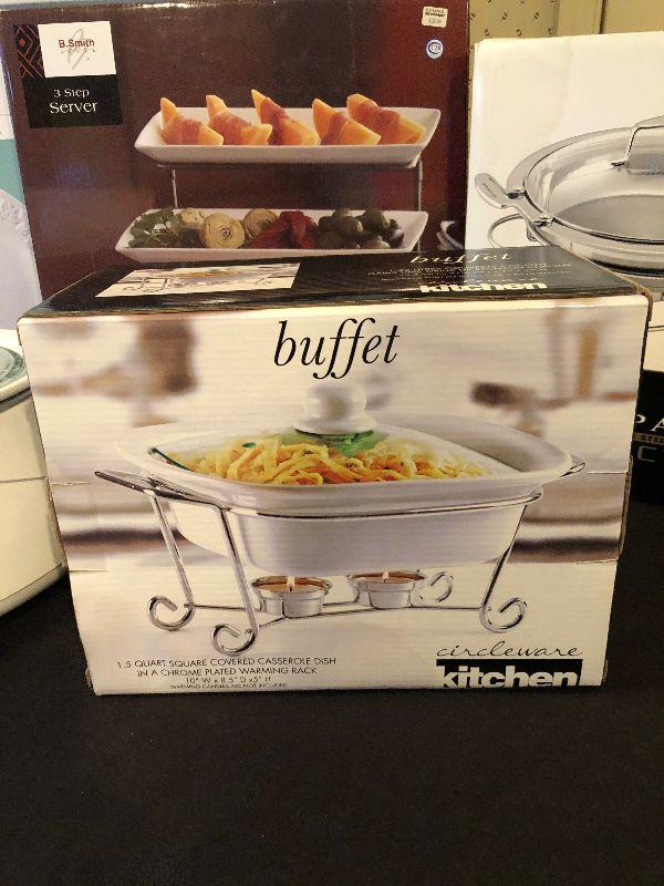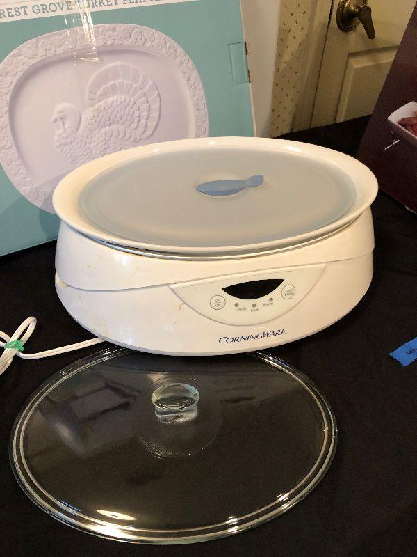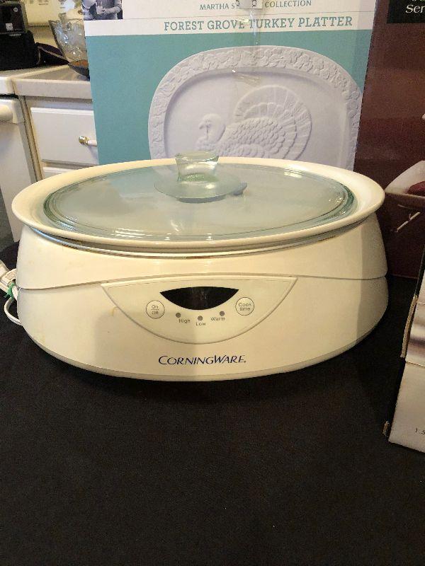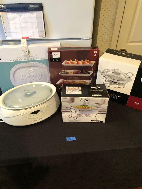 Assorted Kitchen Ware including a Corningware Slow Cooker, Forest Grove Turkey Platter, # Step Server, Scan Pan and Circleware Buffet.