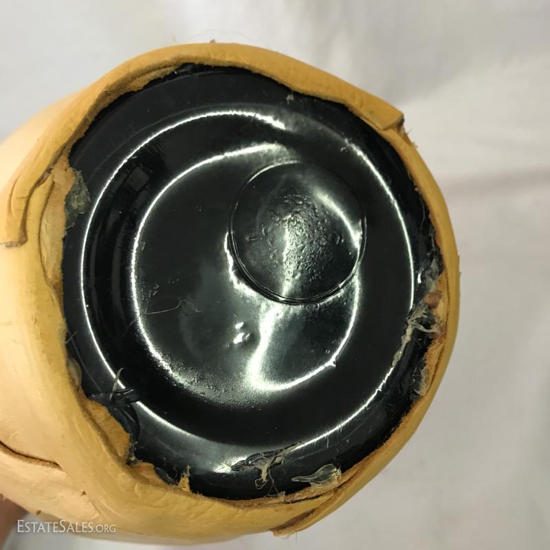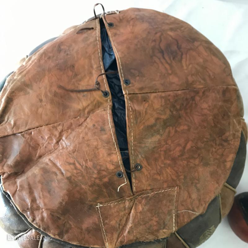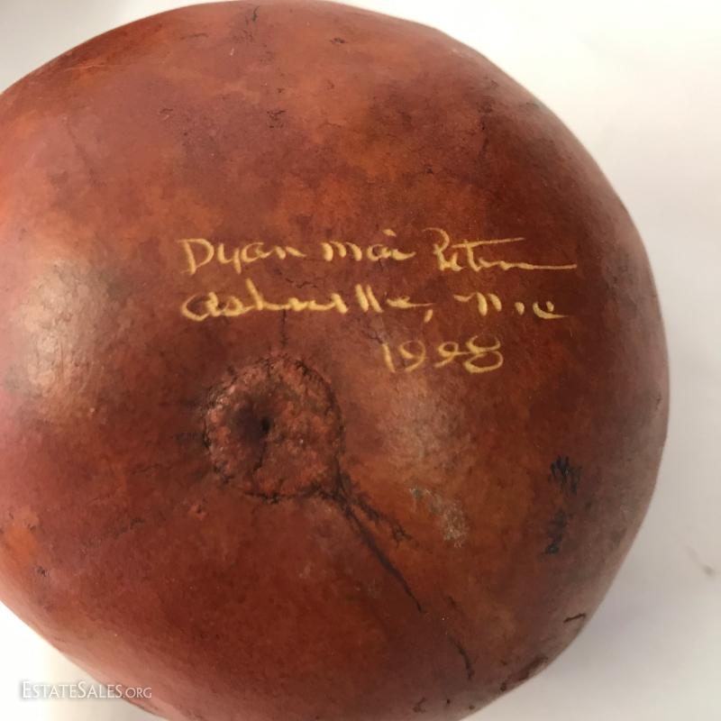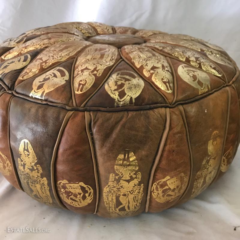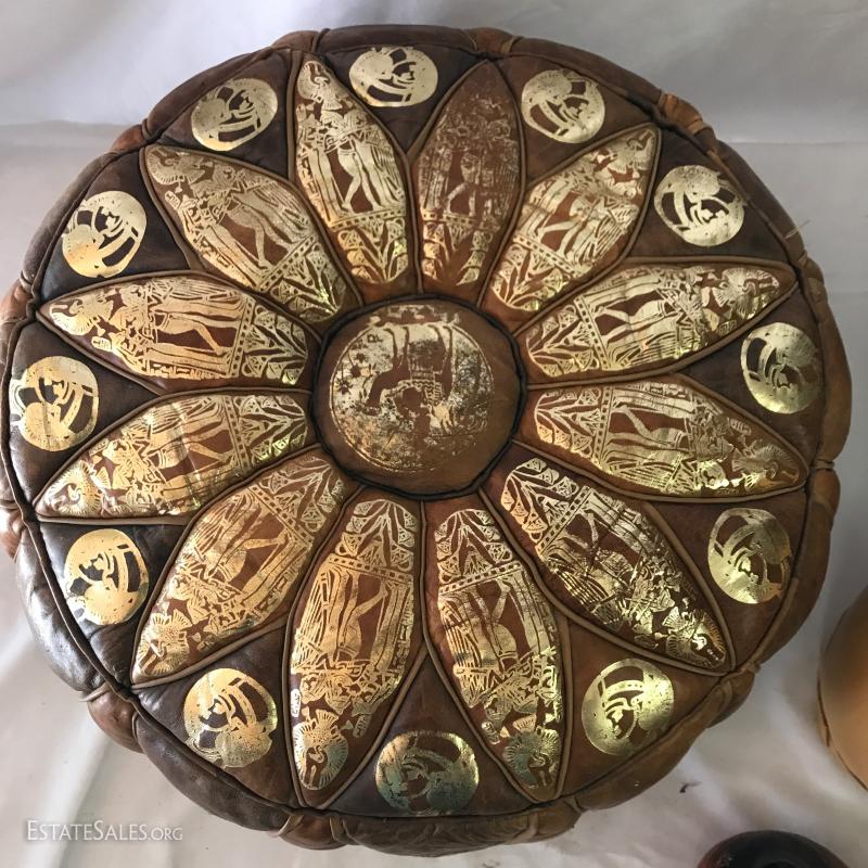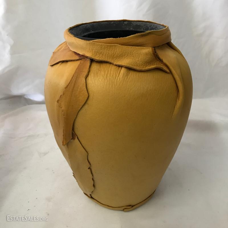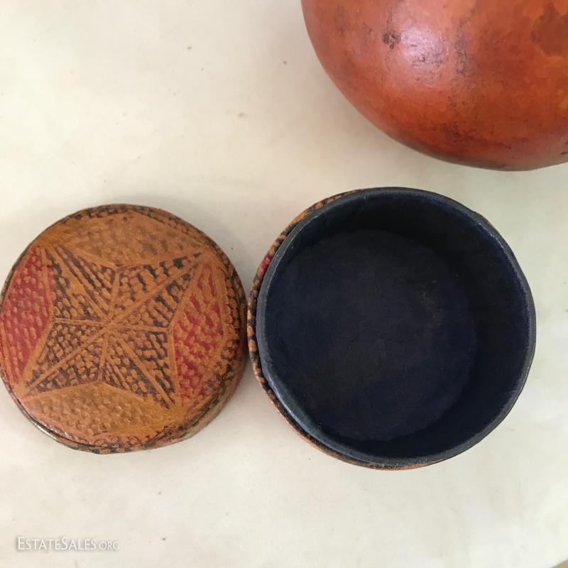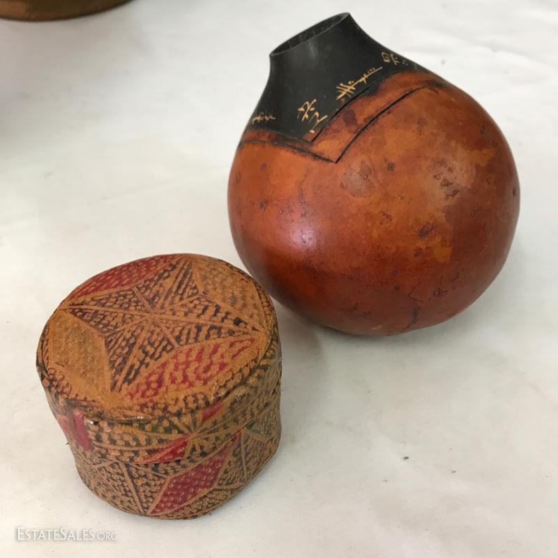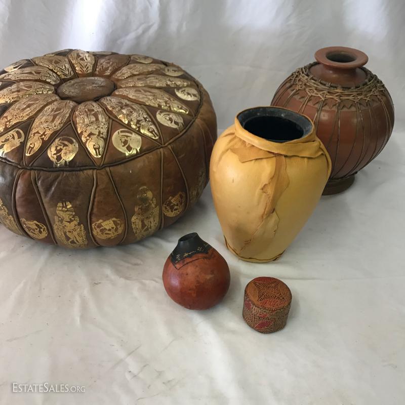 Leather poof cushion, 18"d and 10"h with gold painted design. Bottom has leather ties. Yellow leather covered vase is 10"tall. Carved clay pot with cane covering attaching wood base. 11" tall. Small signed artist carved gourd. Also includes small sheep skin covered box. Shipping available or local pick up in Waynesville, NC.