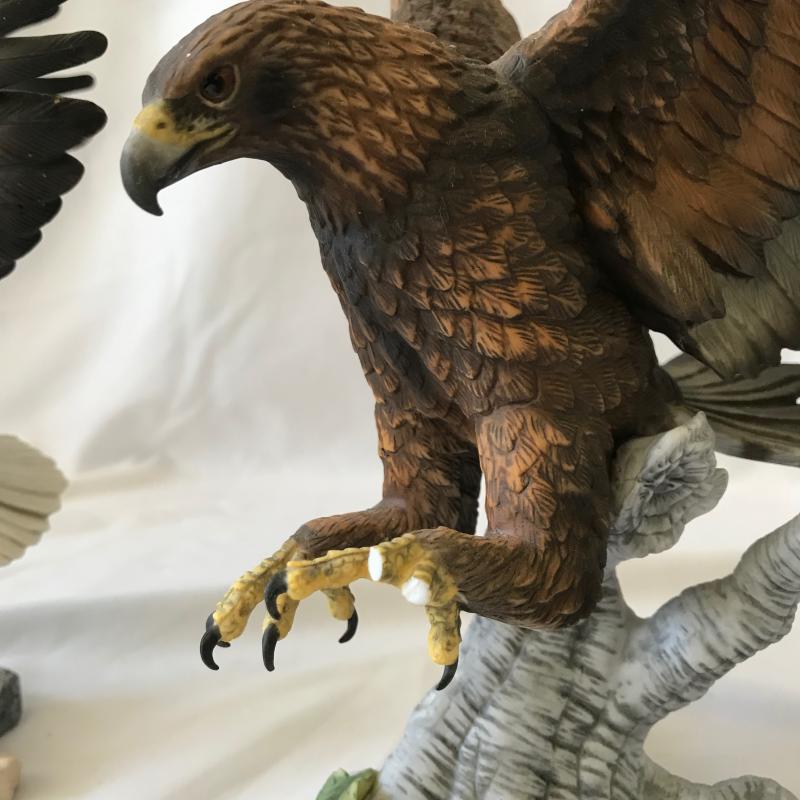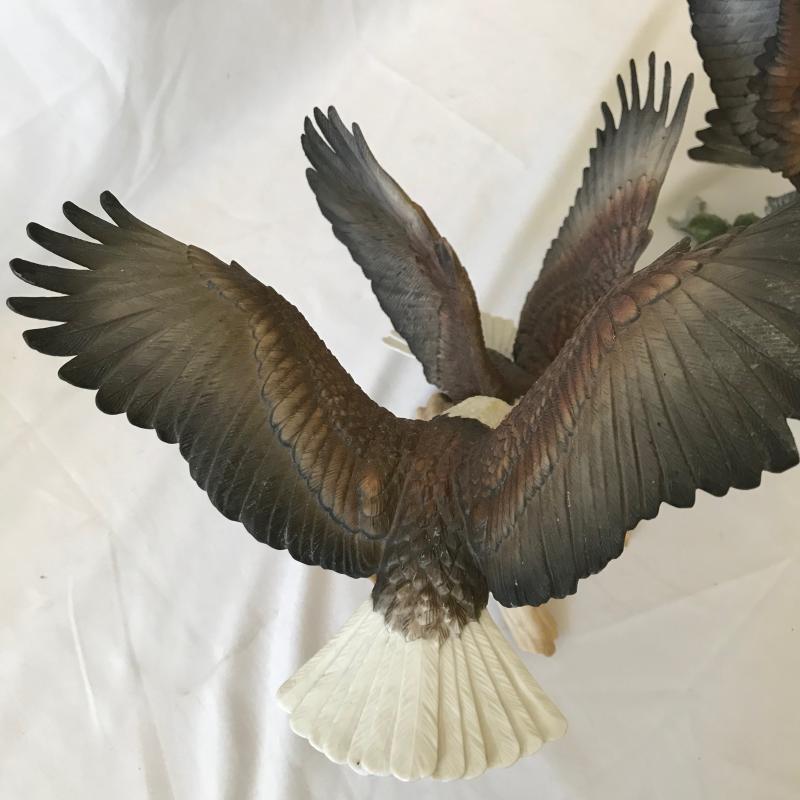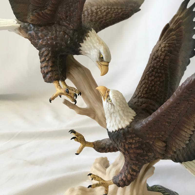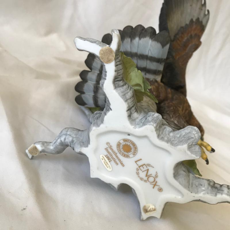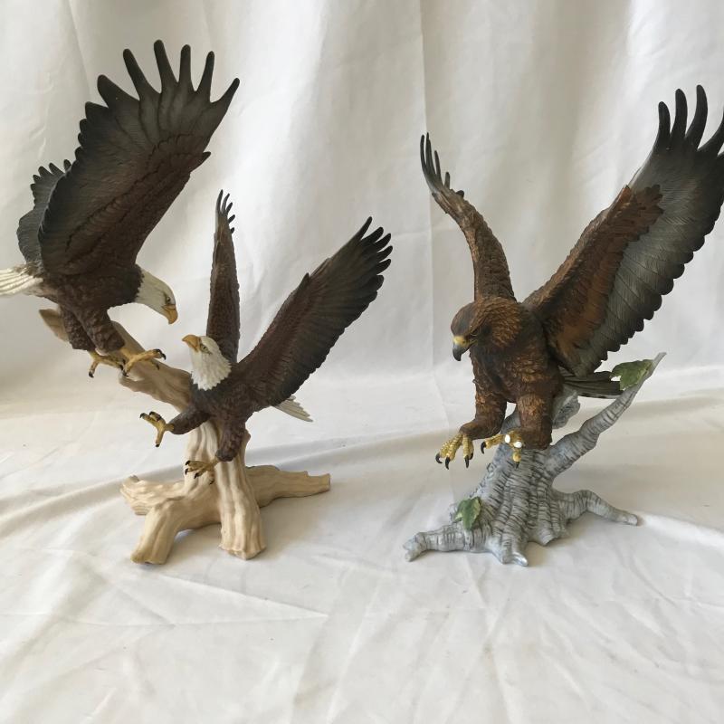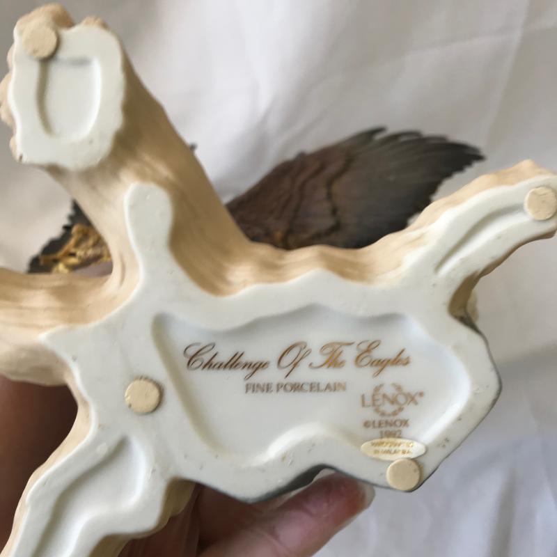 Two beautiful eagle figurines. Both by Lenox. The single eagle is a Smithsonian Institution 1991 Lenox Eagle and has small break on foot. The other says “Challenge Of The Eagles” and Lenox 1992 on the bottom. No visible chips. This one measures approx 10” x 11.5” x 13”h. Shipping or local pick up.