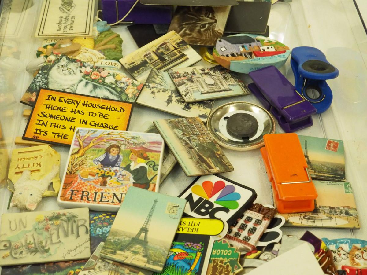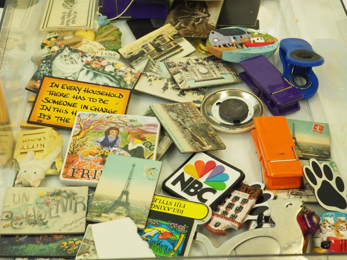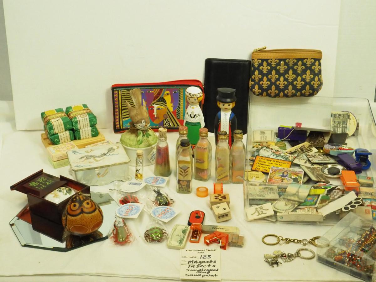 Lot 123- Lots of magnets, Many are cats and cat theme. Sandlewood soap , mini office Supplies, Gourd Owl, Mini sand paintings in bottles., Key rings with charms, Small bags Laurel Burch. beaded Lizard, Bagged plastic insects, Dragonware procelain ashtrays in Dragon box. Wood box with small round container, Dutch figurines wooden.