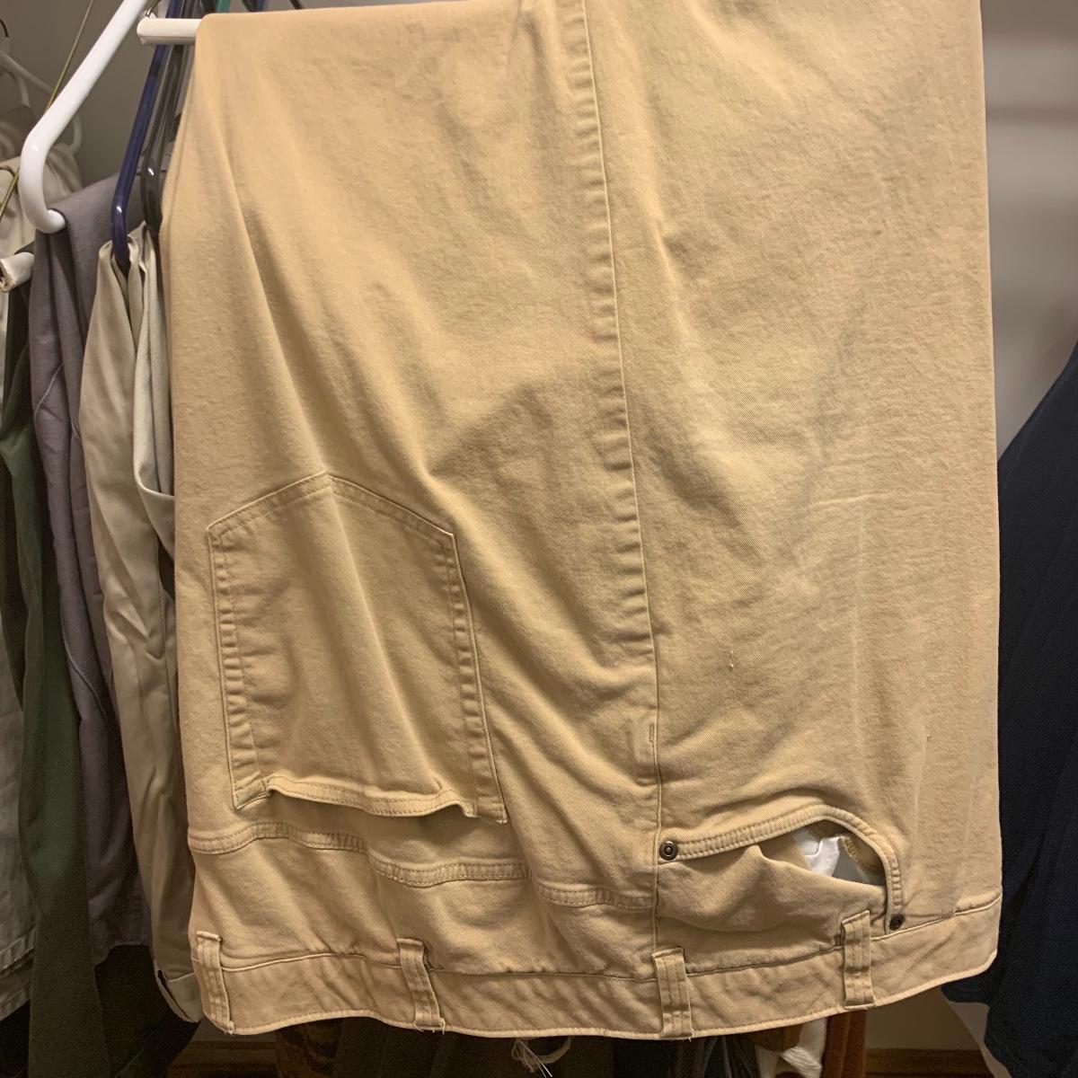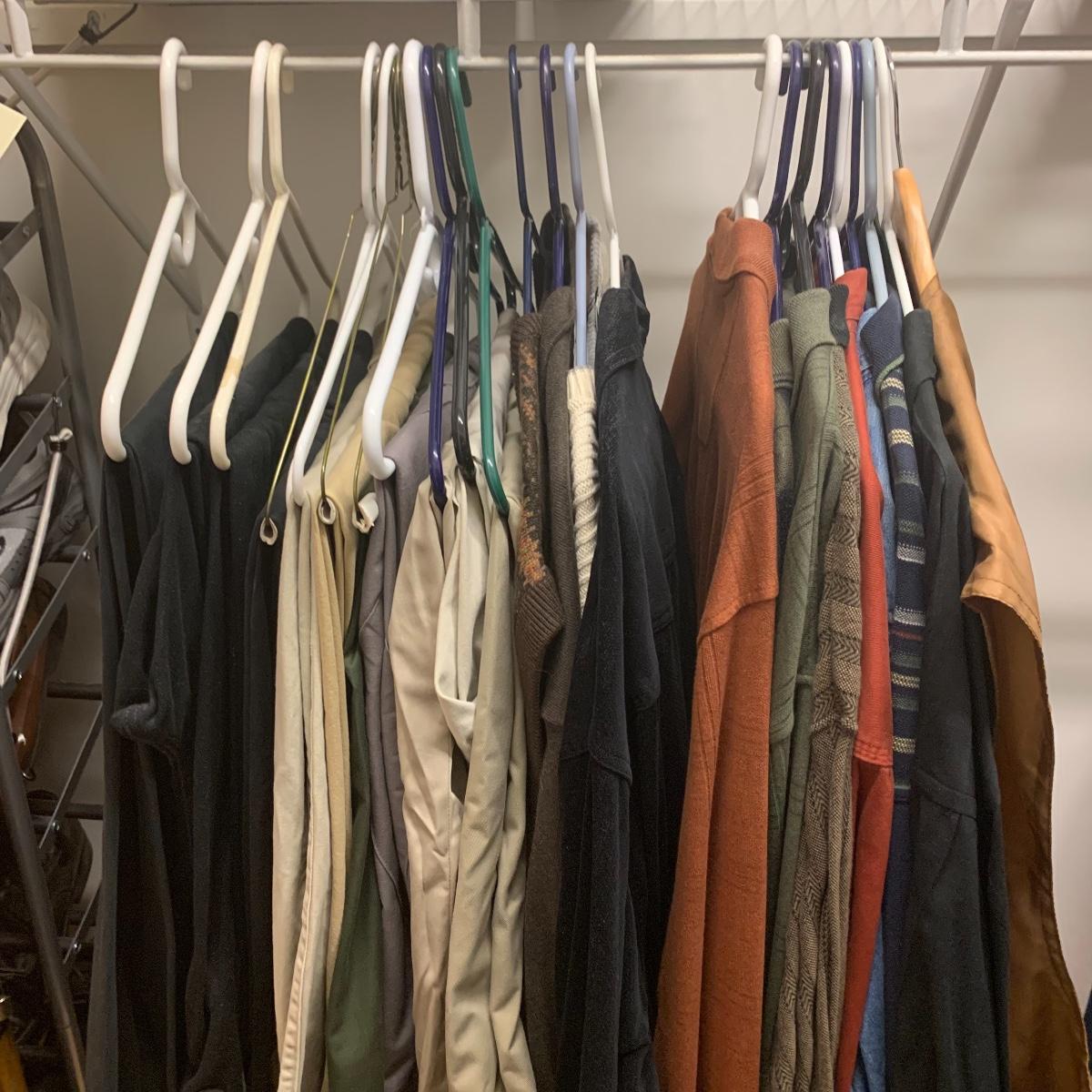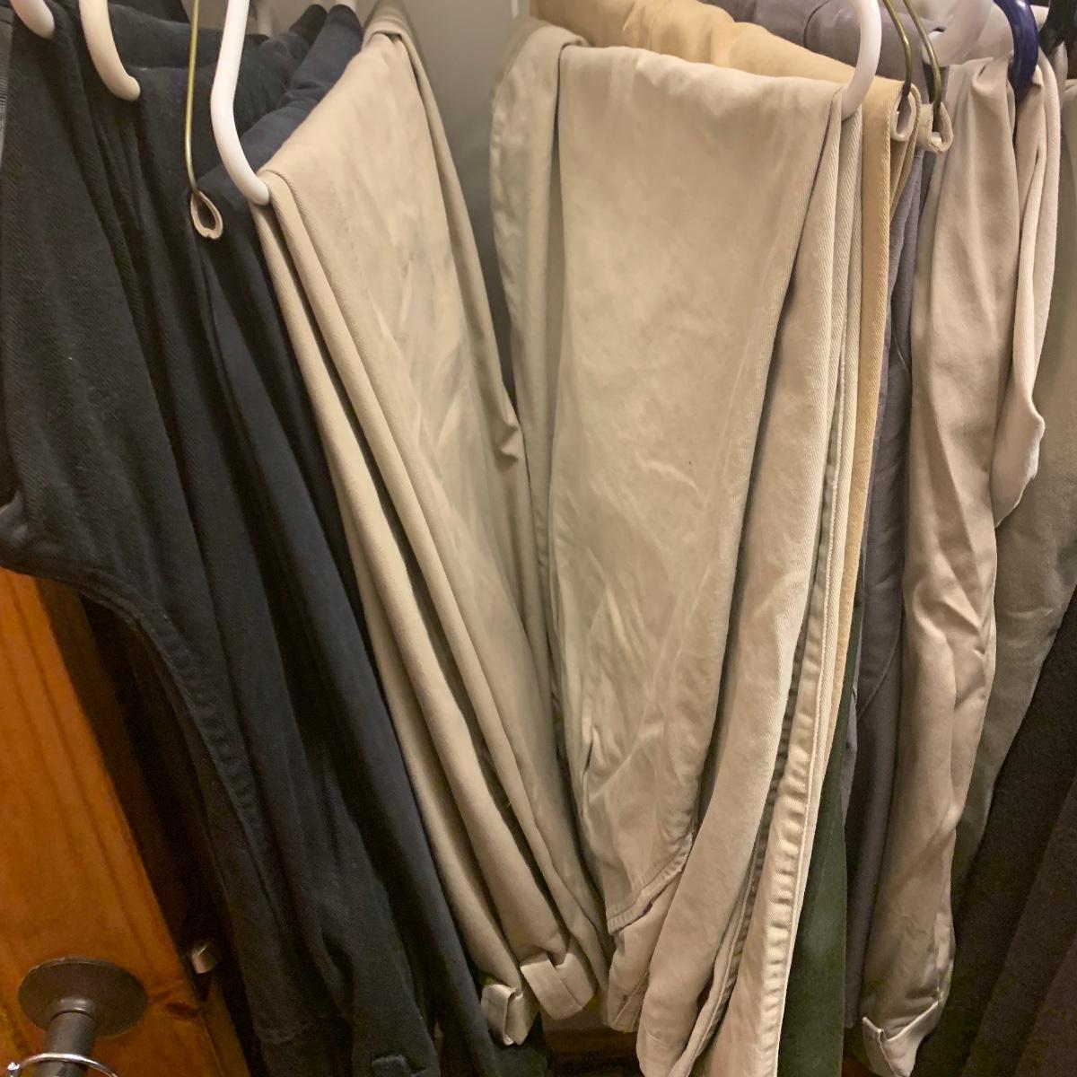 Add dressy casual clothes to your wardrobe. This lot includes several pairs of khaki pants, black jeans, and dress pants. There are twelve pairs in all. Also included are nine colored shirts, two beautiful sweaters, wooden hangers and a suede vest. All garments are in good condition and are size 4X. Local pickup only