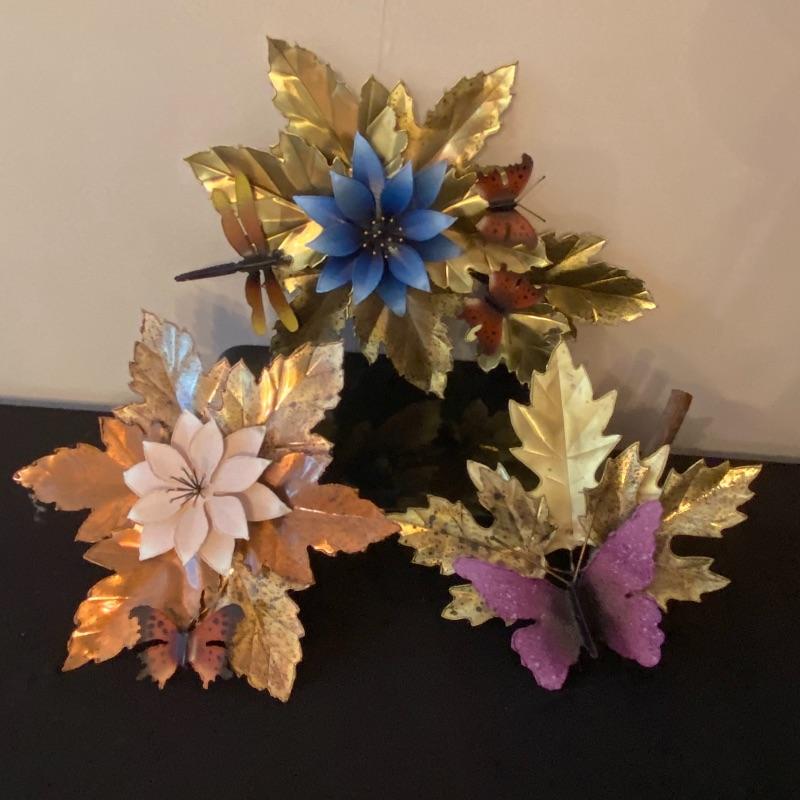This unique art bundle will have you ready for any season! The floral and butterfly inspirations on the detailed metal leaves are stunning and stand to liven up any wall. These pieces are made of metal and attached with copper wire to a solid piece of wood for hanging. The largest peice of art measures to be 13.5” x 9”. Shipping available.