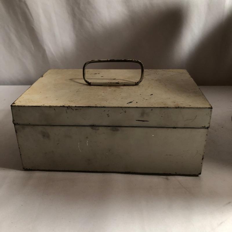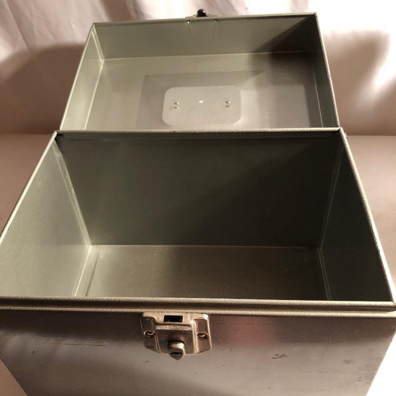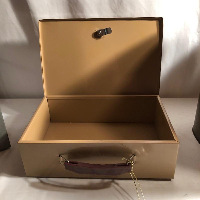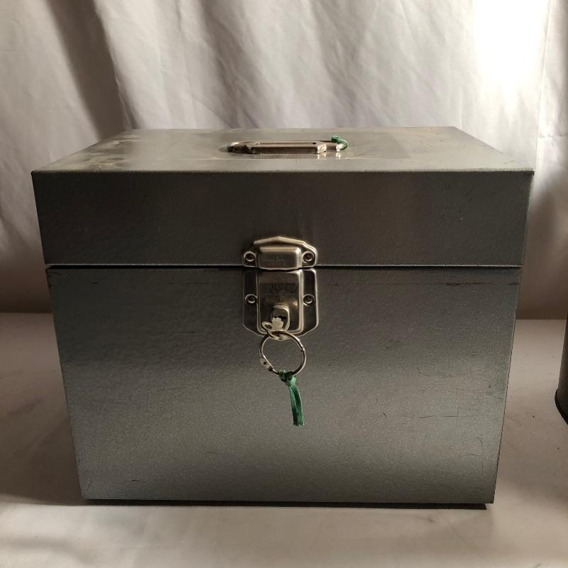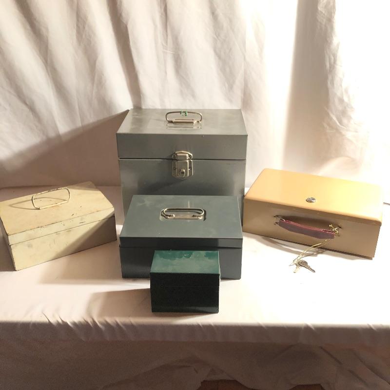 A total of five metal storage boxes here that are a mix of vintage and newer. Two of the five have keys and the largest box measures 9” x 12.5” x 10”. All boxes appear to be in good condition.