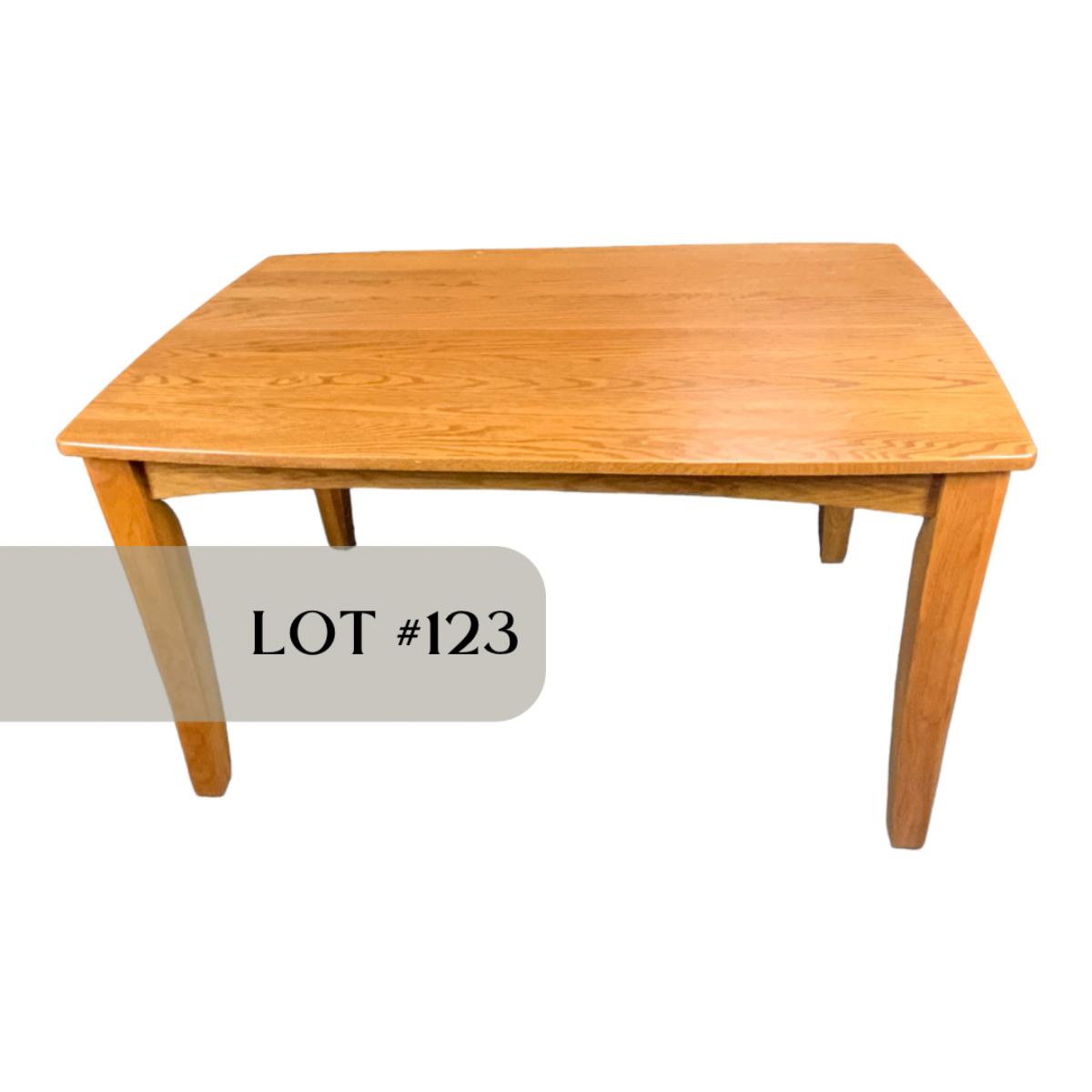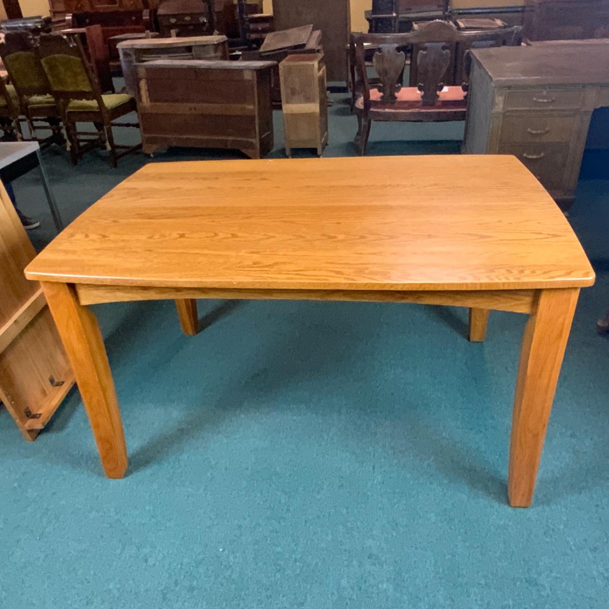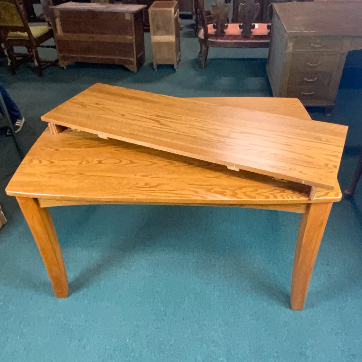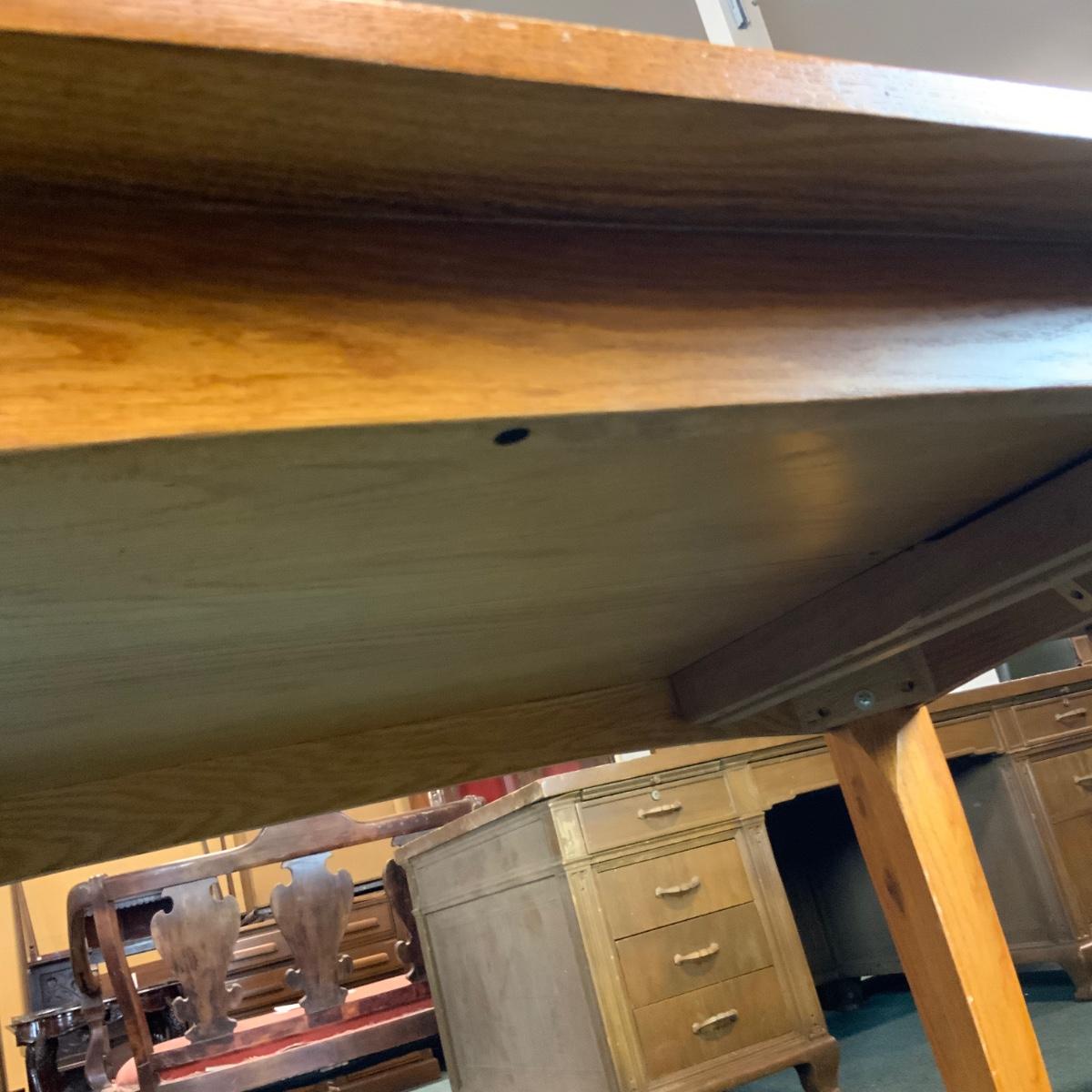 Oak Table with Leaf. Clean lines, nice design. Ready to use today! //::\\ Please see photos for details and condition. No attempt has been made to hide any imperfections. All items listed in this auction are warehouse items, and need to be cleaned. A majority of the items need restoration as well. All items are sold AS IS and WITHOUT GUARANTEE. If you are uncertain about an item, DO NOT BID. Due to the nature of this online auction in-person inspection is HIGHLY recommended. All Sales are FINAL. Pick Up Times are FIRM. Please confirm with your own schedule that you can pick up in the scheduled times listed in the Terms and Conditions. Any questions please message the auctioneer. DO NOT Contact The Harp Gallery.