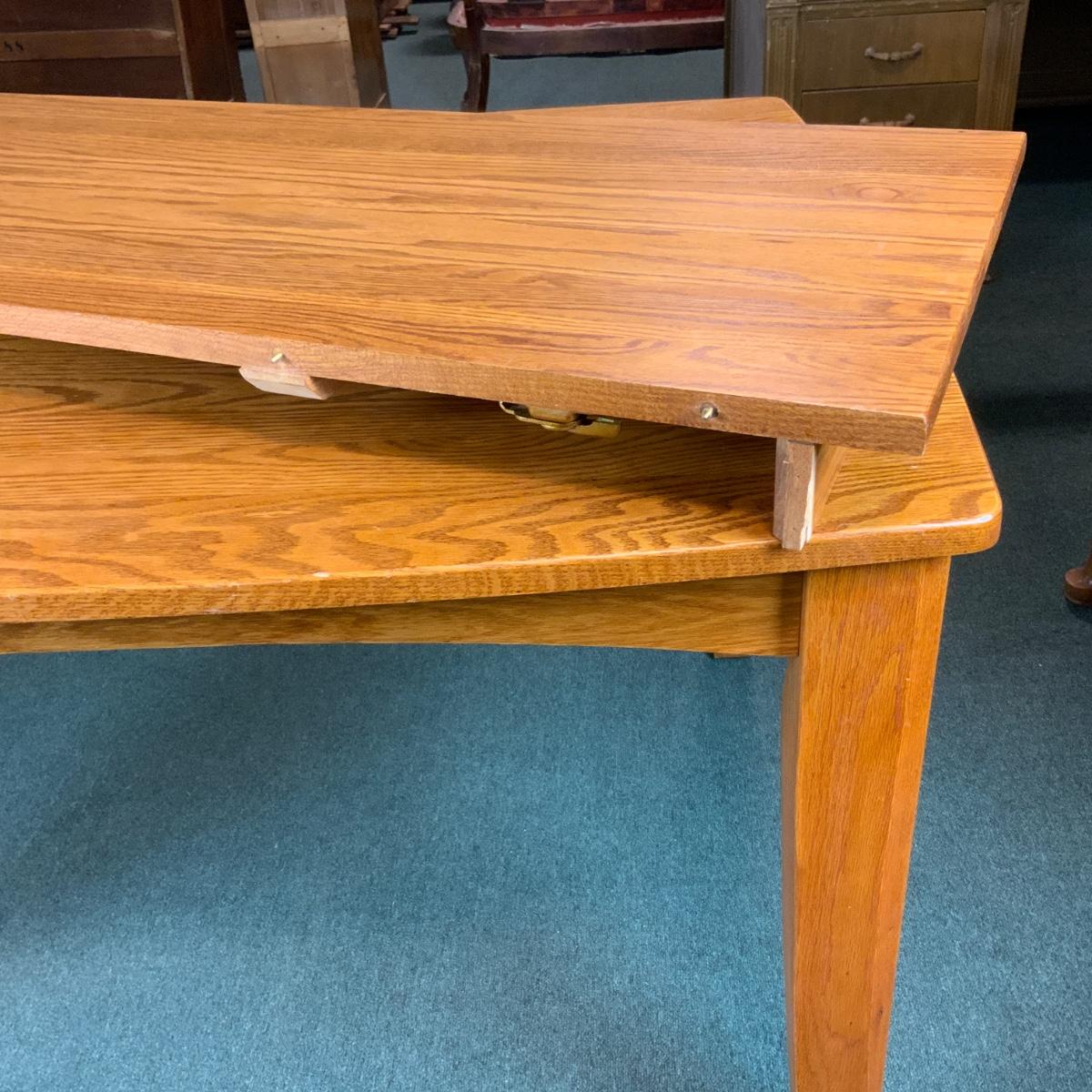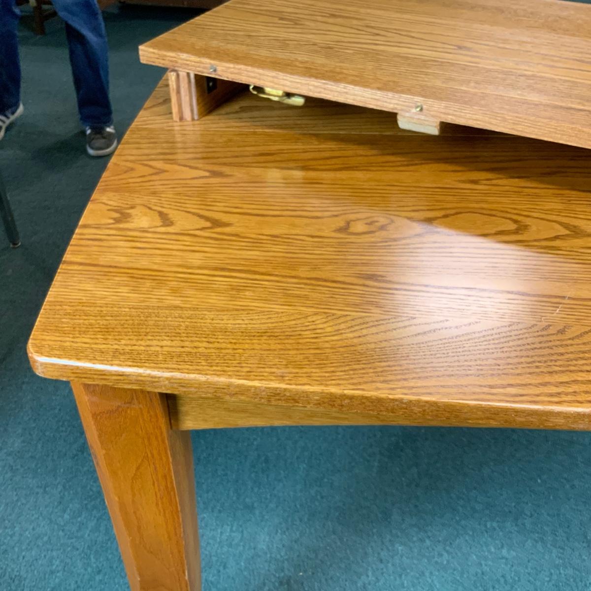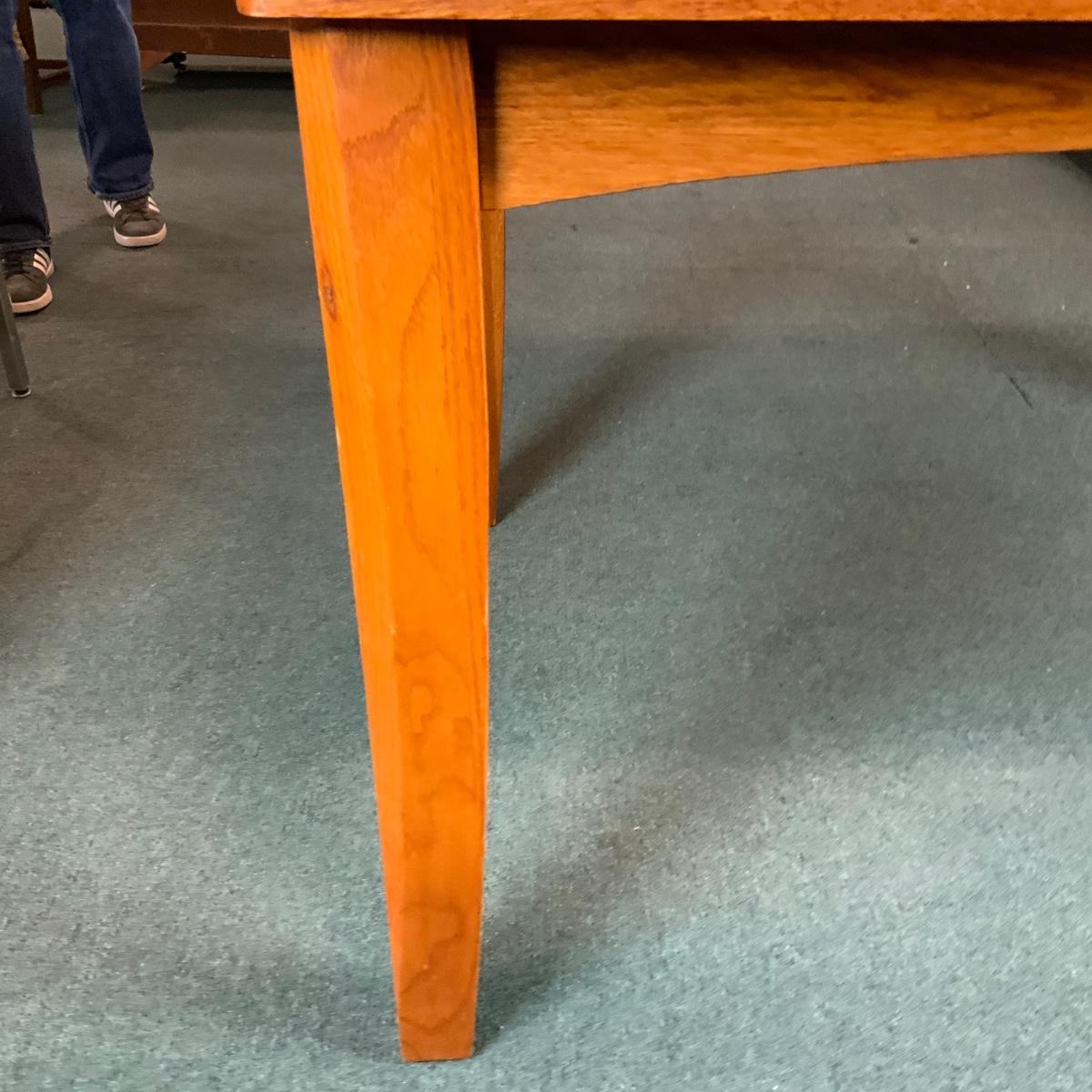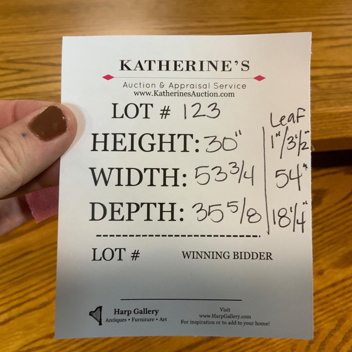 Oak Table with Leaf. Clean lines, nice design. Ready to use today! //::\\ Please see photos for details and condition. No attempt has been made to hide any imperfections. All items listed in this auction are warehouse items, and need to be cleaned. A majority of the items need restoration as well. All items are sold AS IS and WITHOUT GUARANTEE. If you are uncertain about an item, DO NOT BID. Due to the nature of this online auction in-person inspection is HIGHLY recommended. All Sales are FINAL. Pick Up Times are FIRM. Please confirm with your own schedule that you can pick up in the scheduled times listed in the Terms and Conditions. Any questions please message the auctioneer. DO NOT Contact The Harp Gallery.