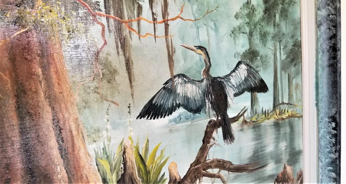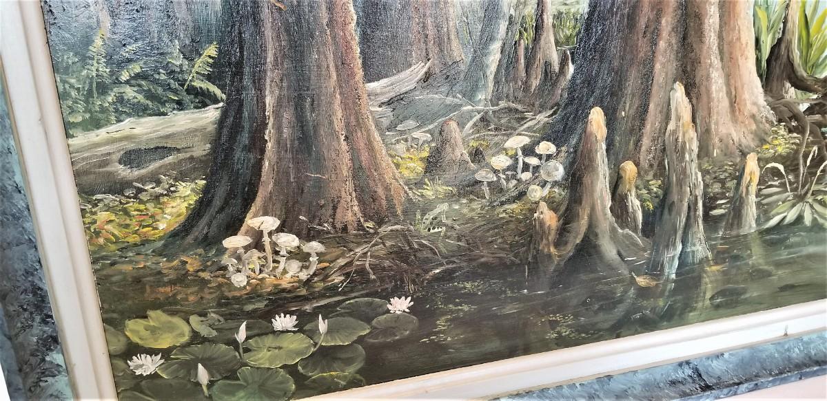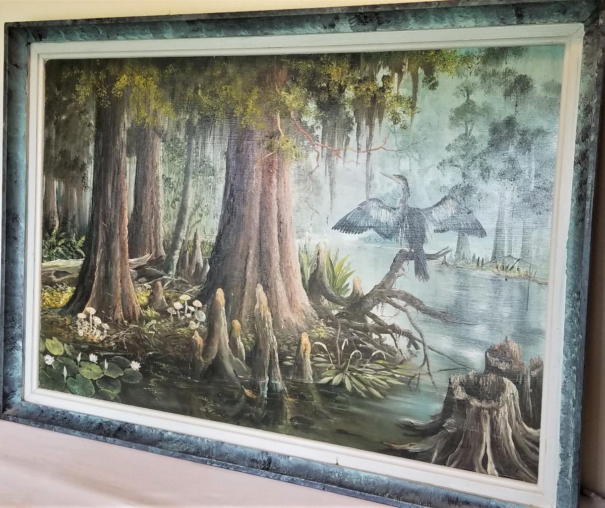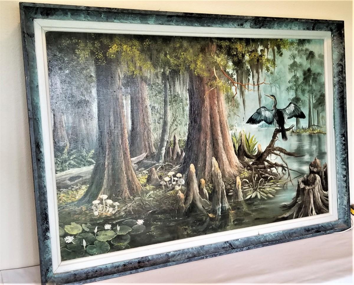 David Robert Rossbach was a Louisiana Listed Artist (1938-2009) who was known for Louisiana and Swamp scenes. This is a large painting (measures 27.5" tall, 39.5" across). Full of detail - very well executed. Rossbach taught for many years at the David Rossbach School of Art in Old Metairie. Well Executed, great condition.