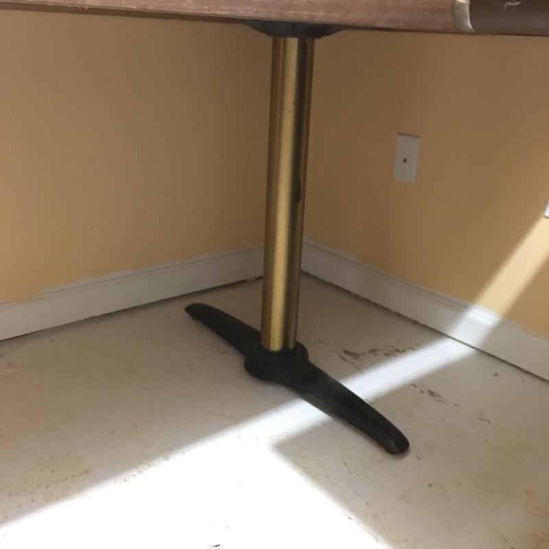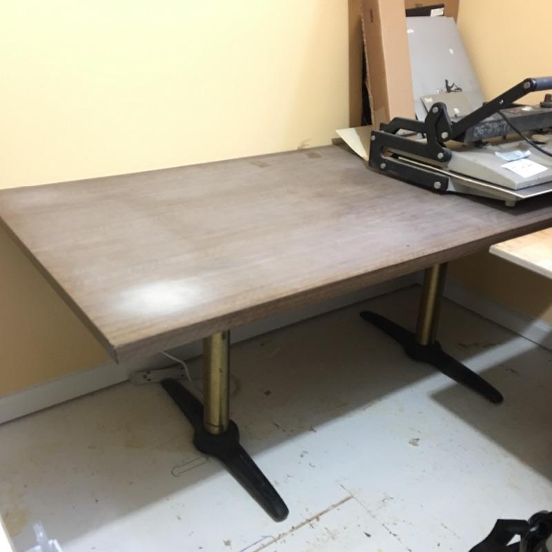 Sturdy pair of pedestal tables with Formica tops. Great tables for crafting or in your shop or anywhere else you need a sturdy table. Tables only, items on and under tables not included. Tables measure 35.5” x 71.5” x 29”.
