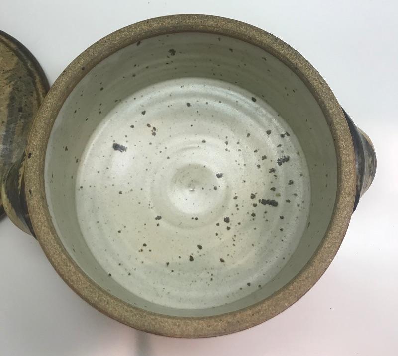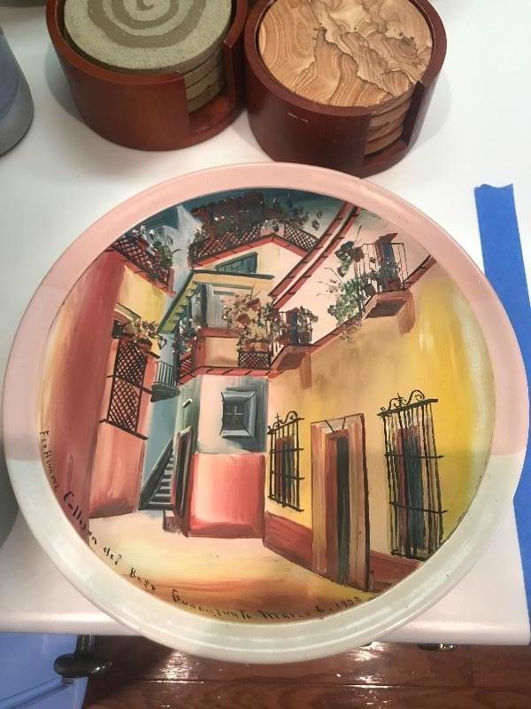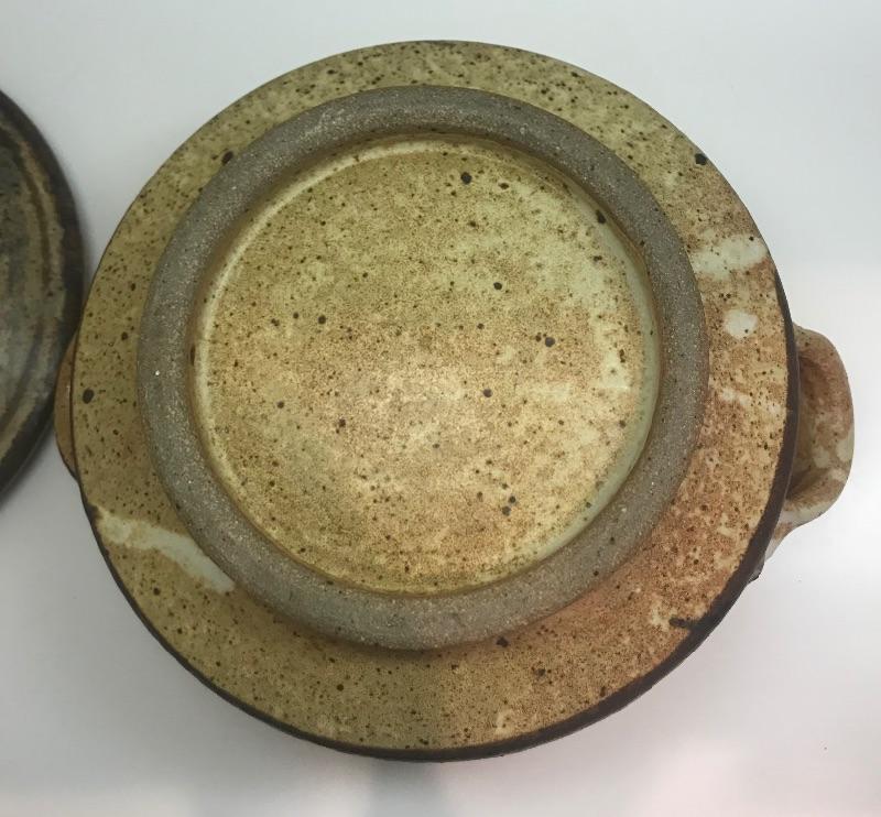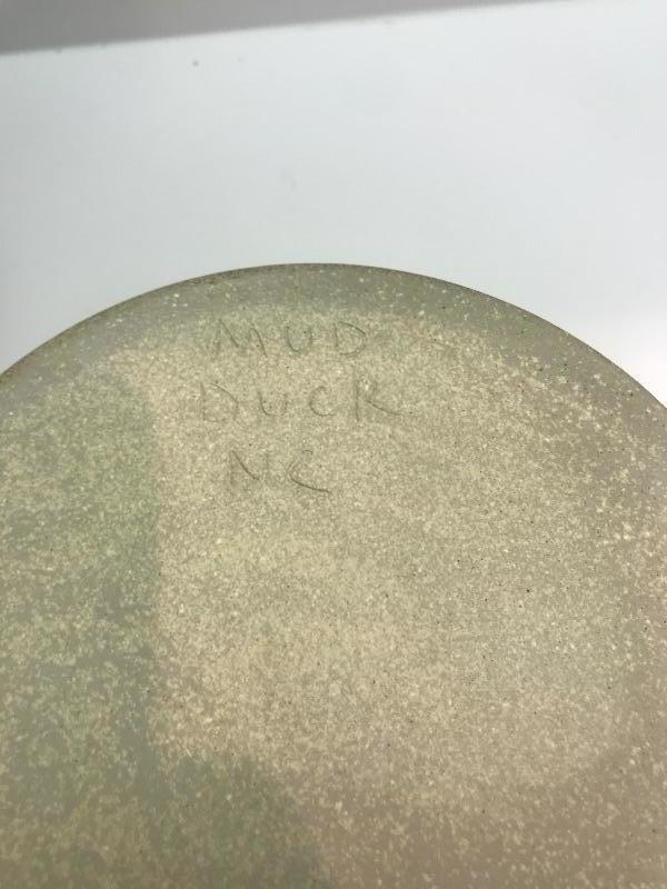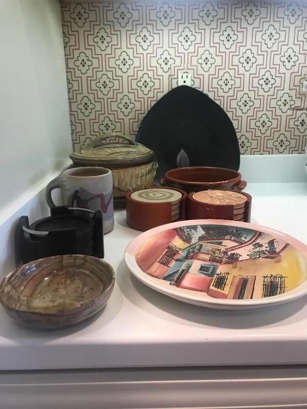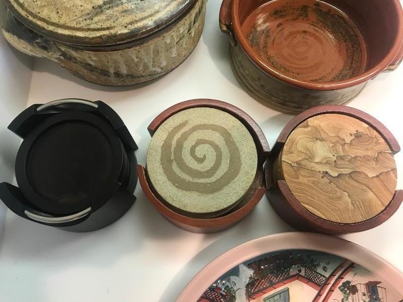 Pottery plate 10” in diameter signed Alvarez Collection March 6, 1988, Pottery bowl with lid measures 7-1/2” in diameter and 4” deep signed Mud Duck Nc, small marble bowl, pottery coffee mug, Black pottery triangular plate, set of 4 stone coasters with holder and set of 5 wood coasters with holder