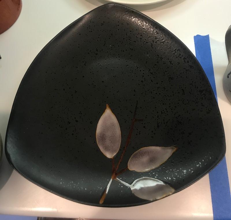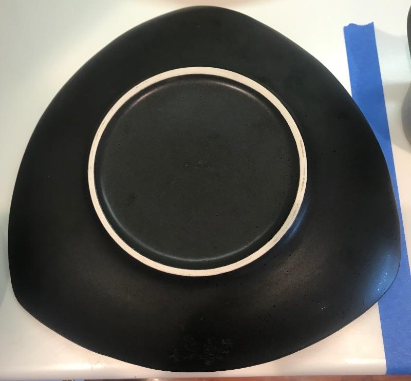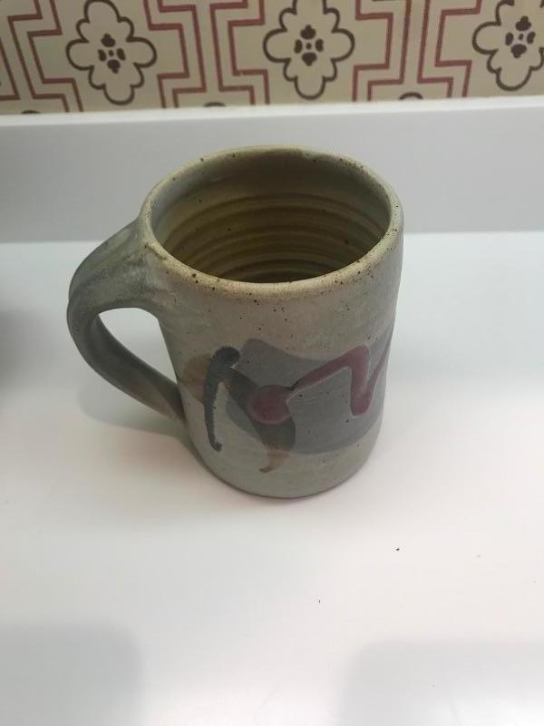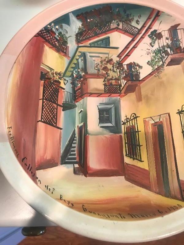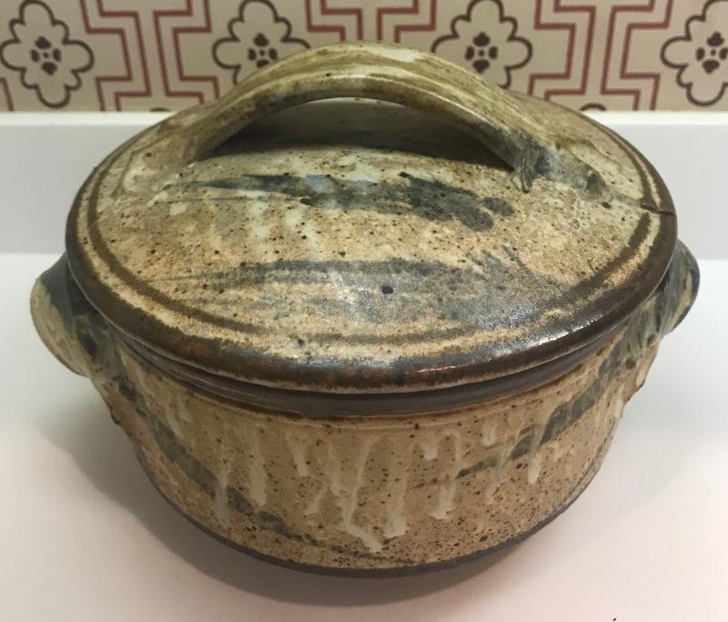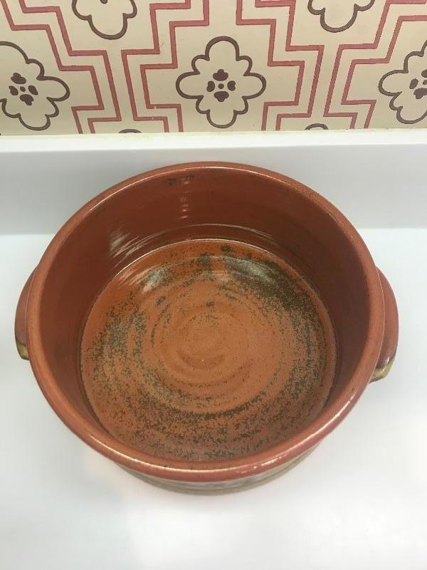 Pottery plate 10” in diameter signed Alvarez Collection March 6, 1988, Pottery bowl with lid measures 7-1/2” in diameter and 4” deep signed Mud Duck Nc, small marble bowl, pottery coffee mug, Black pottery triangular plate, set of 4 stone coasters with holder and set of 5 wood coasters with holder