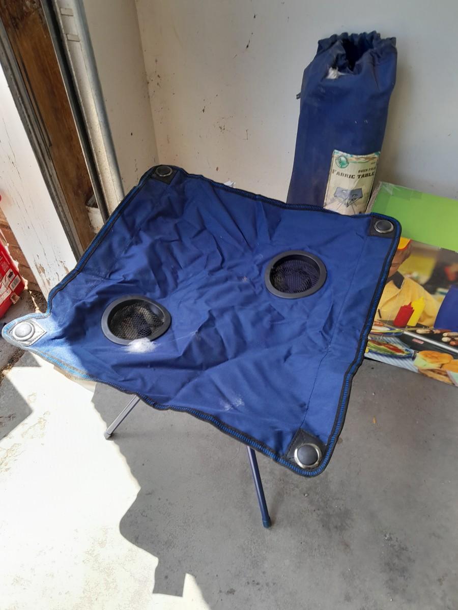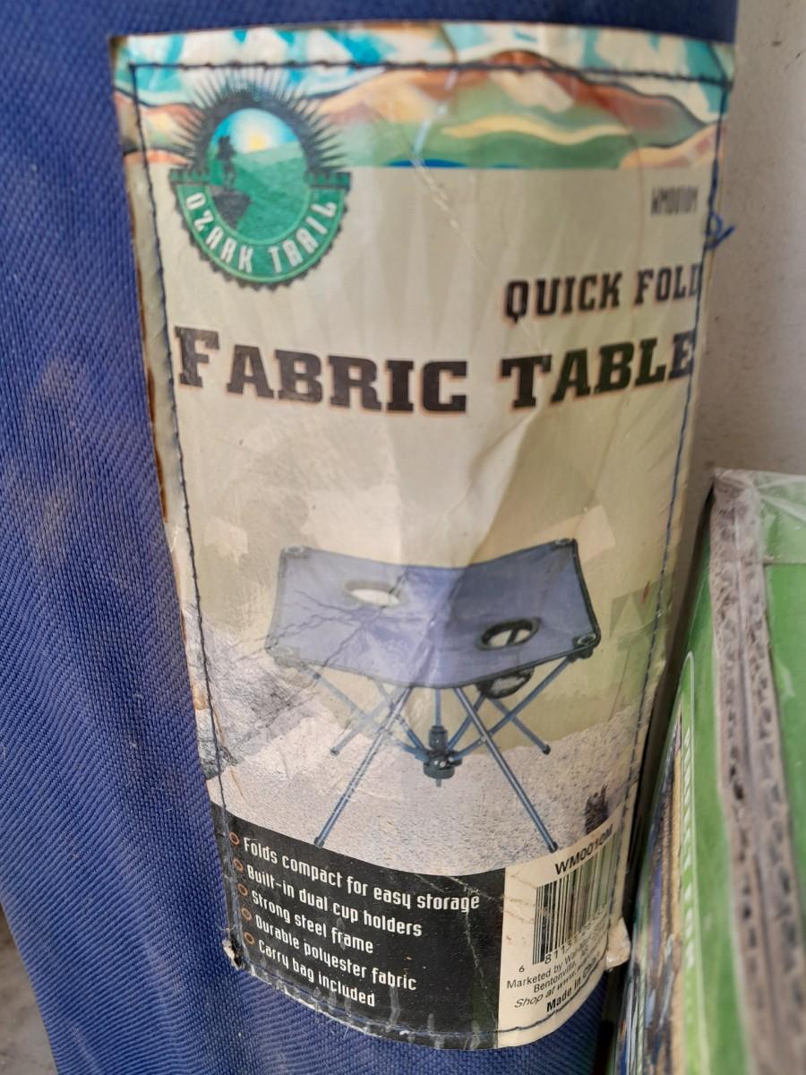 COLEMAN GAME GRILL, PROPANE LANTERN, WITH TWO PROPANE CANISTERS, AND FOLD UP, CANVAS TABLE