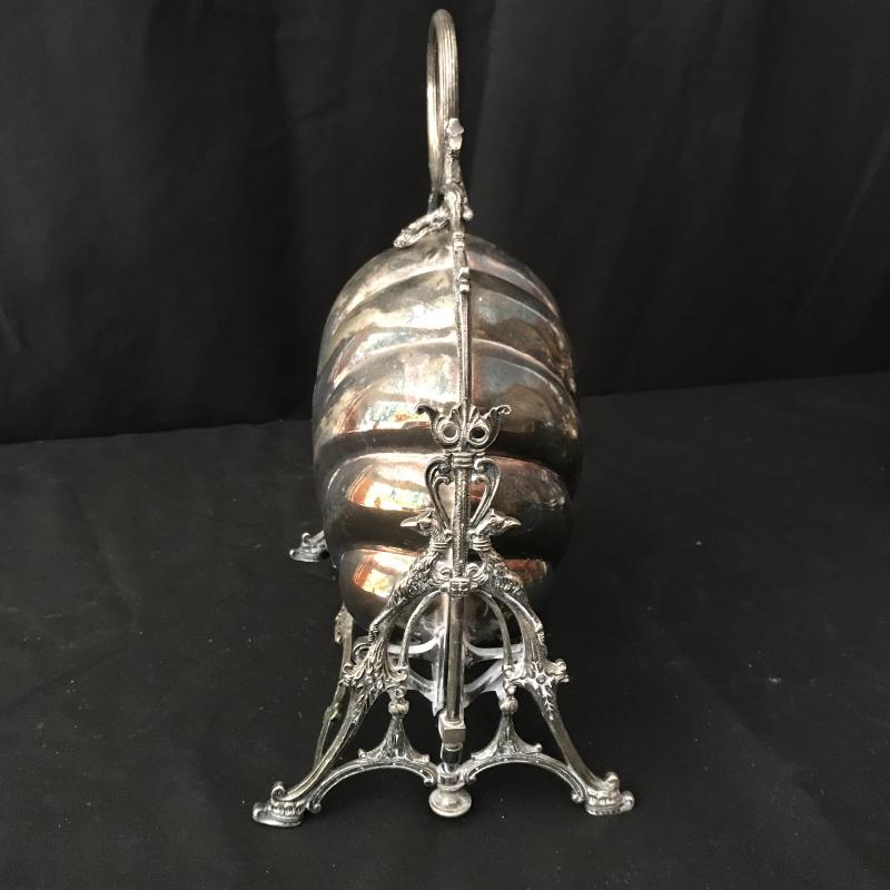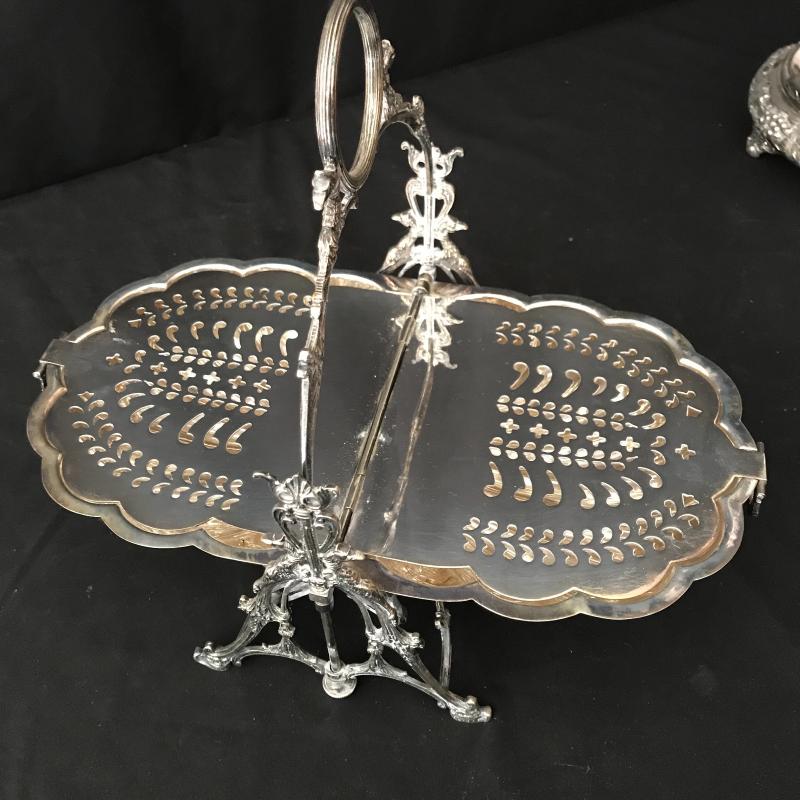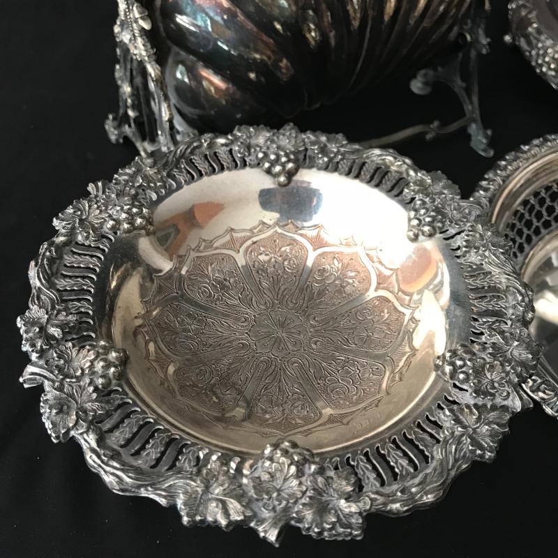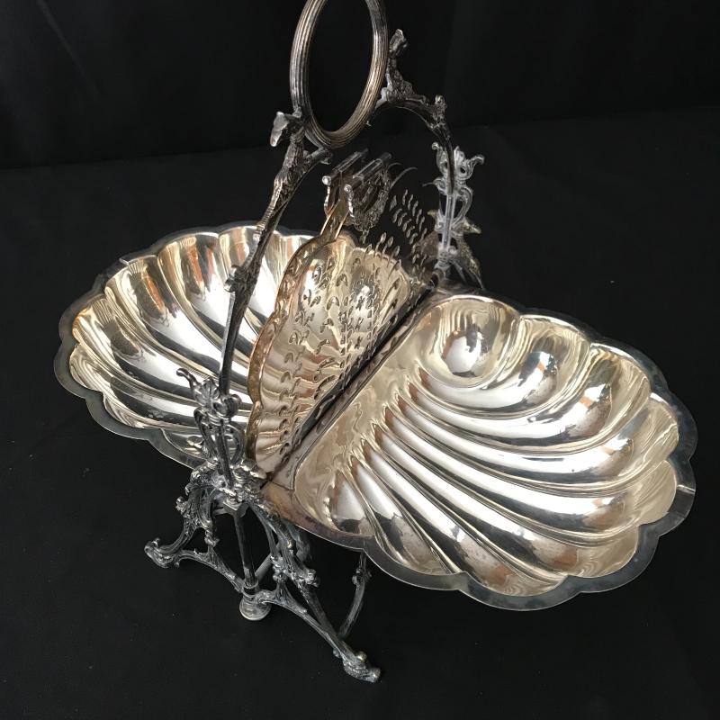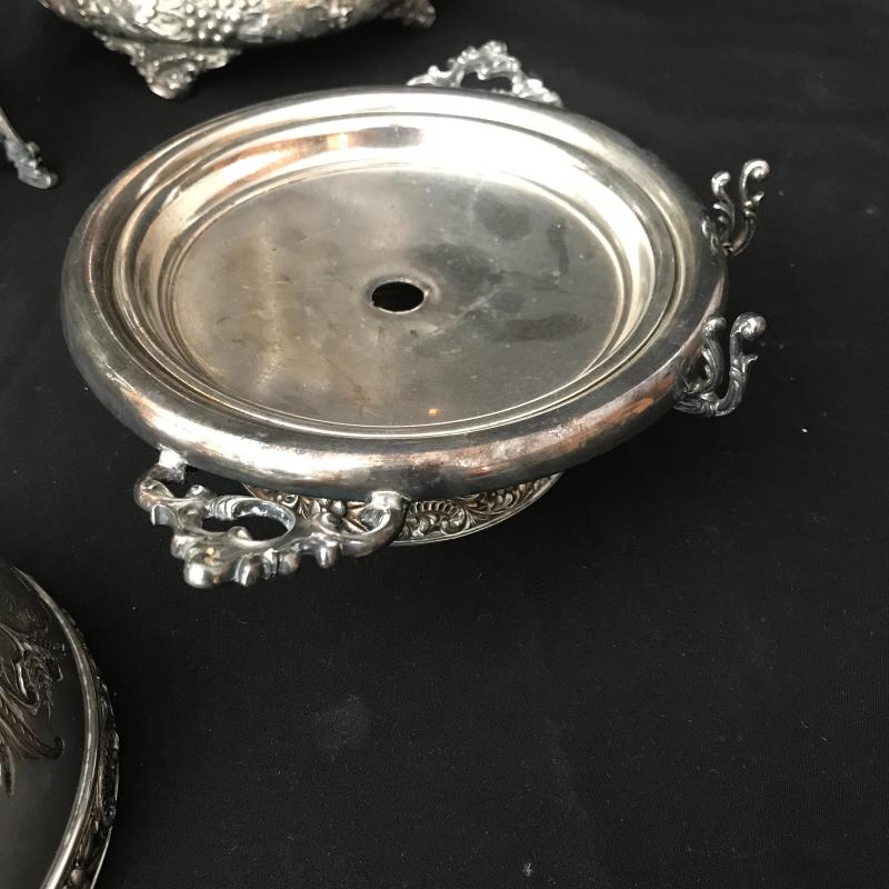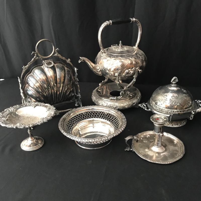 Lot full of ornate silverplated serving pieces, see photos. Elegant clam serving piece is a definite conversation starter. Knife pictured to display piece’s potential, not included. Chippendale piece is silver with a brass removable top to make the perfect flower arrangement. Teapot with base for sterno measures approx. 12.5x10.5”. Shipping available, please call UPS for a quote prior to bidding.