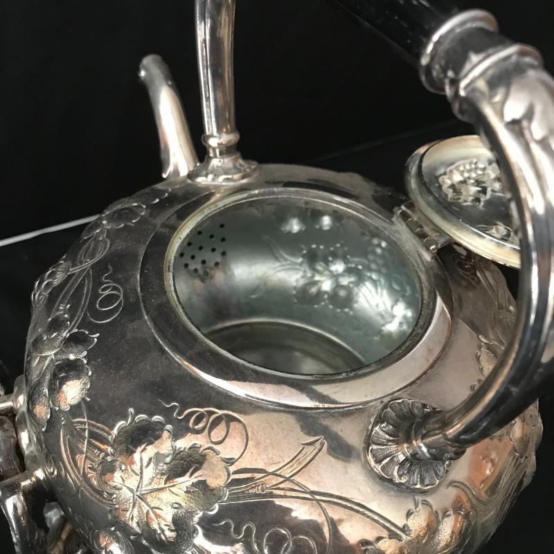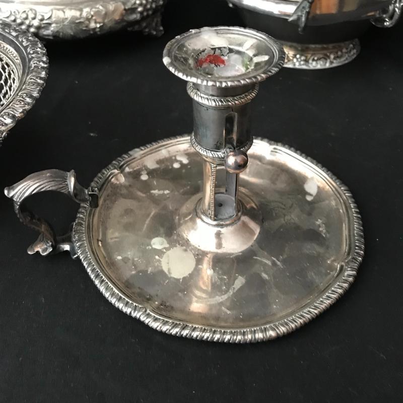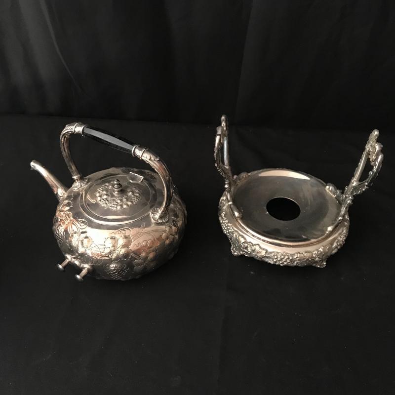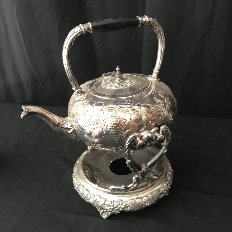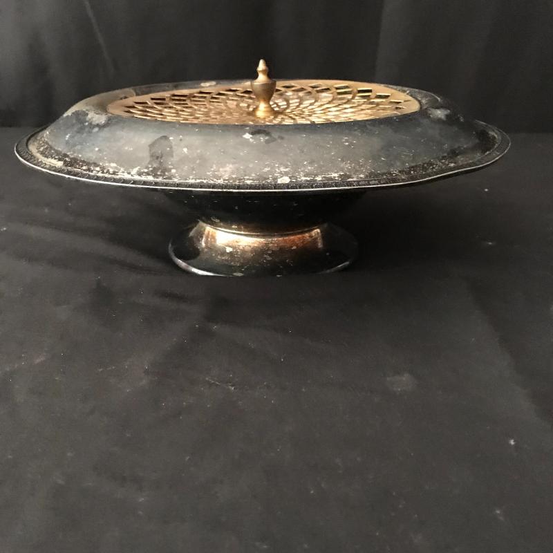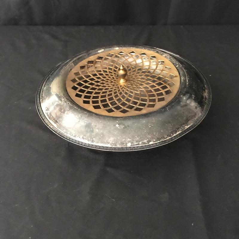 Lot full of ornate silverplated serving pieces, see photos. Elegant clam serving piece is a definite conversation starter. Knife pictured to display piece’s potential, not included. Chippendale piece is silver with a brass removable top to make the perfect flower arrangement. Teapot with base for sterno measures approx. 12.5x10.5”. Shipping available, please call UPS for a quote prior to bidding.