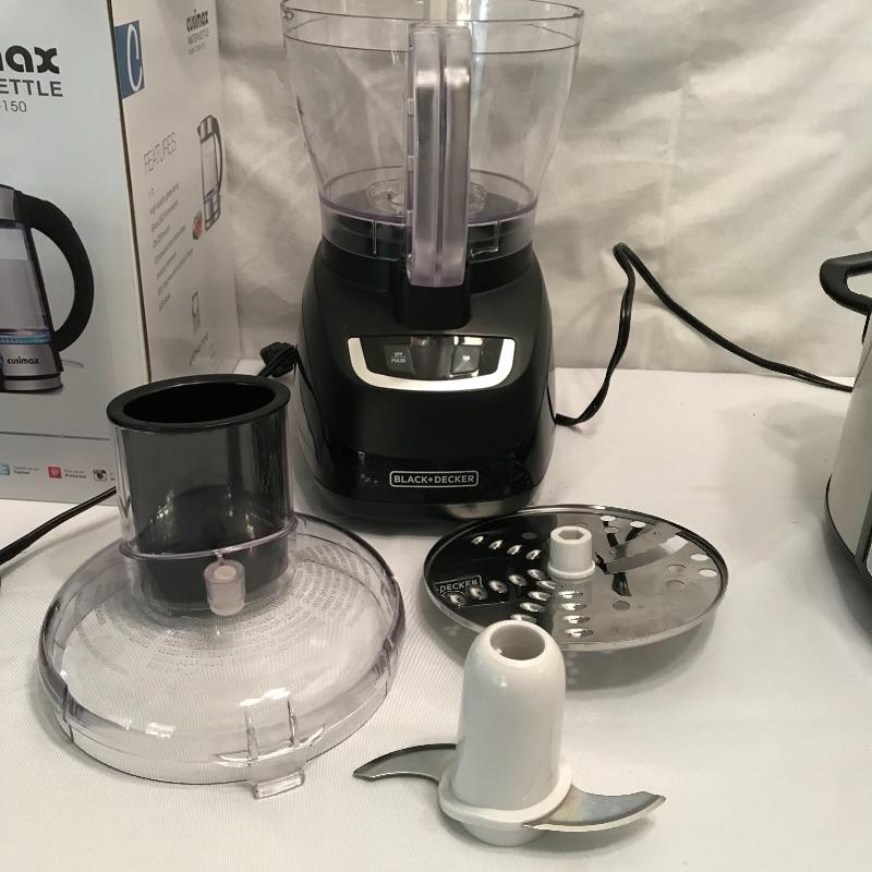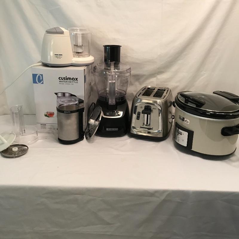 Here’s a great mix of items to make cooking fun and easy! A new in box Cusimax electric water kettle, a small 2-cup and a large 8-cup Black+Decker food processors, an Oster toaster, a Krups coffee grinder and last but not least, a like new digital Crock Pot. All items worked when tested, we did not test the Cusimax as it is still in original packaging. See photos for model numbers. Local pick up only.