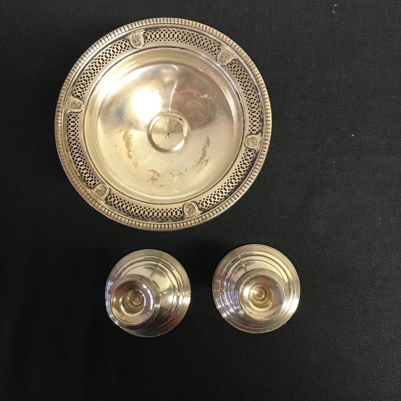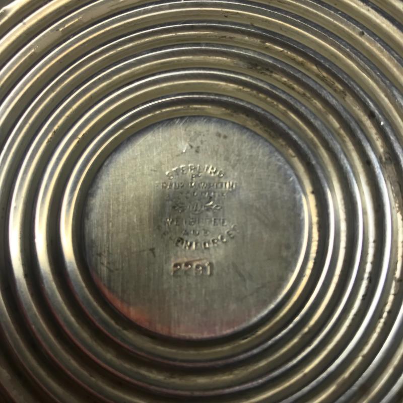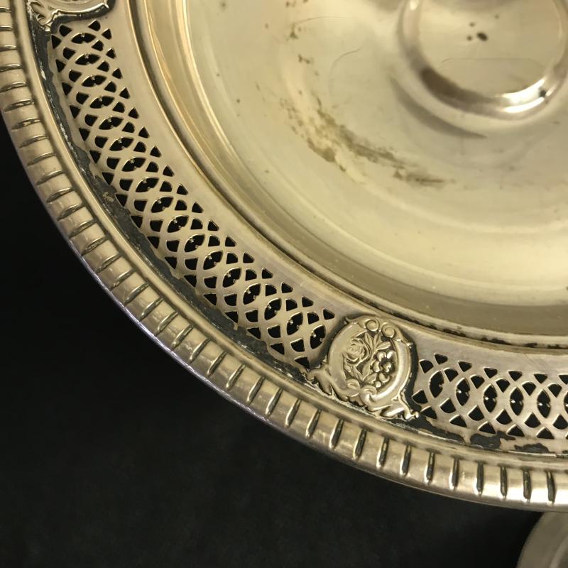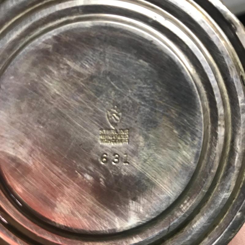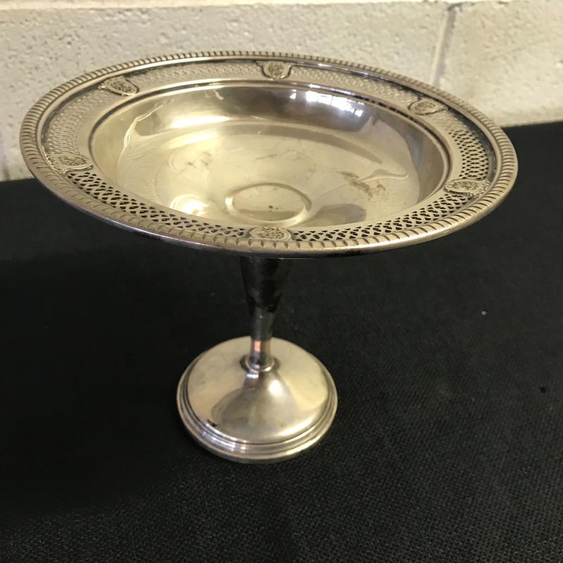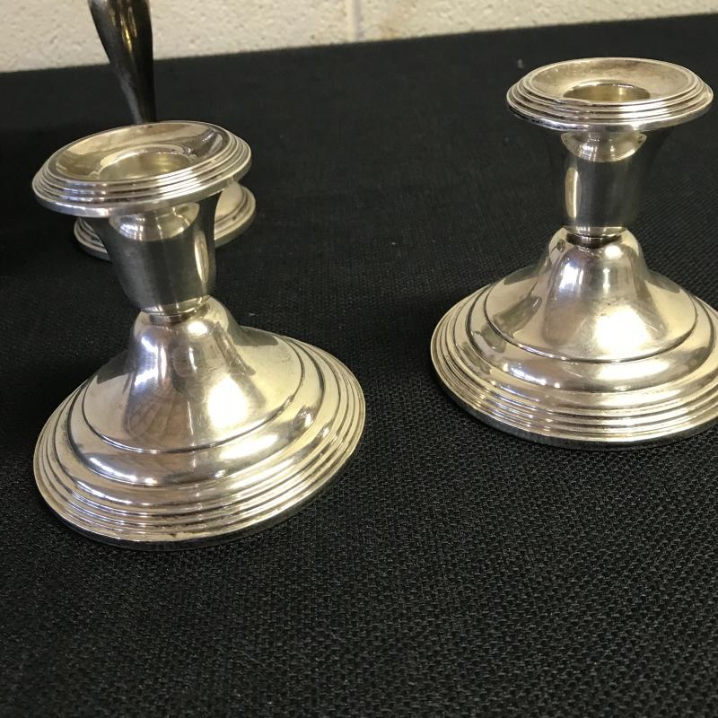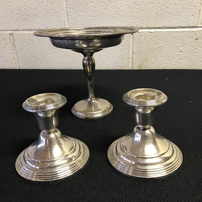 Two weighted candlestick holders and a weighted stem dish. Total weight is 40.5 oz. All three pieces are marked sterling and the bowl measures 6” tall. Lot is available for shipping or local pick up in Asheville, NC. Please note, reserve price is approximate melt value.