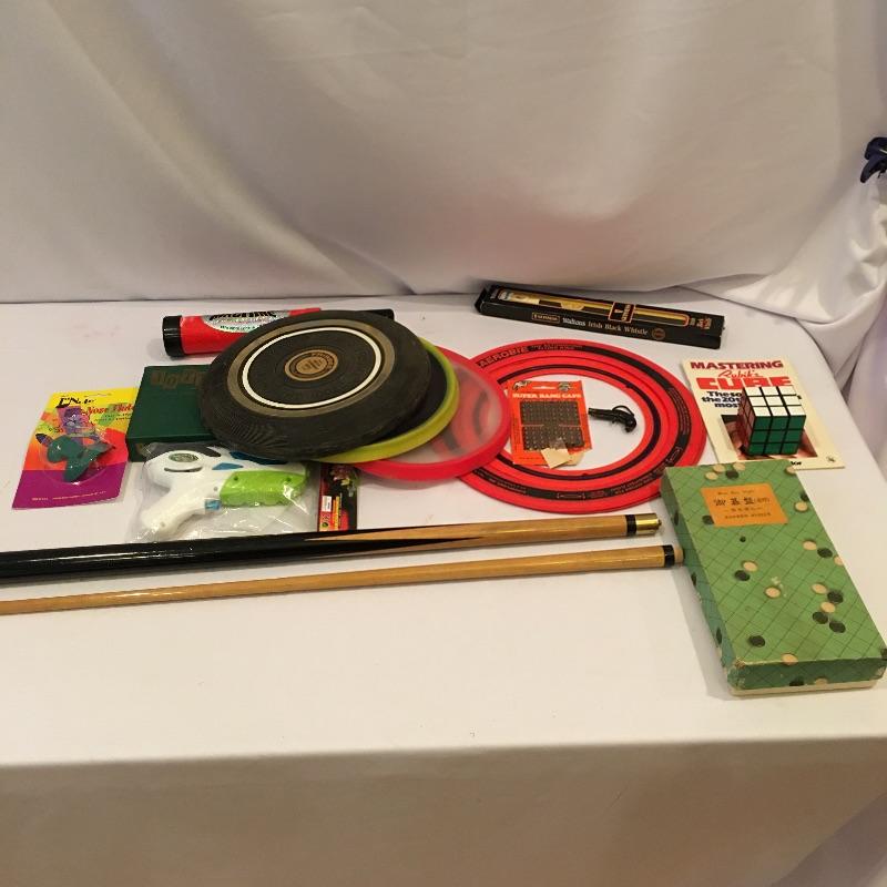Toys and games includes Rubik’s cube, Jotto, Frisbees, water guns, cap gun, two piece pool cue, flute and more. Get your game on with this selection of games and toys.