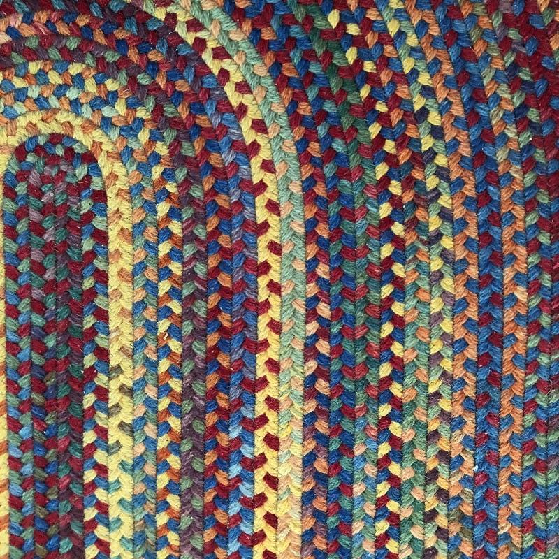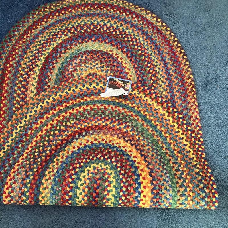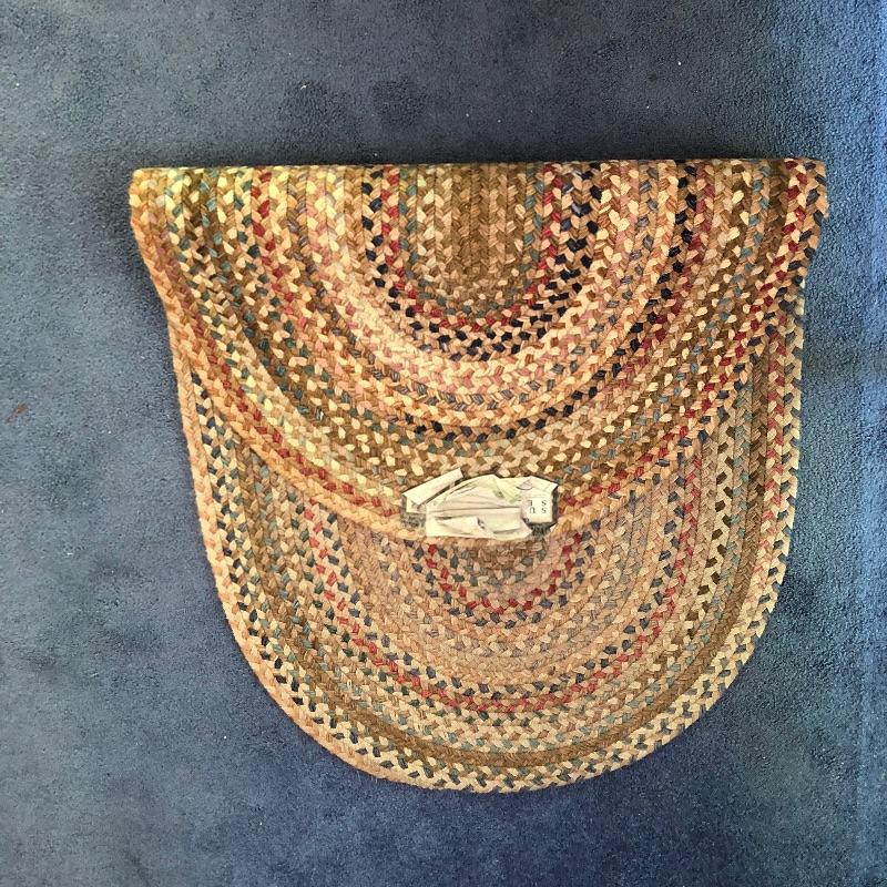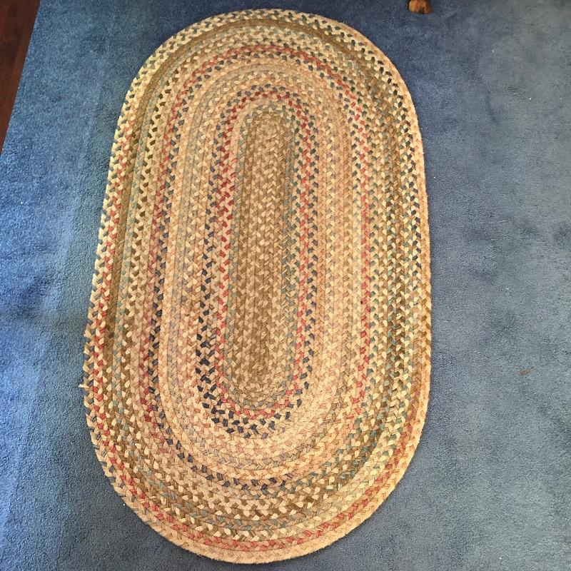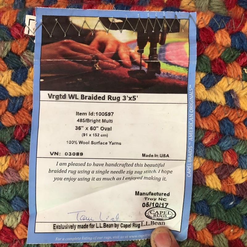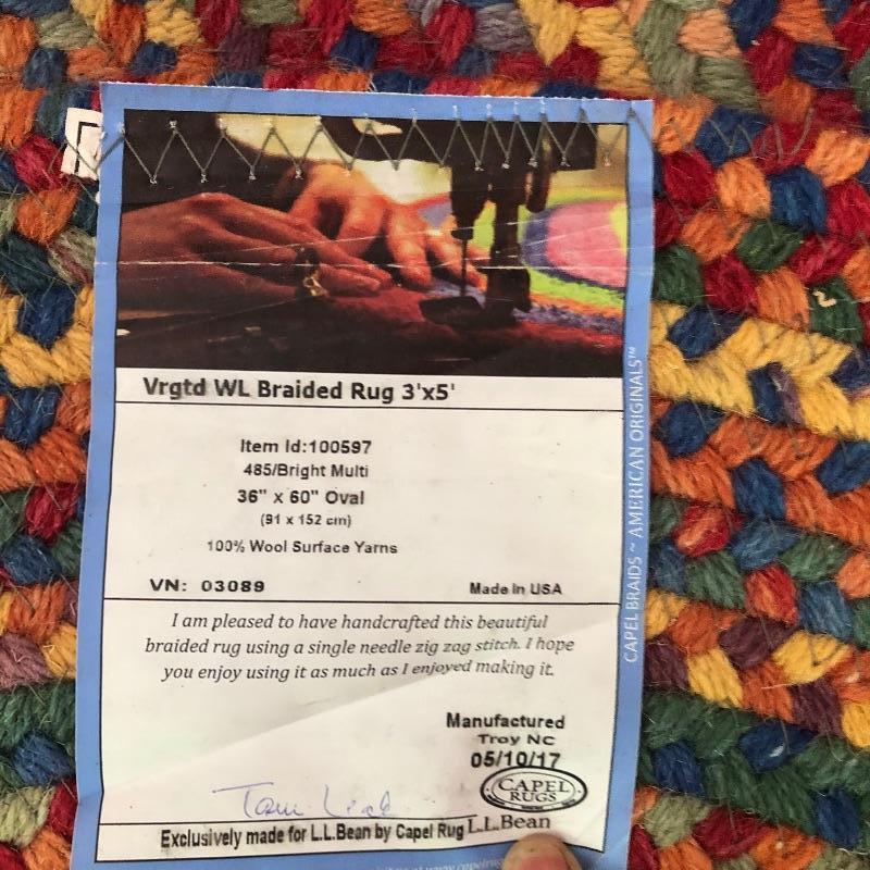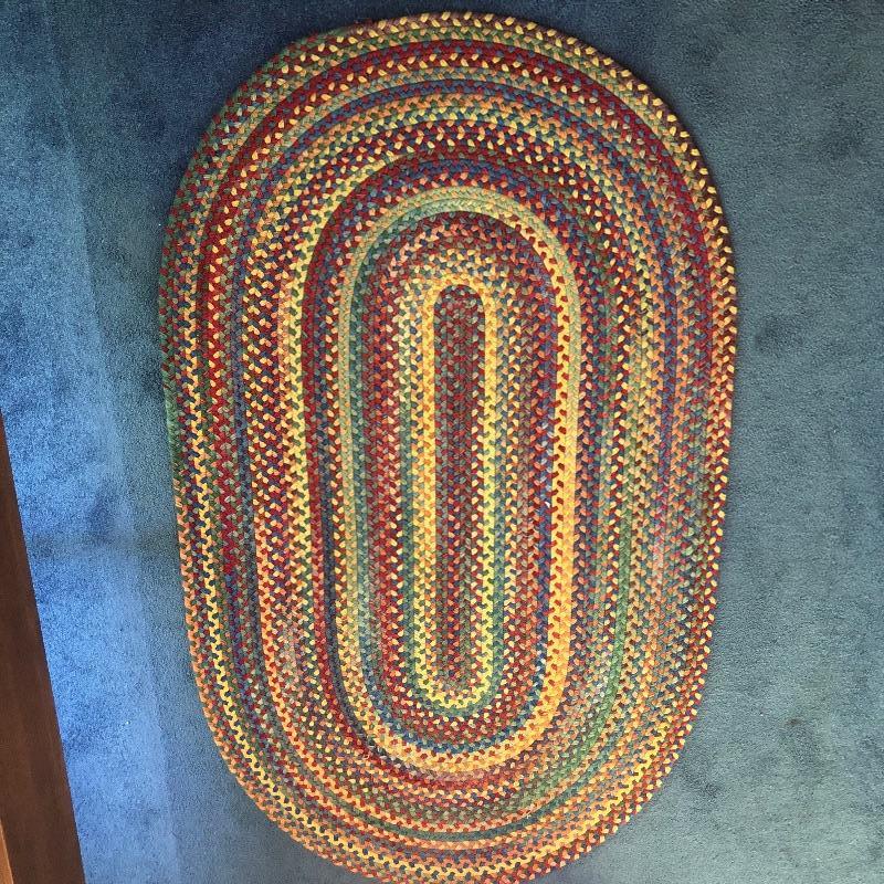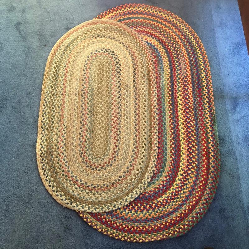 Both of these handcrafted rugs were made here in N.C by Capel rugs with 100% wool surface yarns. The larger rug is the more colorful one with its bright multi colors that includes red, purple, orange and green colors. An oval shape that measures 3’ x 5’, it’s a handy size for most spaces. The slightly smaller rug has much earthier tones. It appears to have become somewhat paler, possibly slightly sun bleached but as it is reversible, the underside can be flipped if the buyer prefers the stronger colors over the more muted ones.