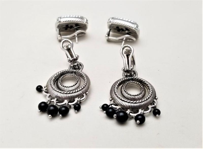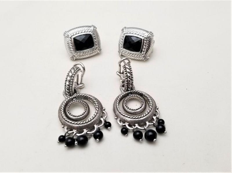 You get both pairs of earrings - the ones in the back are Judith Ripka sterling (signed) with faceted onyx and the ones in front are also sterling with removeable hoops. Square ones are .5" long, hoops are about 1.5". No boxes. Both in good condition.