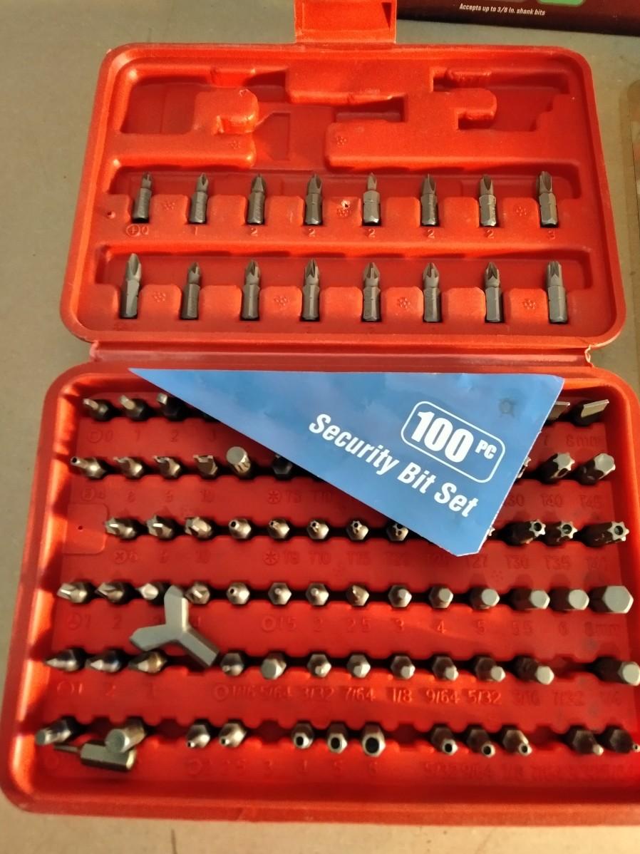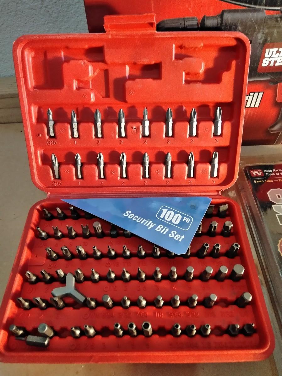 ULTRA STEEL 3/8" REVERSIBLE DRILL WITH 100 PIECE SECURITY BIT SET, AND SILVER BACK MAGNETIC GLOVES.